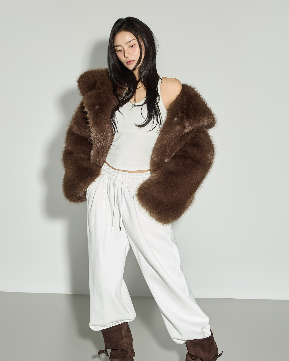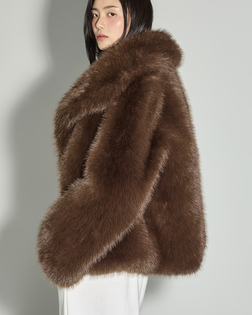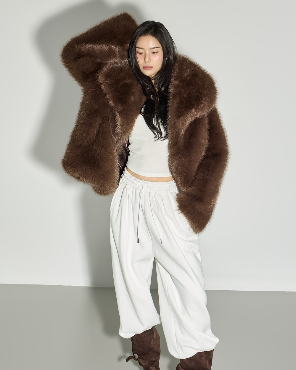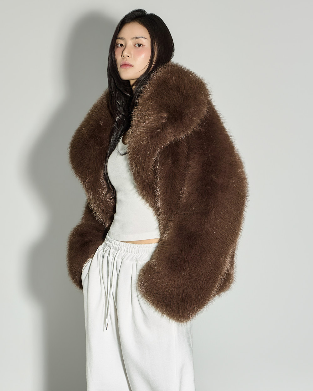 미니멀한 무드의 빅 카라 퍼 자켓이며,