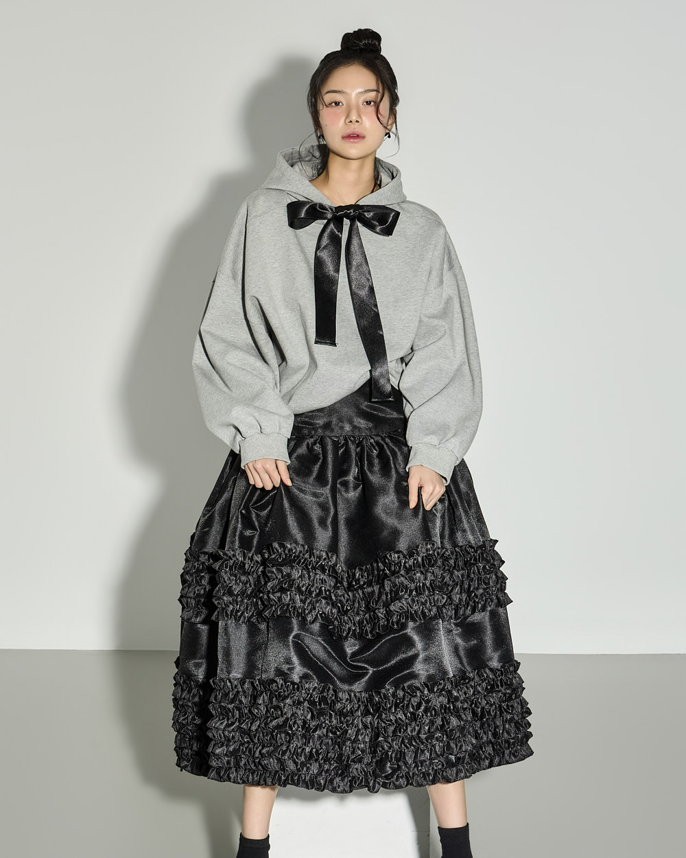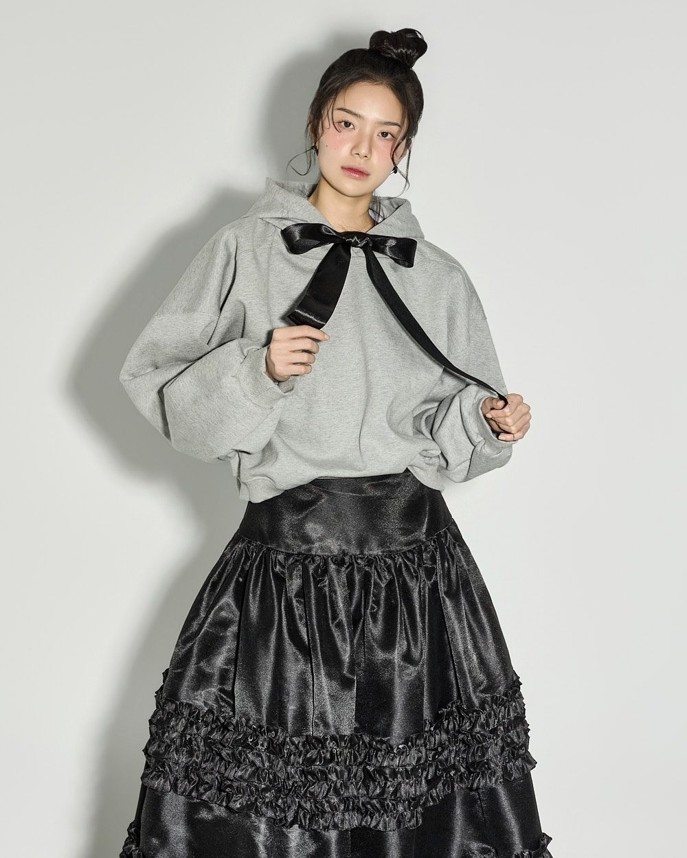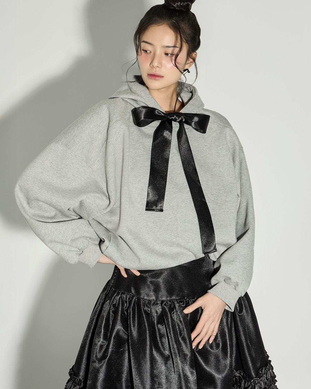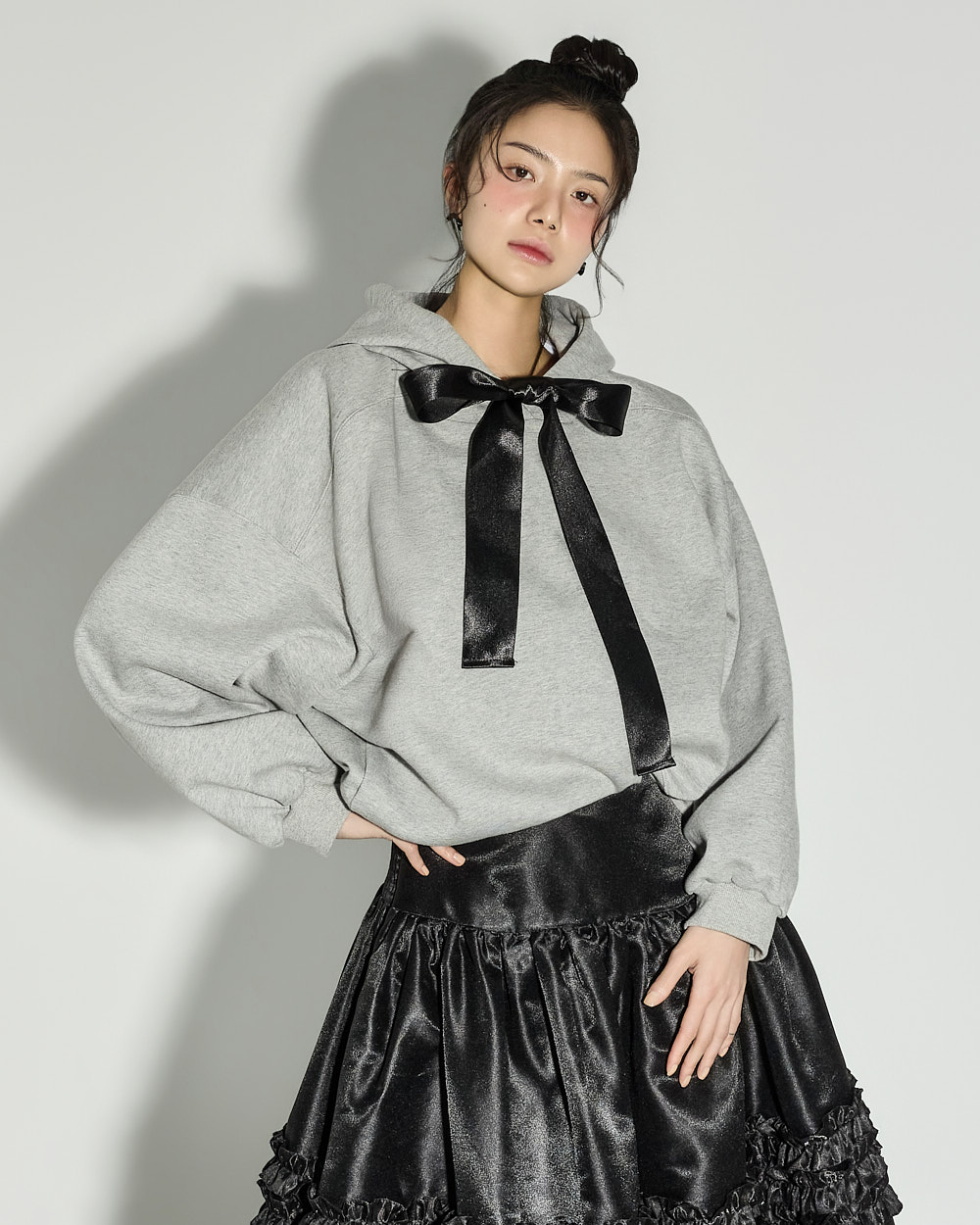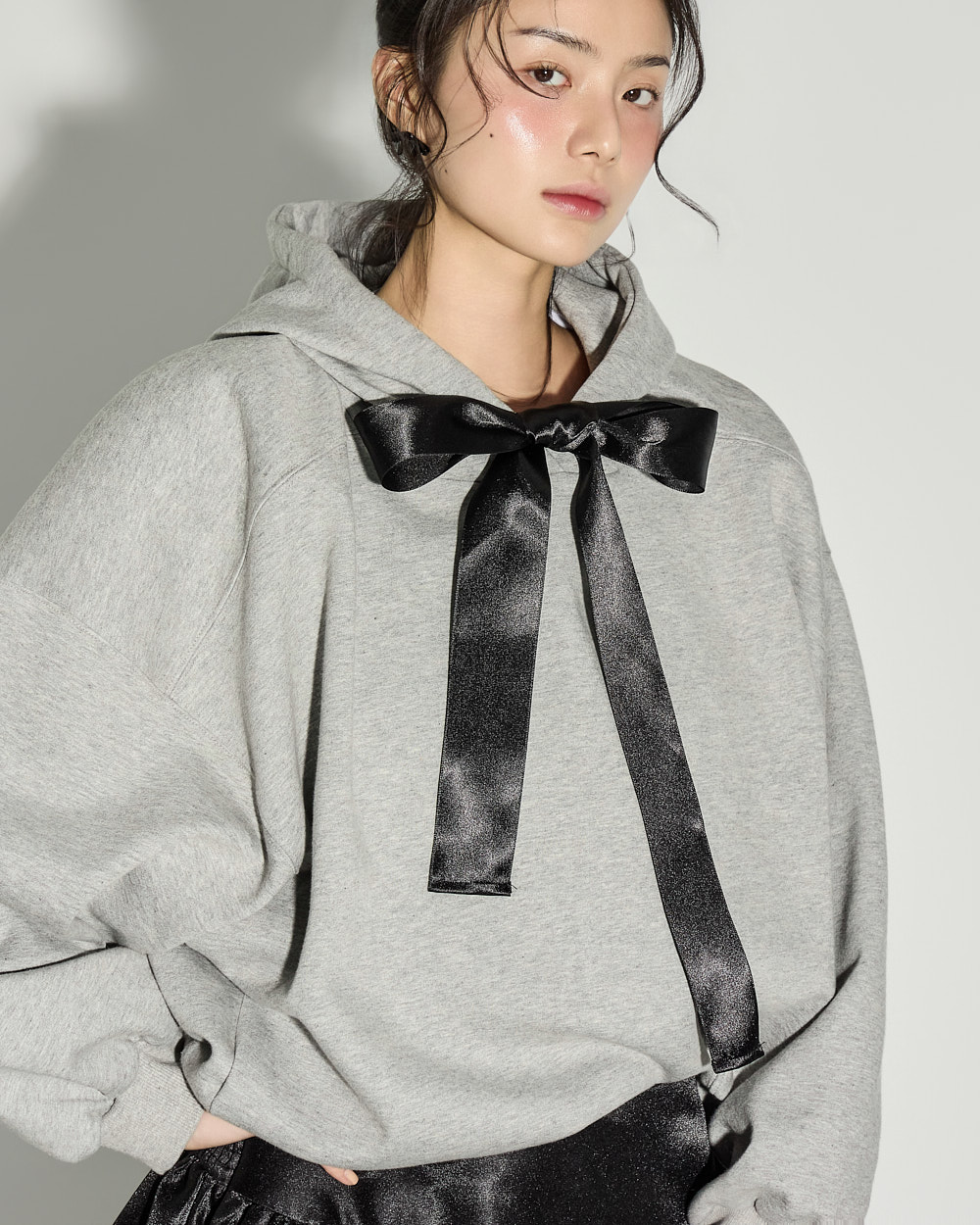 在基础连帽设计上加入缎面蝴蝶结细节,