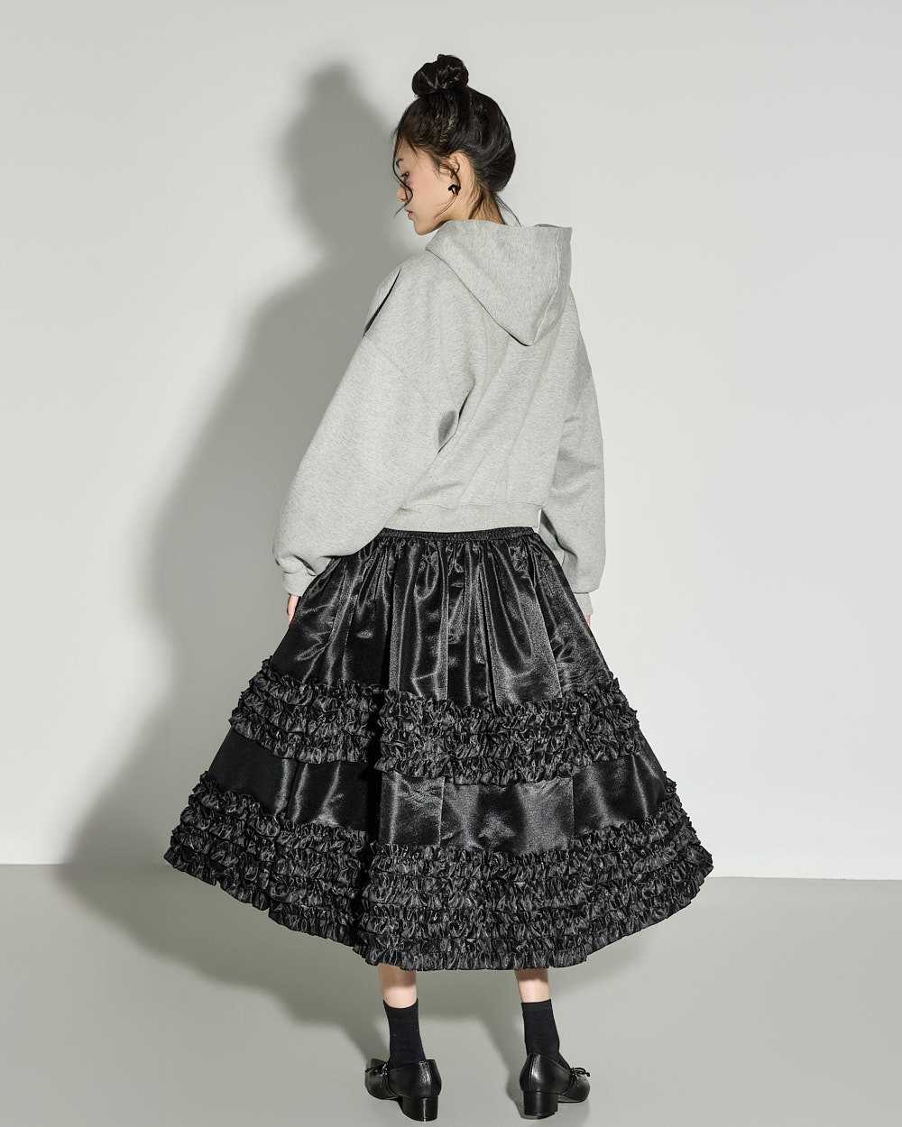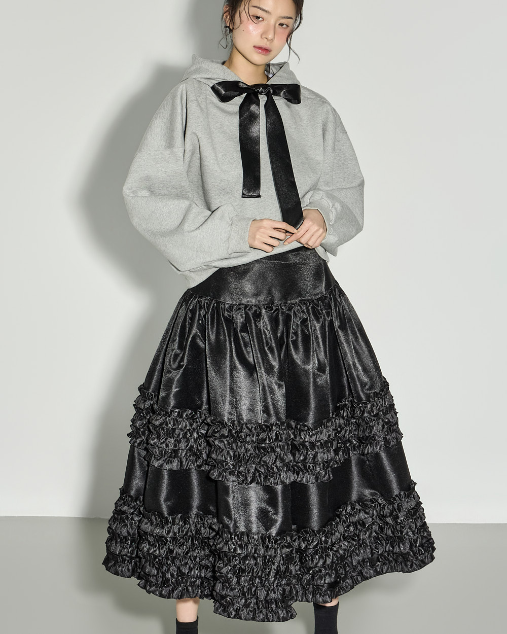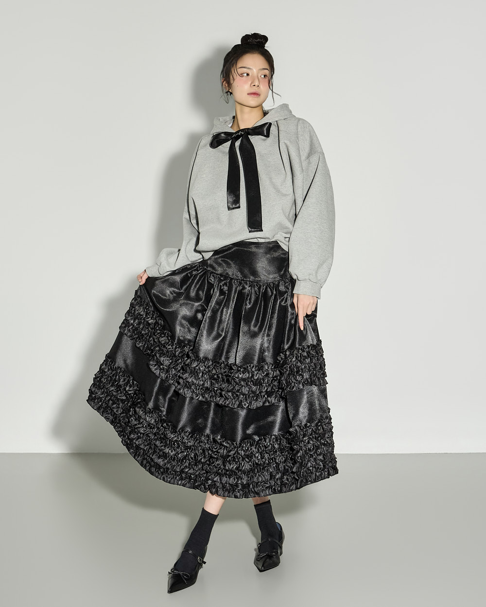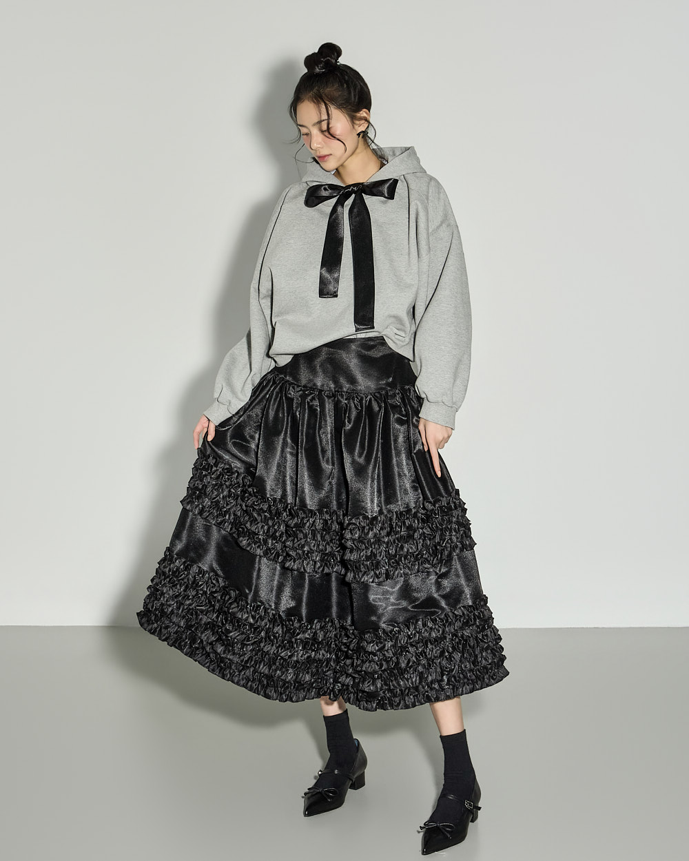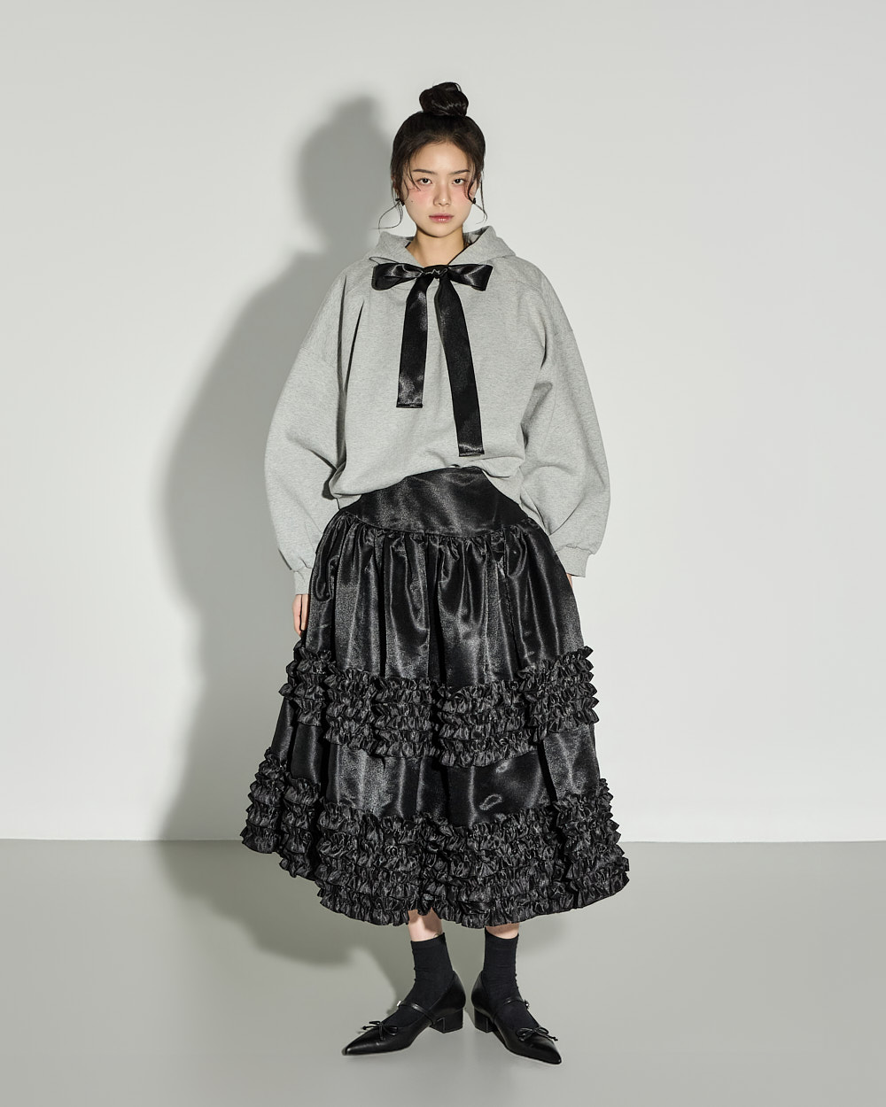 在基础连帽设计上加入缎面蝴蝶结细节,