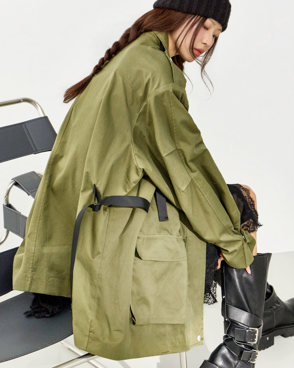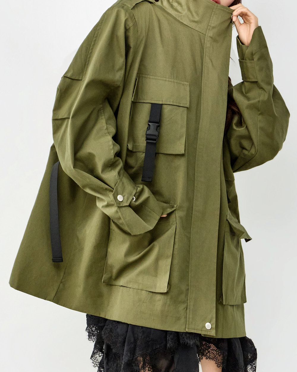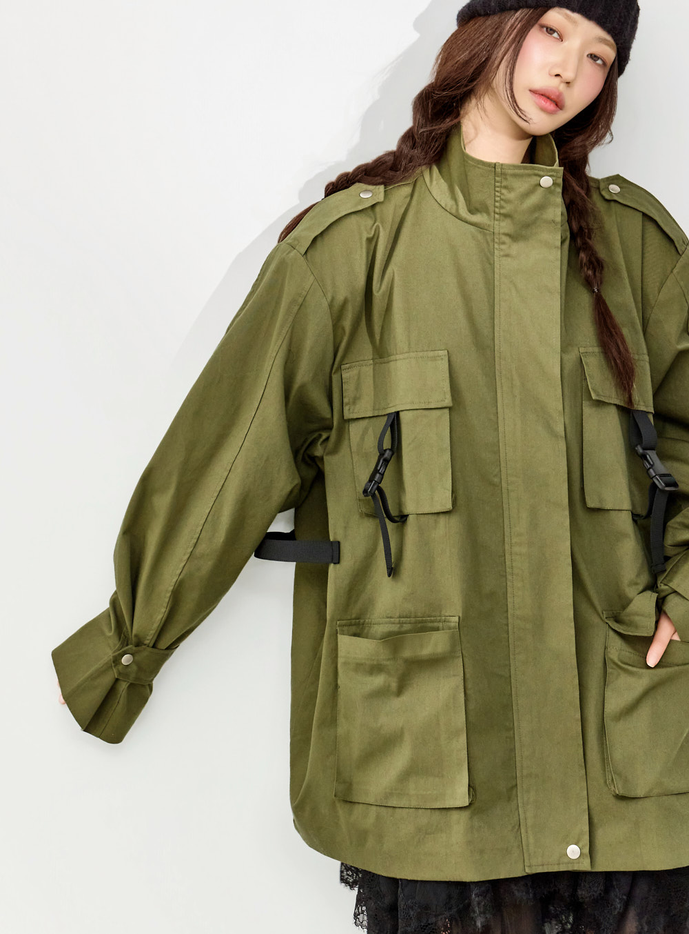 这是一款充满街头氛围的军装风夹克。 可与连衣裙混搭,打造干练的休闲造型,或以中性工装风格进行搭配,是一款非常适合造型的外套单品。 不刻意定型的宽松廓形,结合复古的军事风格,呈现自然又有型的街头感。 高领设计、肩部肩章以及腰线扣环细节作为点缀,正面拉链与按扣开合,搭配四个口袋设计,进一步提升实用性。 采用棉质面料制作,ONE 尺码设计,可宽松穿着。 171CM 模特穿着 ONE 尺码,KHAKI 颜色。