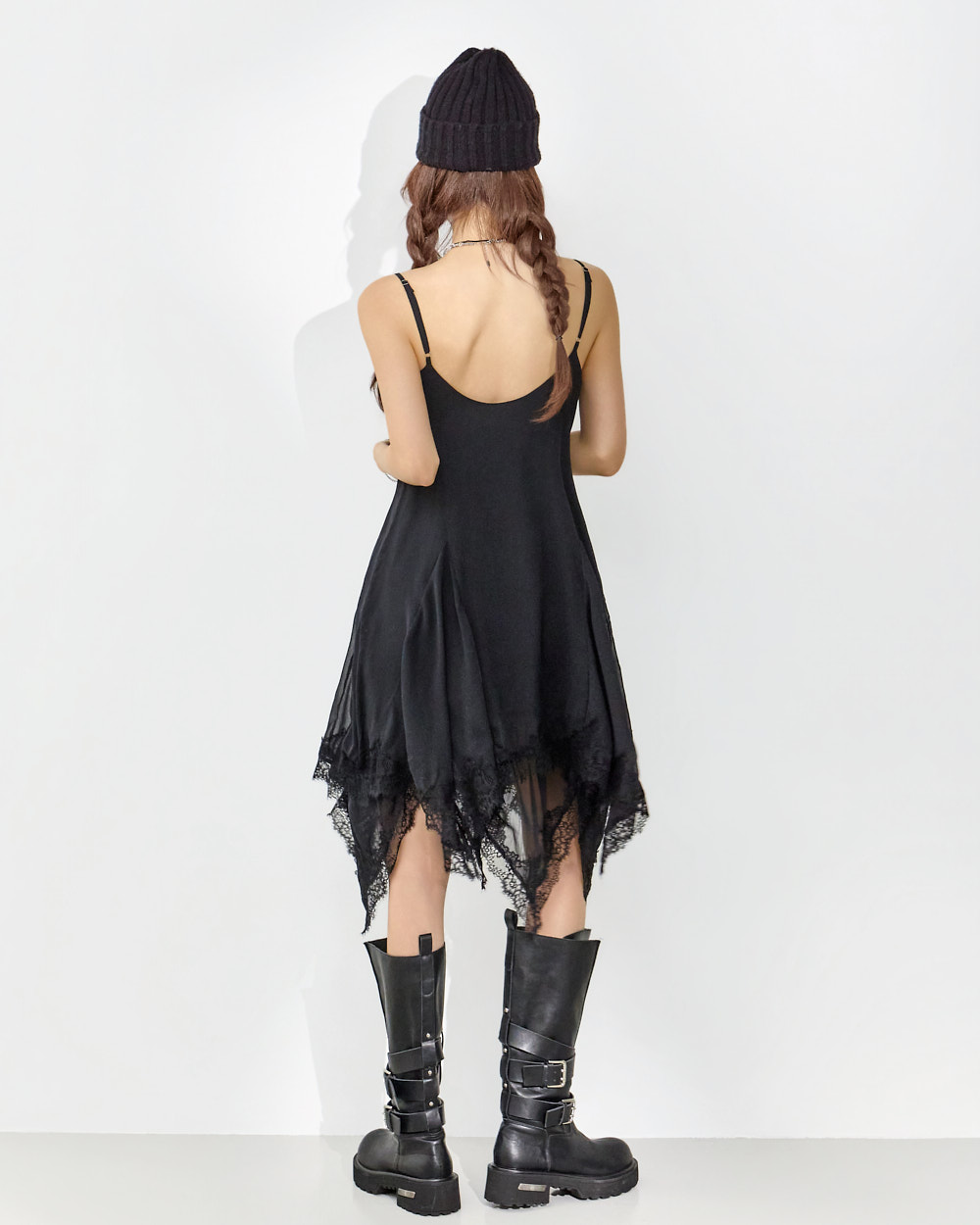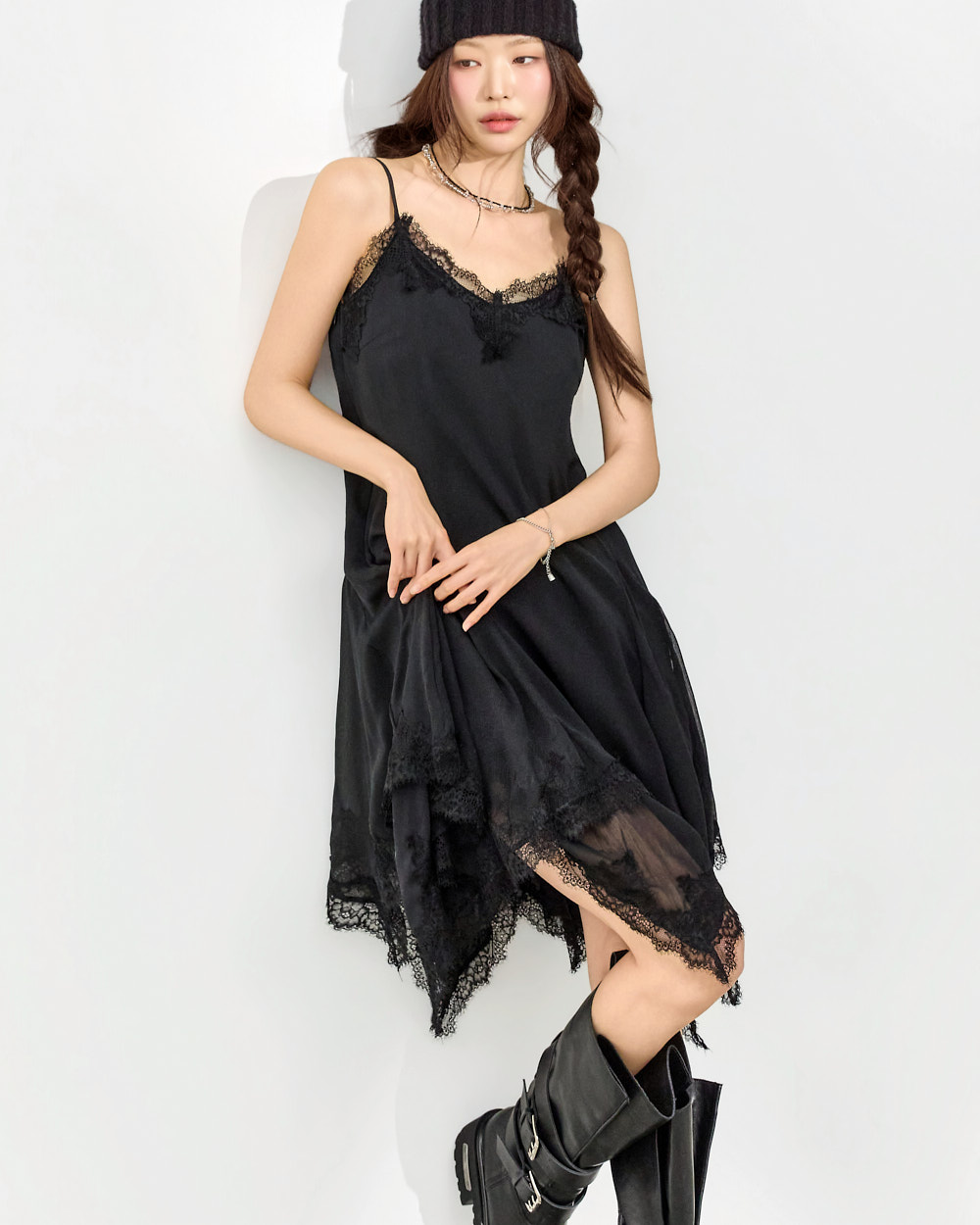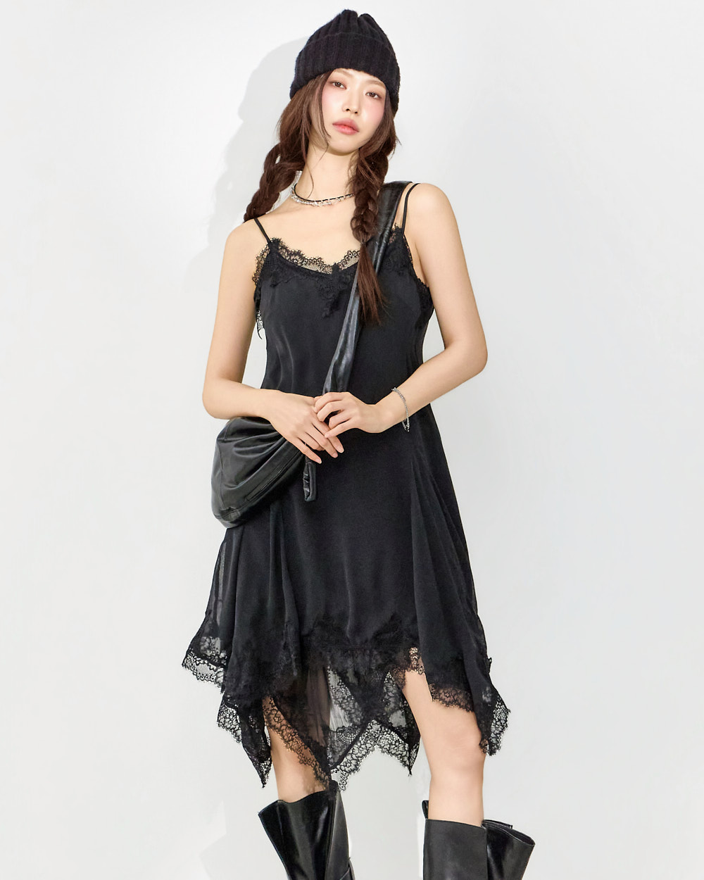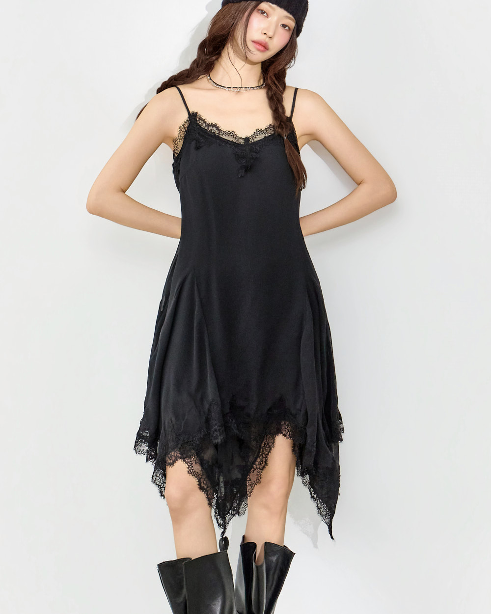 干练的吊带裙廓形搭配蕾丝下摆细节,