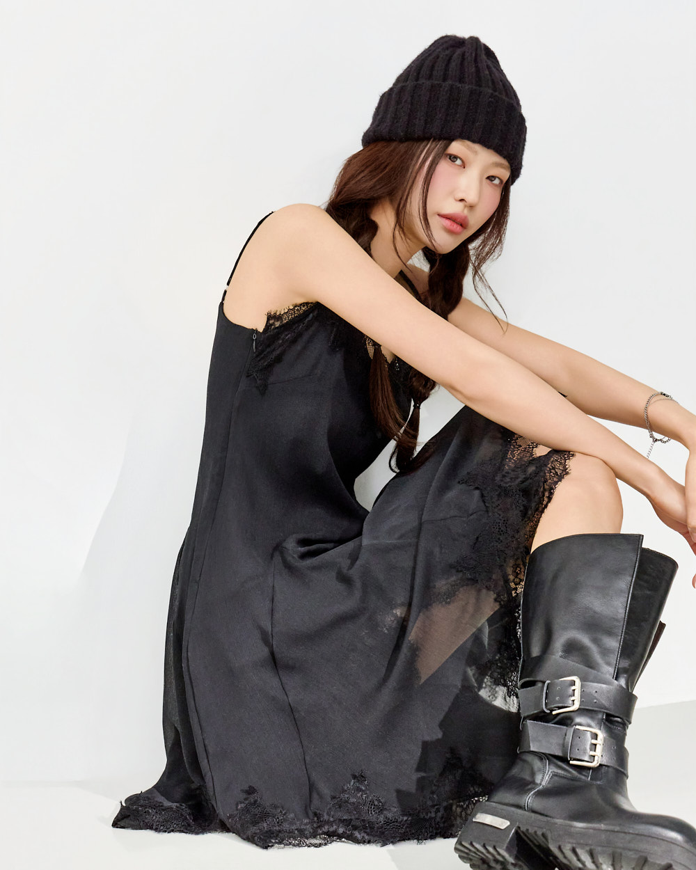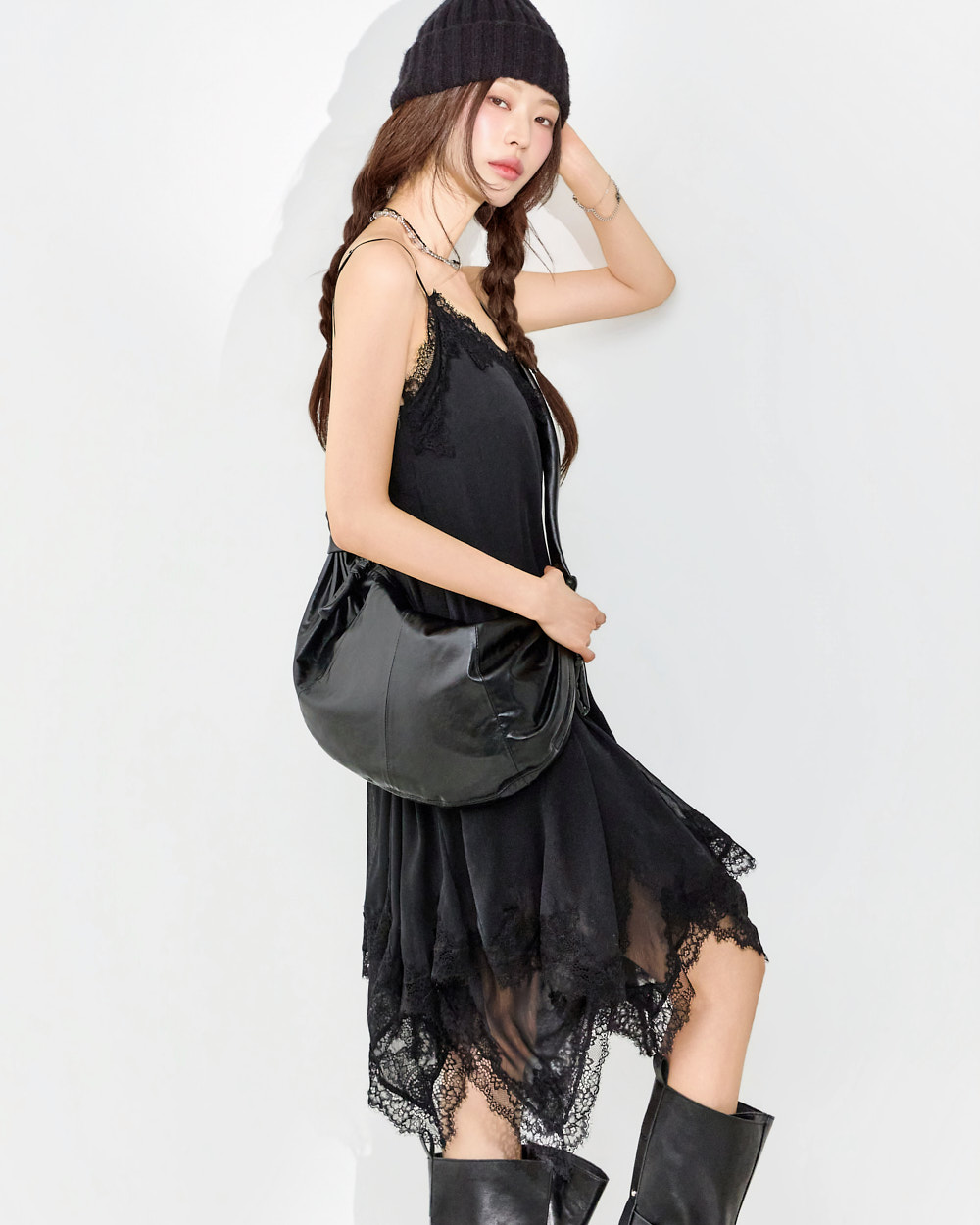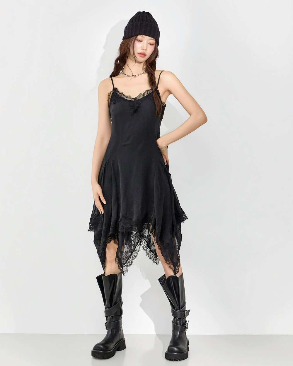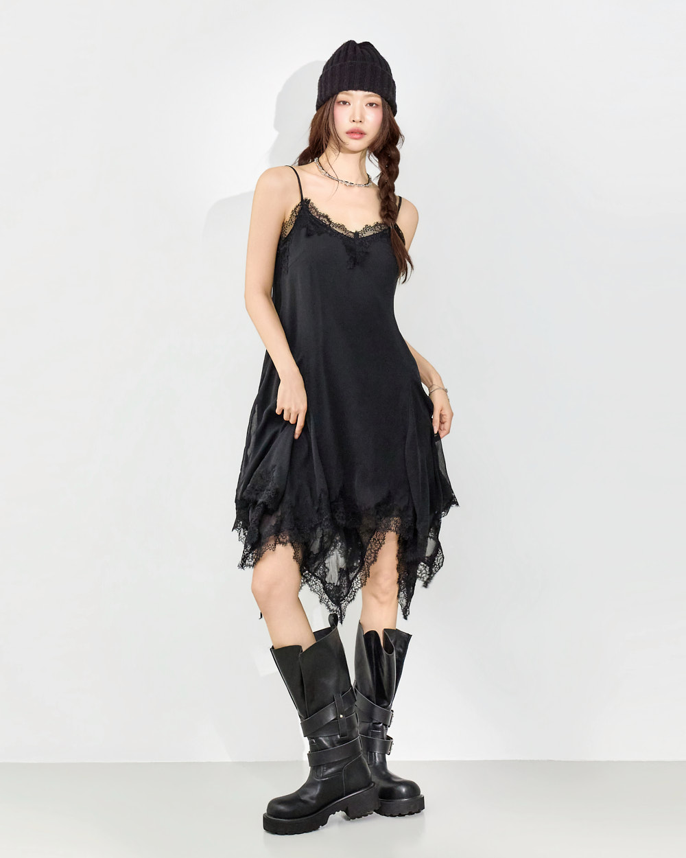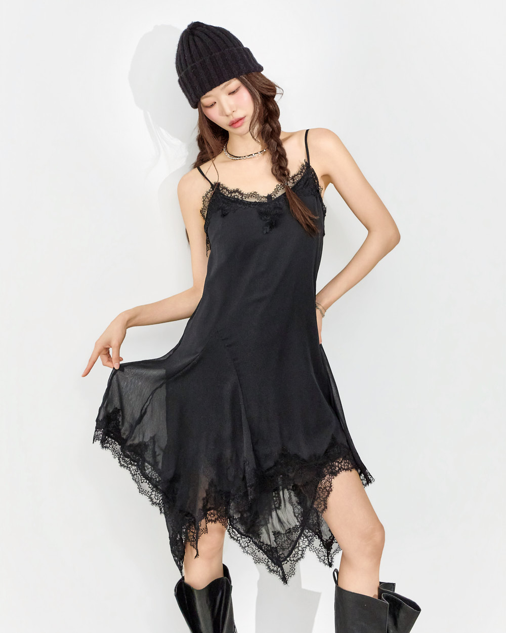 干练的吊带裙廓形搭配蕾丝下摆细节,