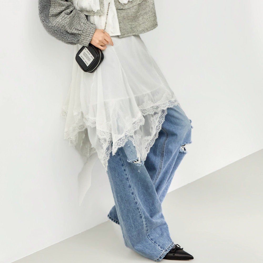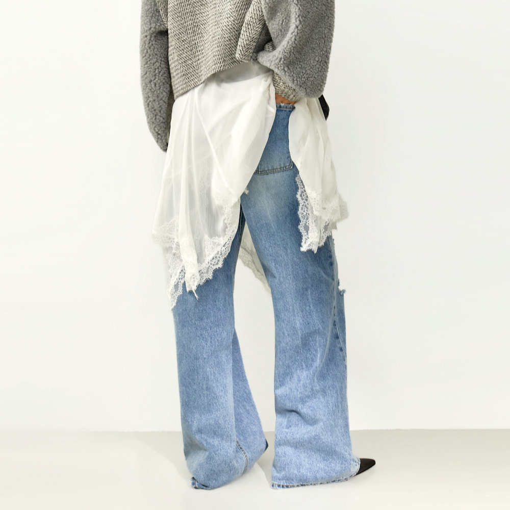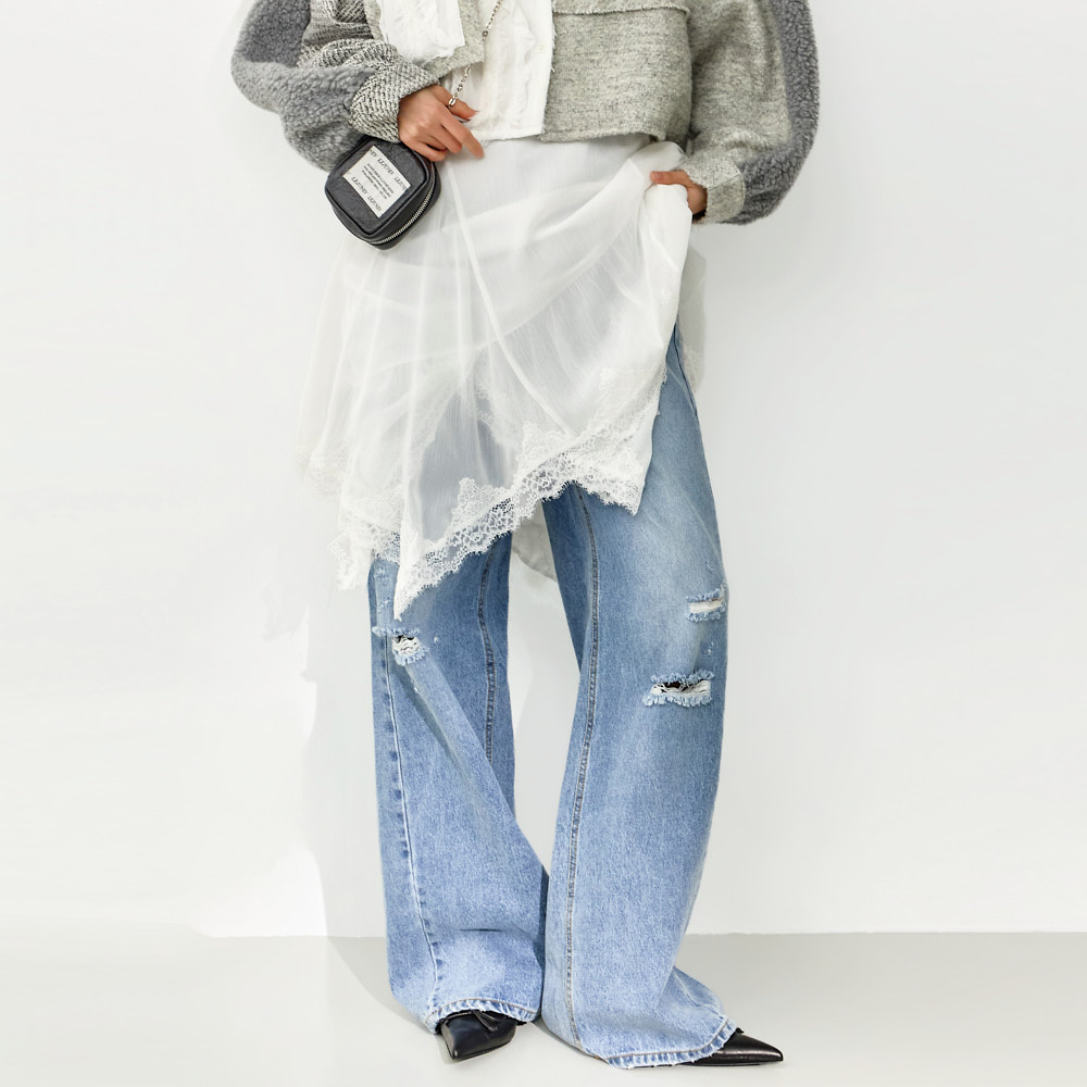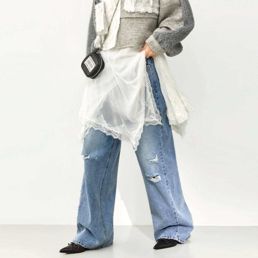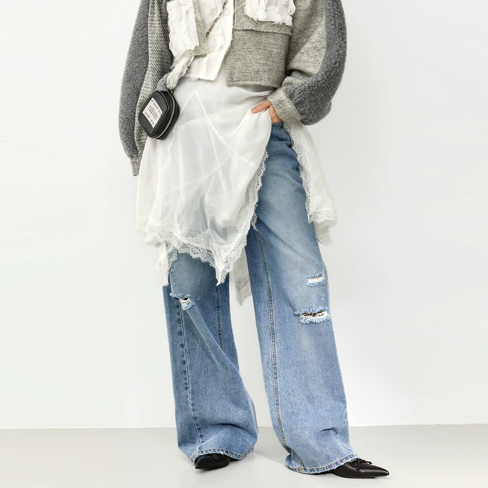 这是一款充满休闲氛围的低腰破洞牛仔裤。