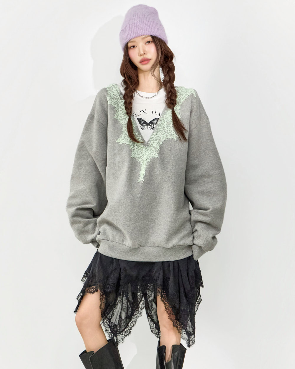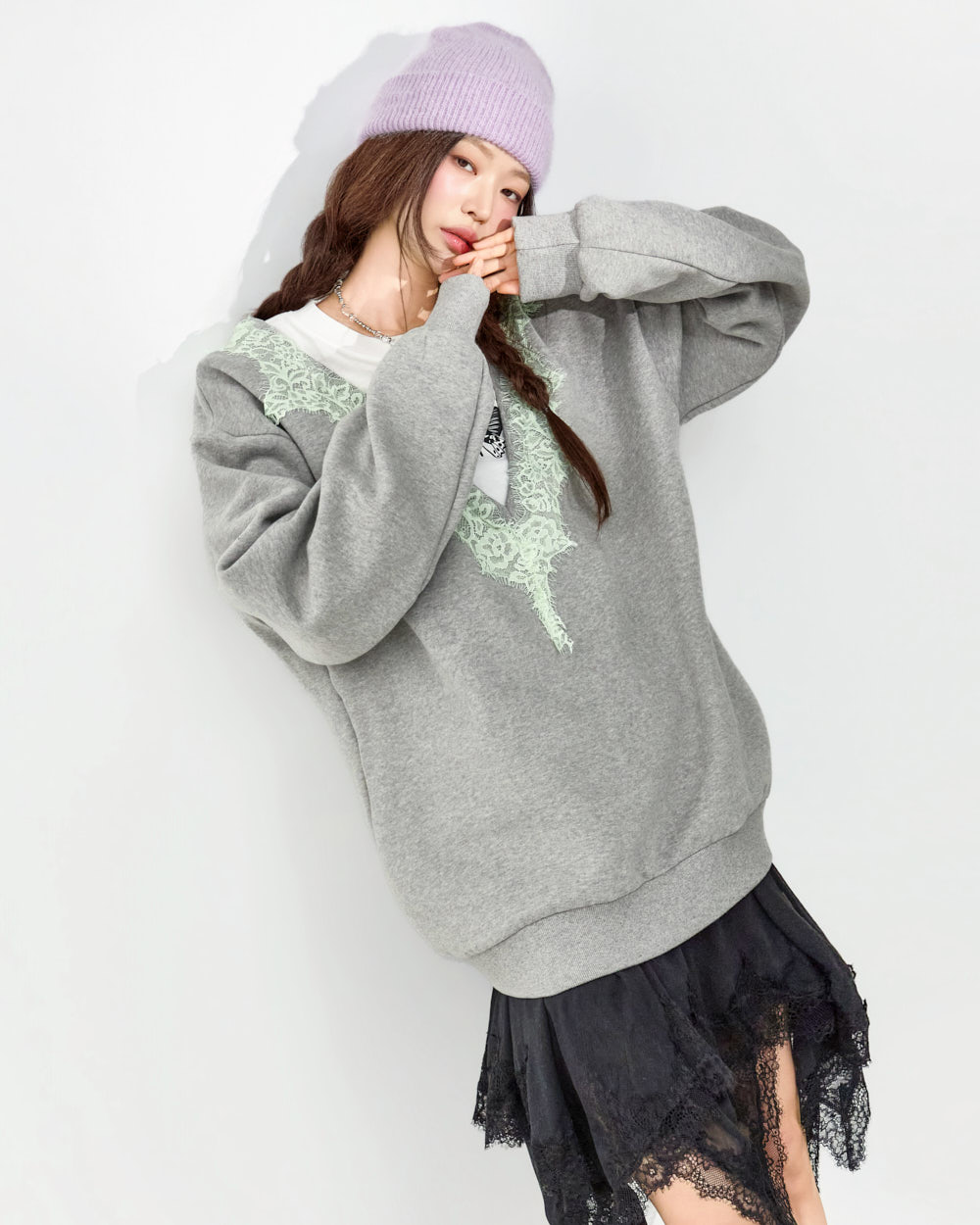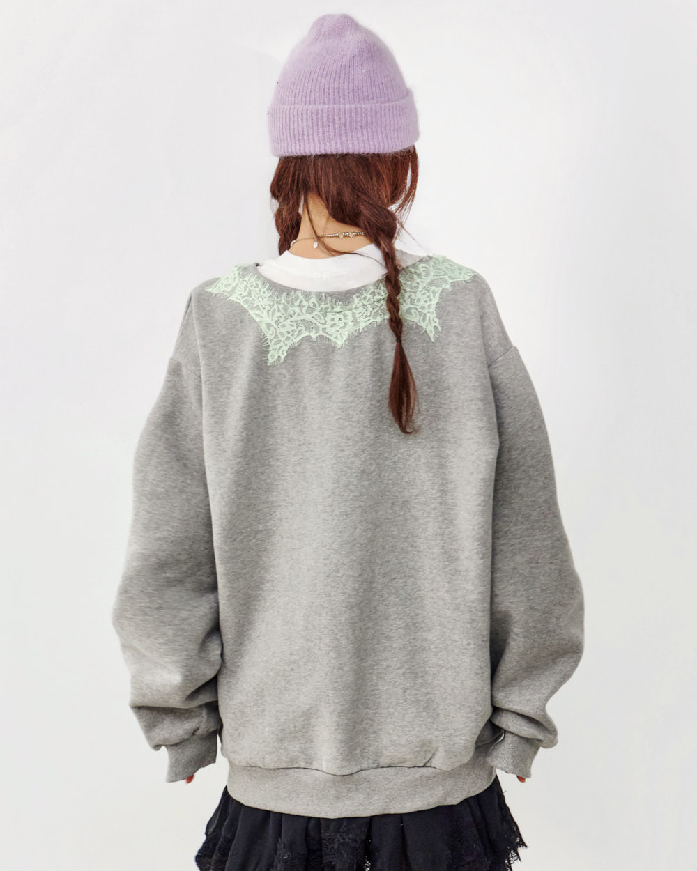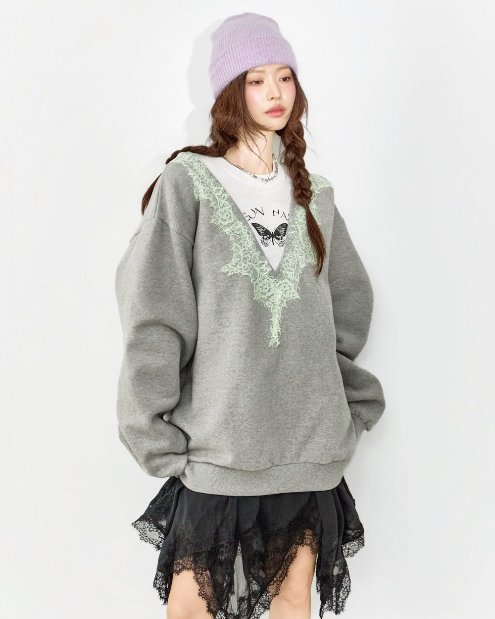 这是一款充满个性氛围的蕾丝叠穿卫衣。