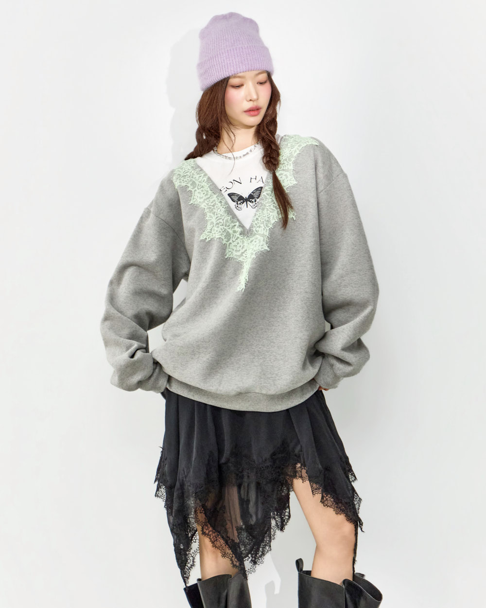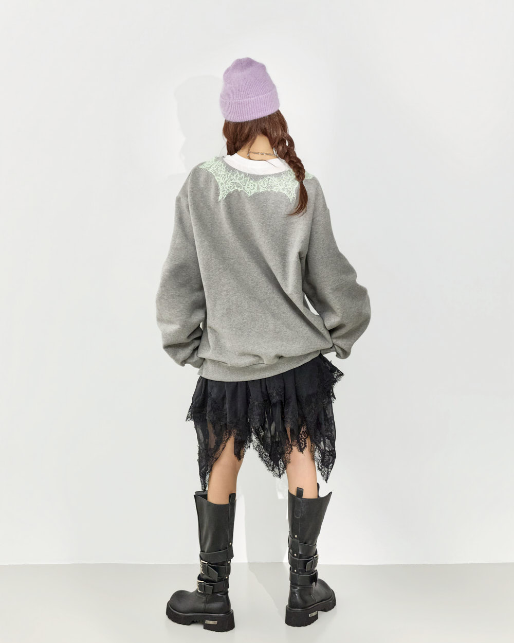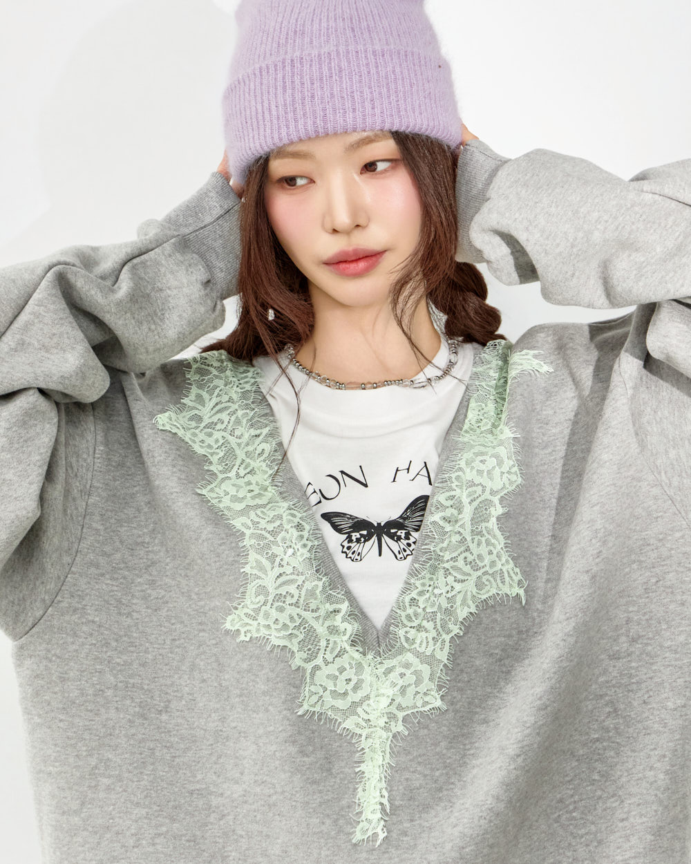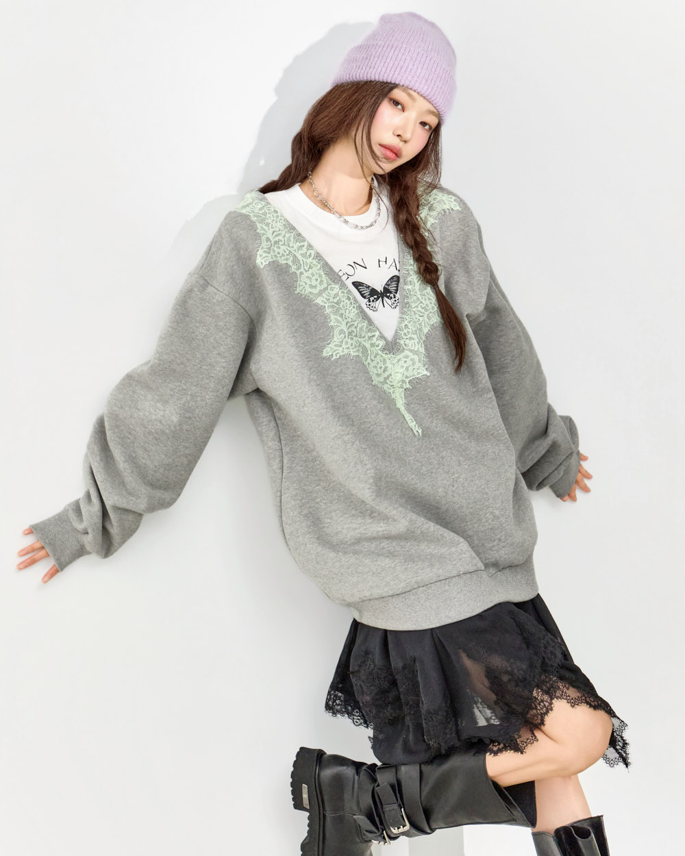 这是一款充满个性氛围的蕾丝叠穿卫衣。