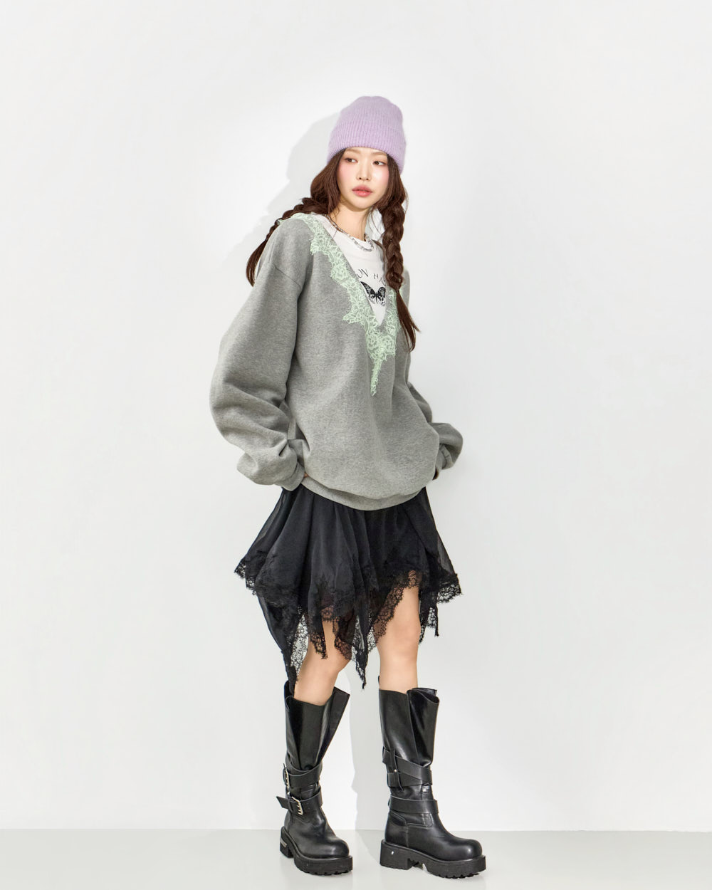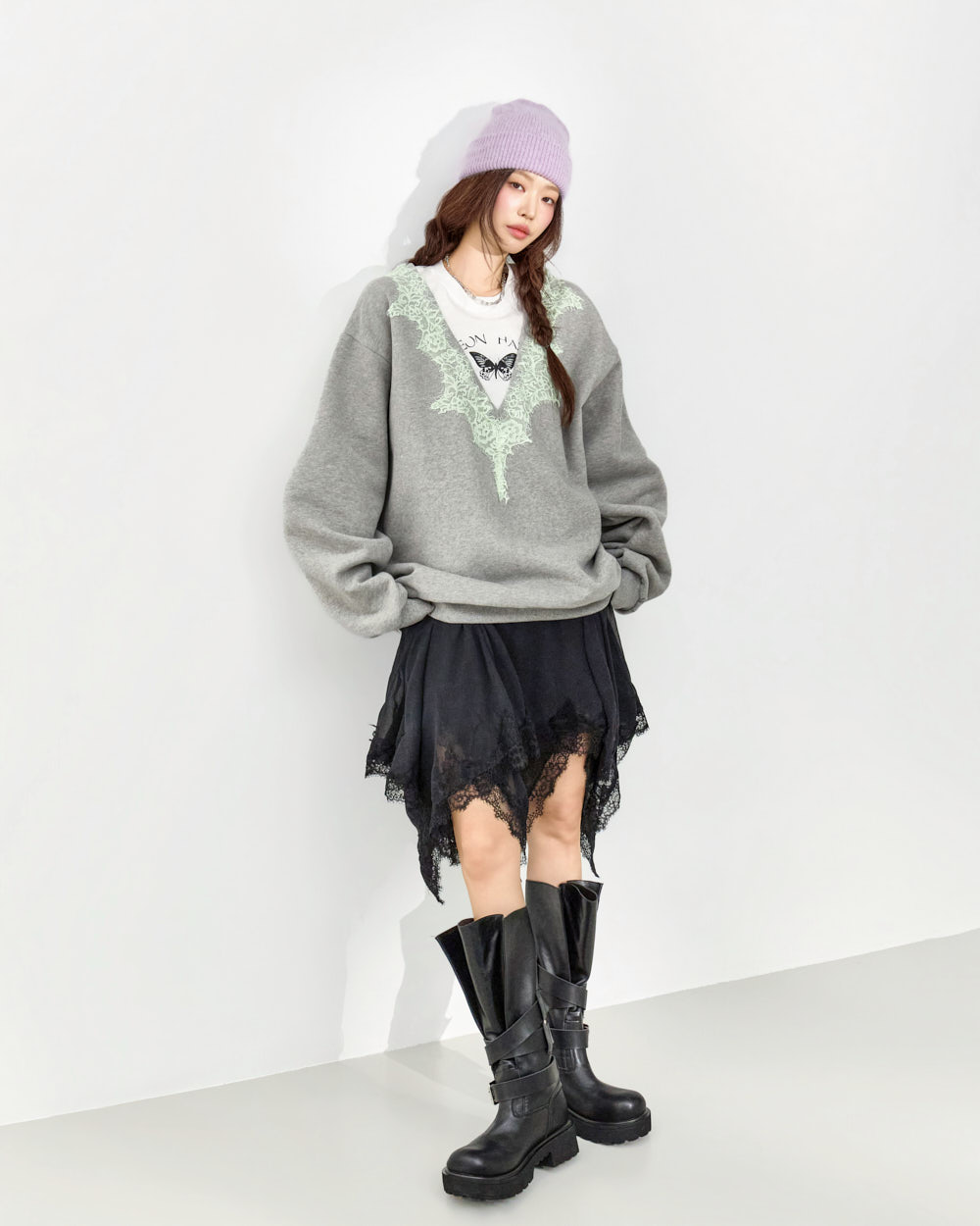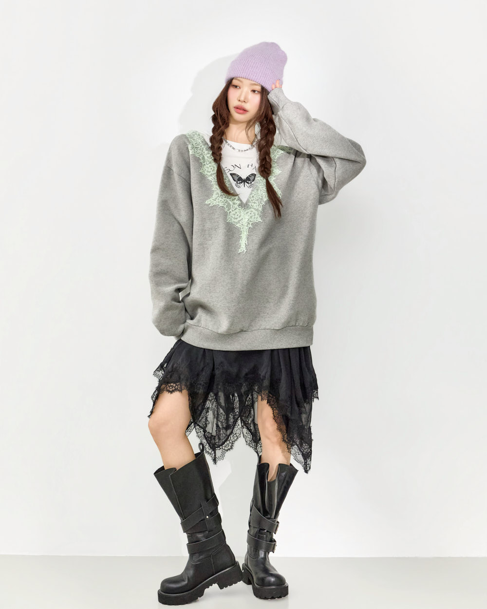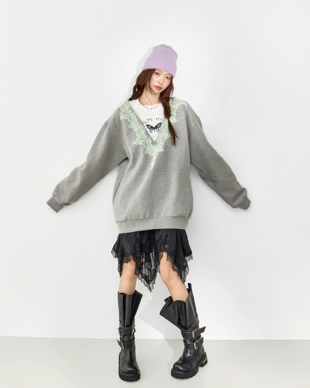 这是一款充满个性氛围的蕾丝叠穿卫衣。