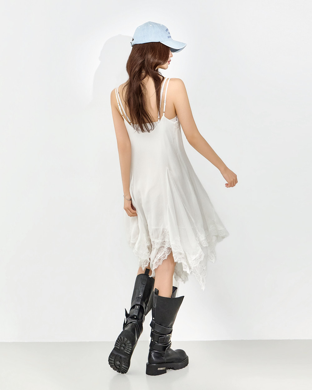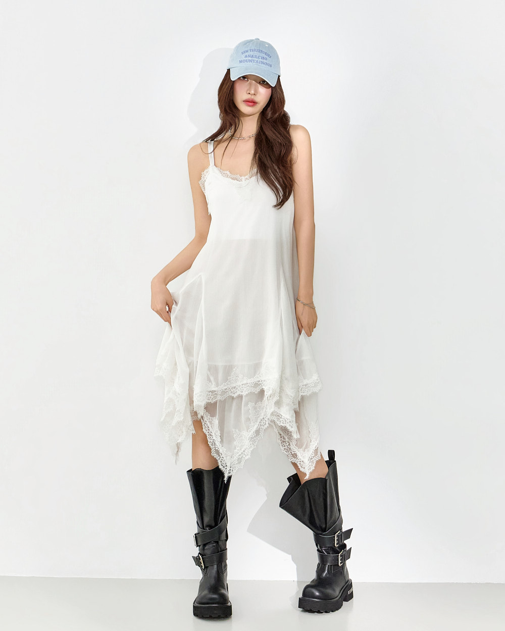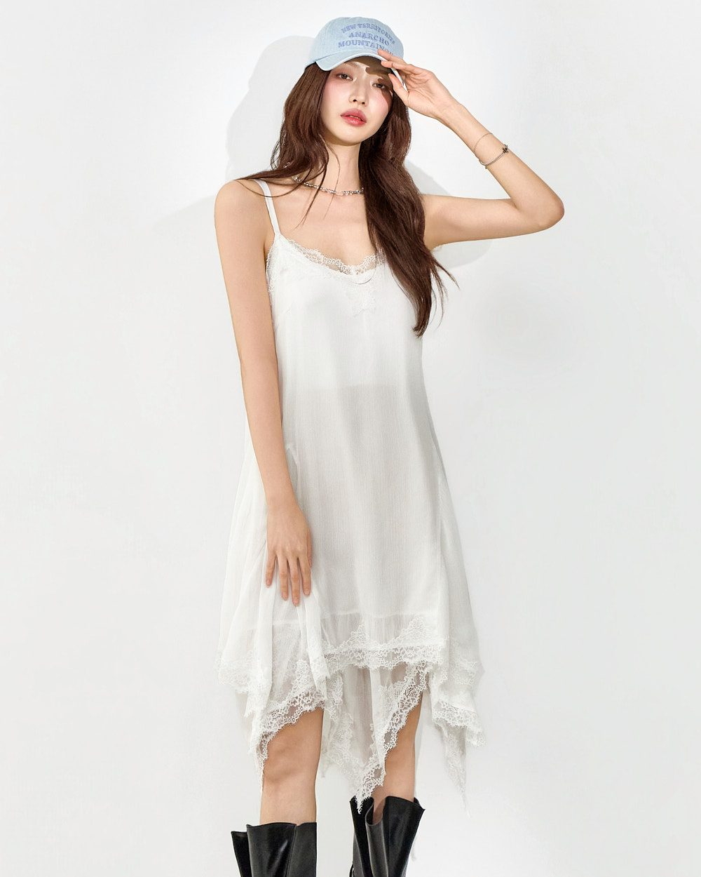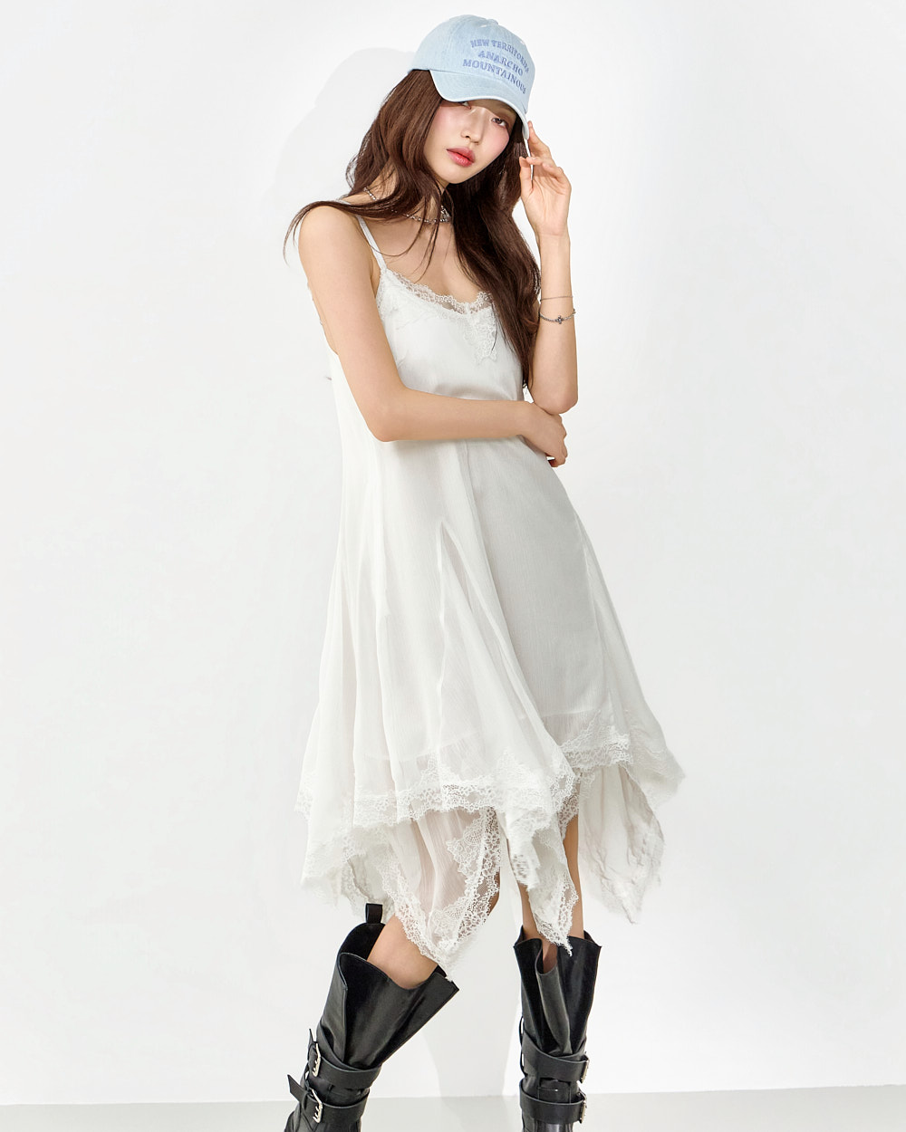 干练的吊带裙廓形搭配蕾丝下摆细节,