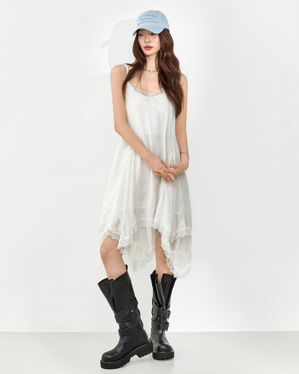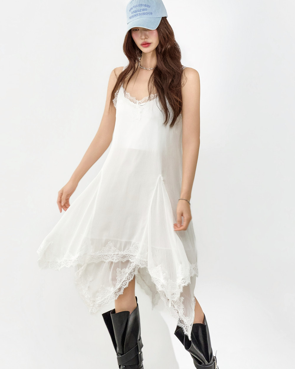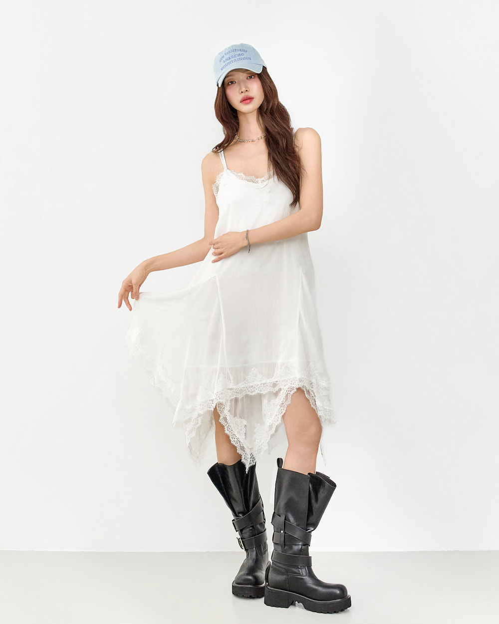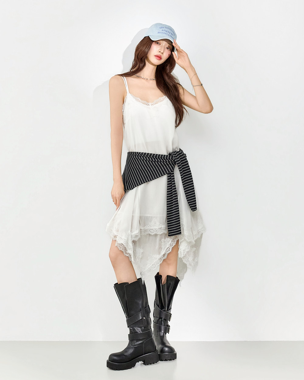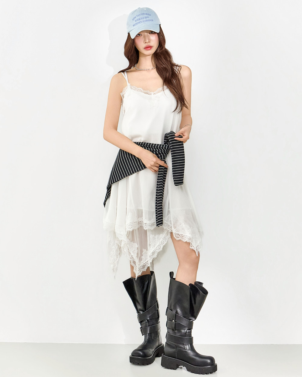 干练的吊带裙廓形搭配蕾丝下摆细节,