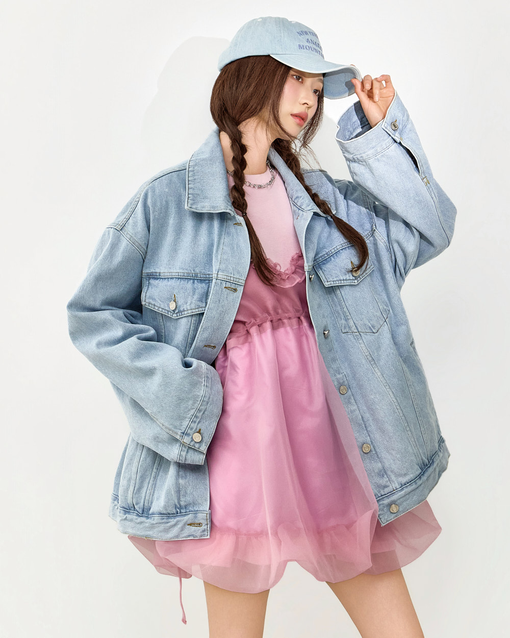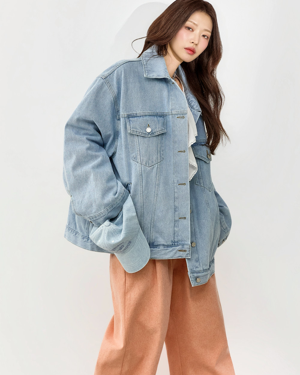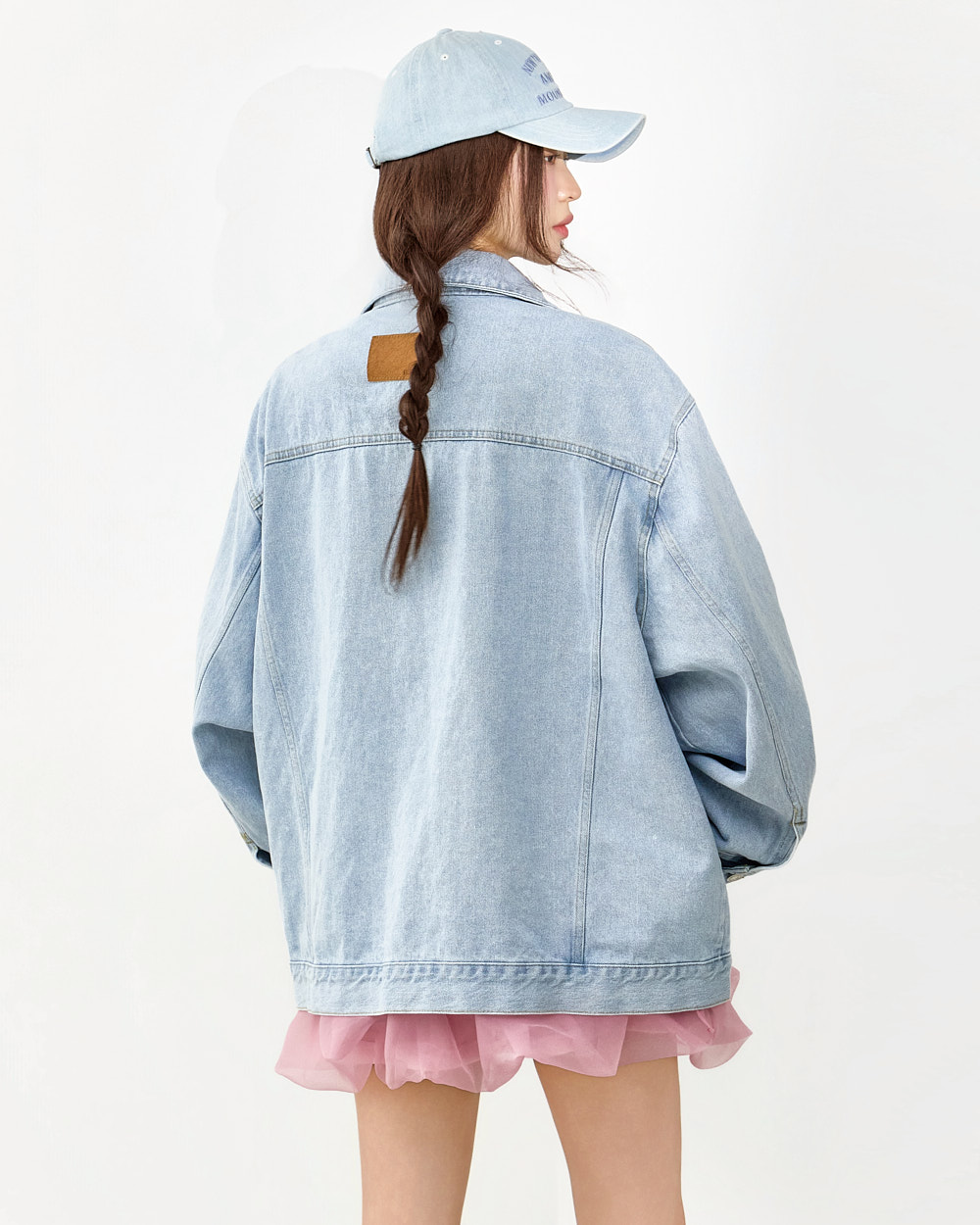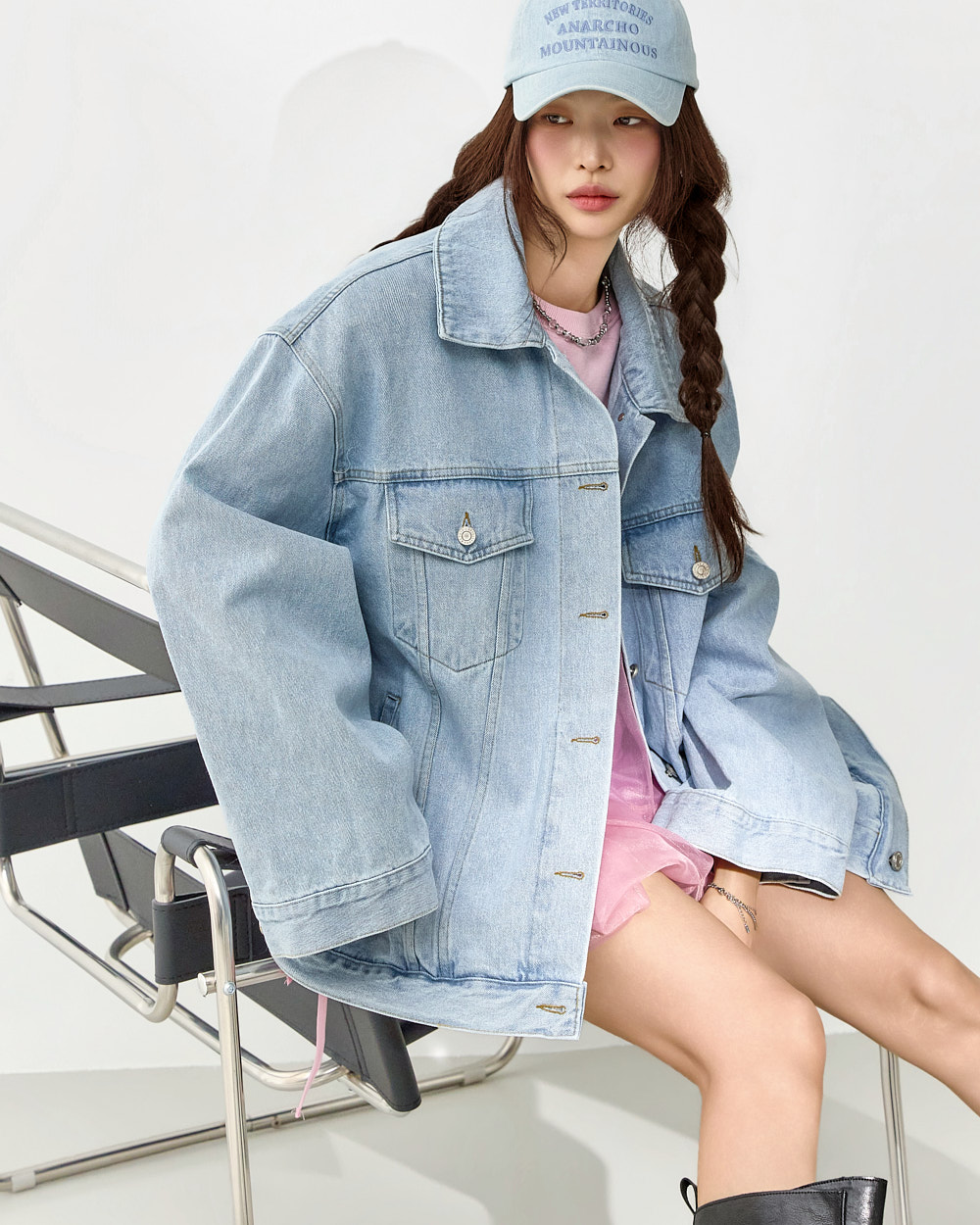 这是一款充满休闲氛围的浅色牛仔夹克。