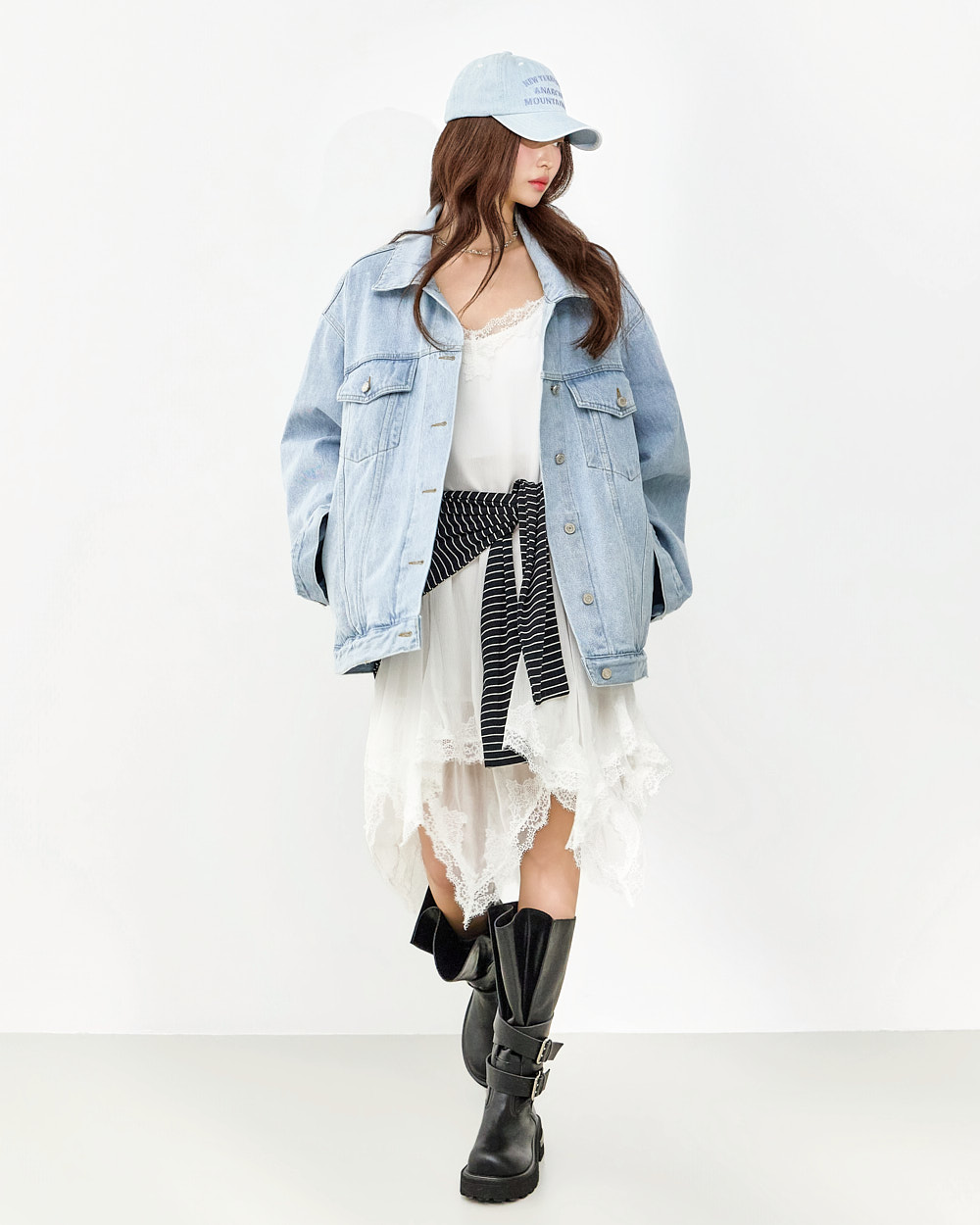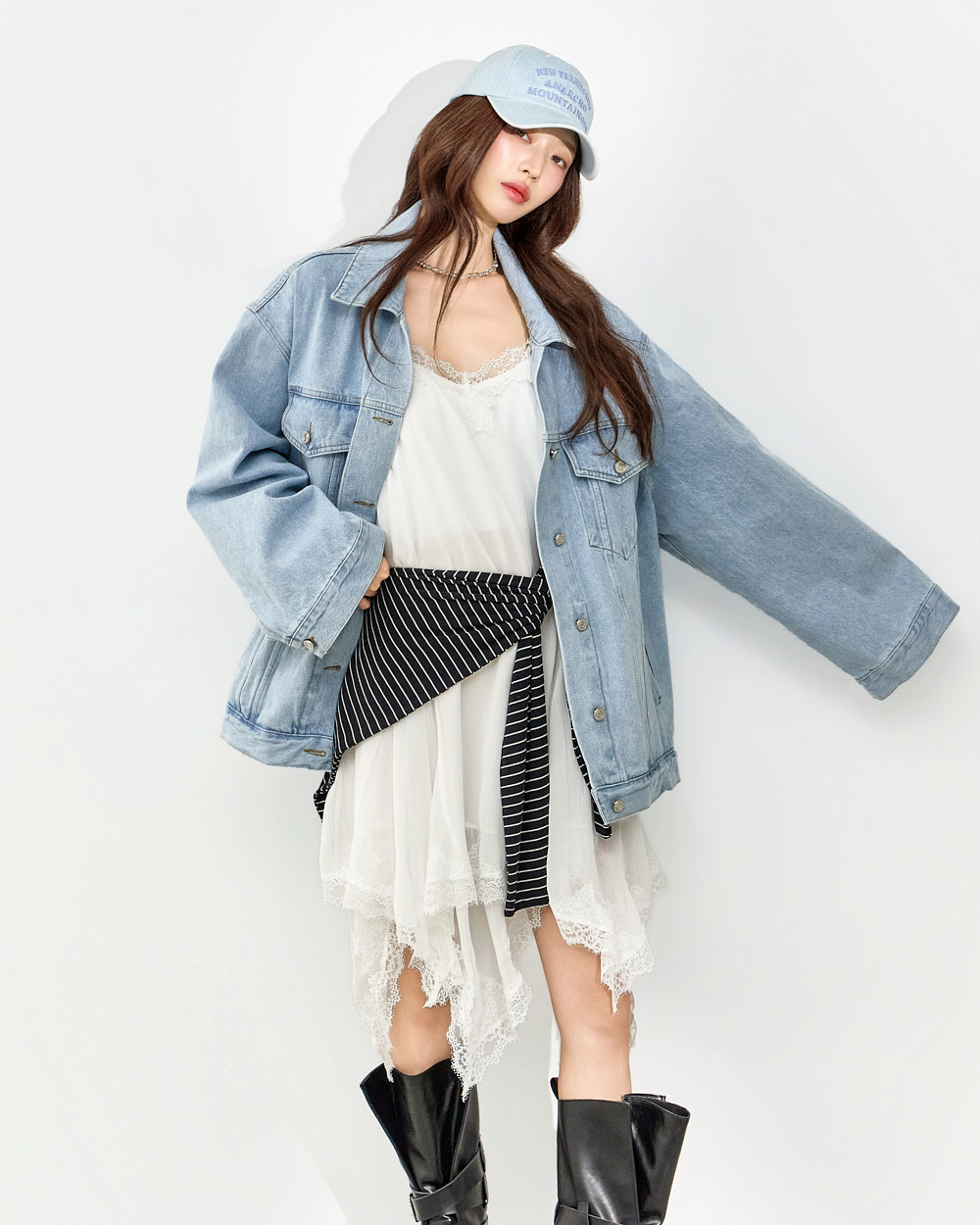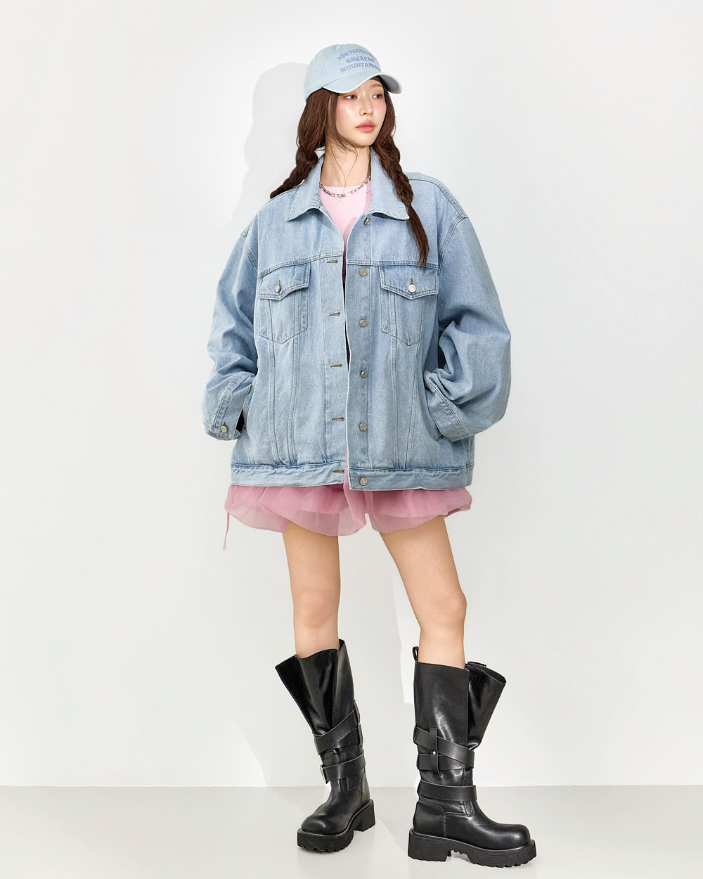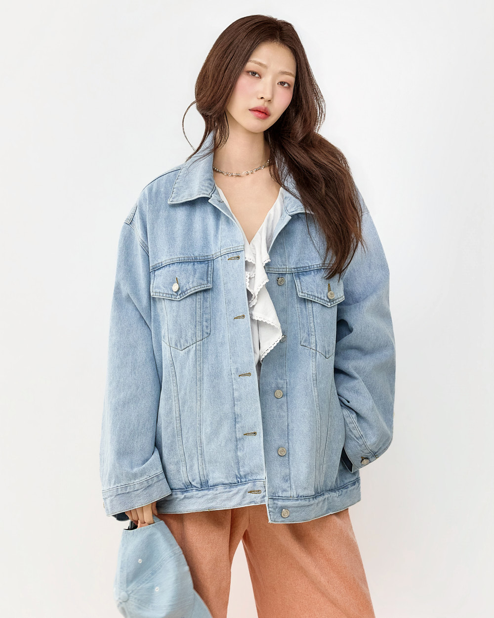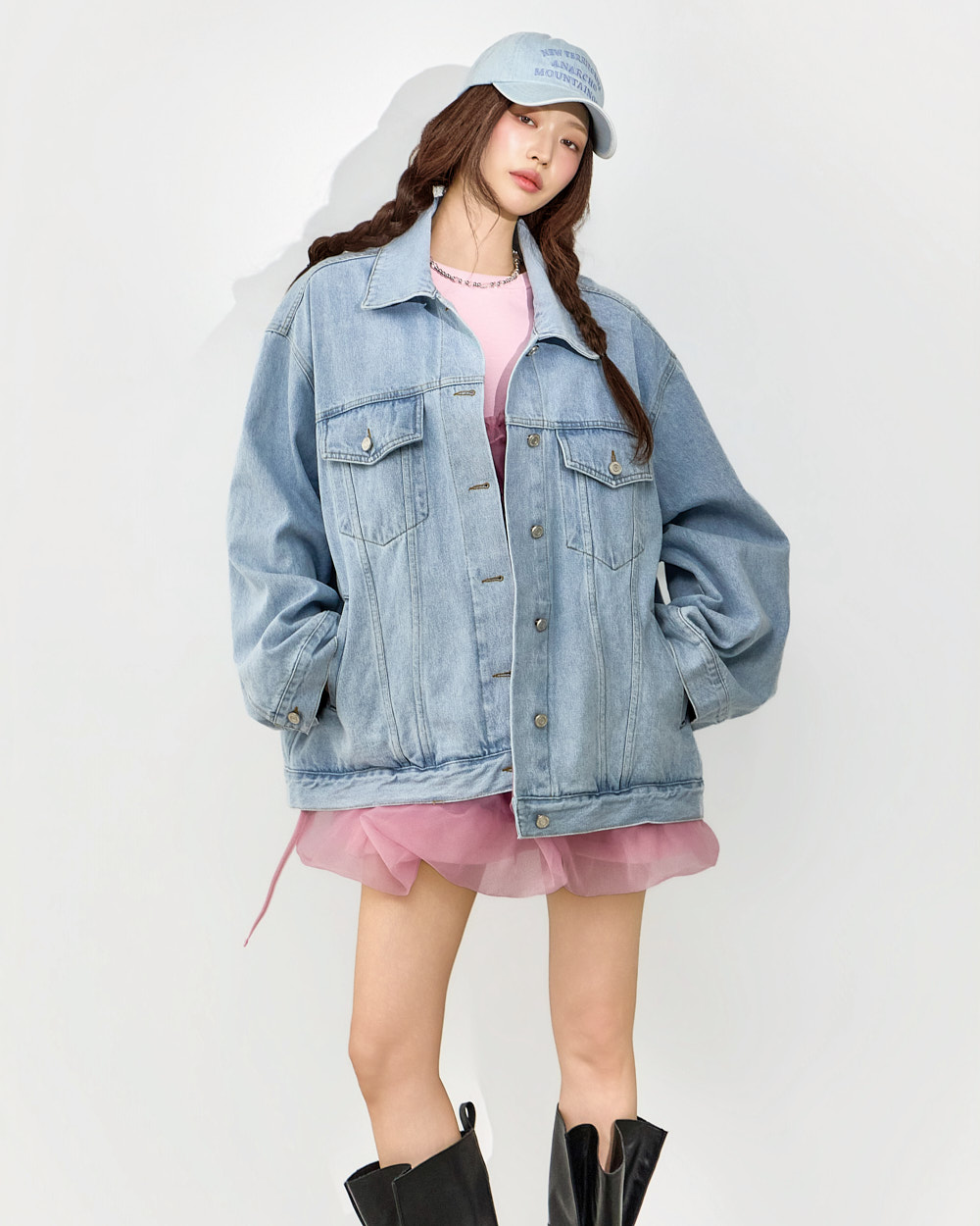 这是一款充满休闲氛围的浅色牛仔夹克。