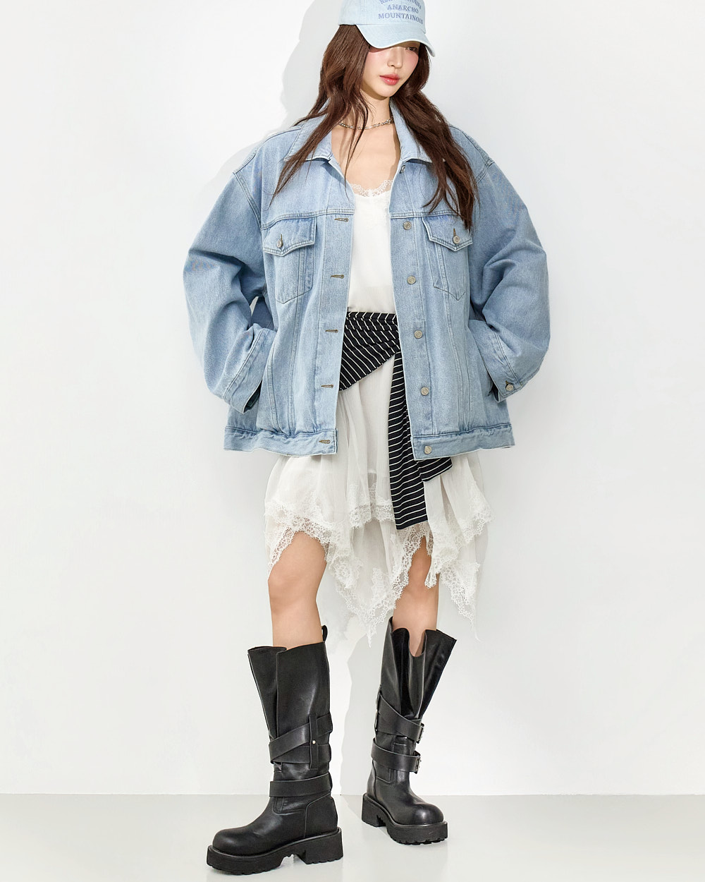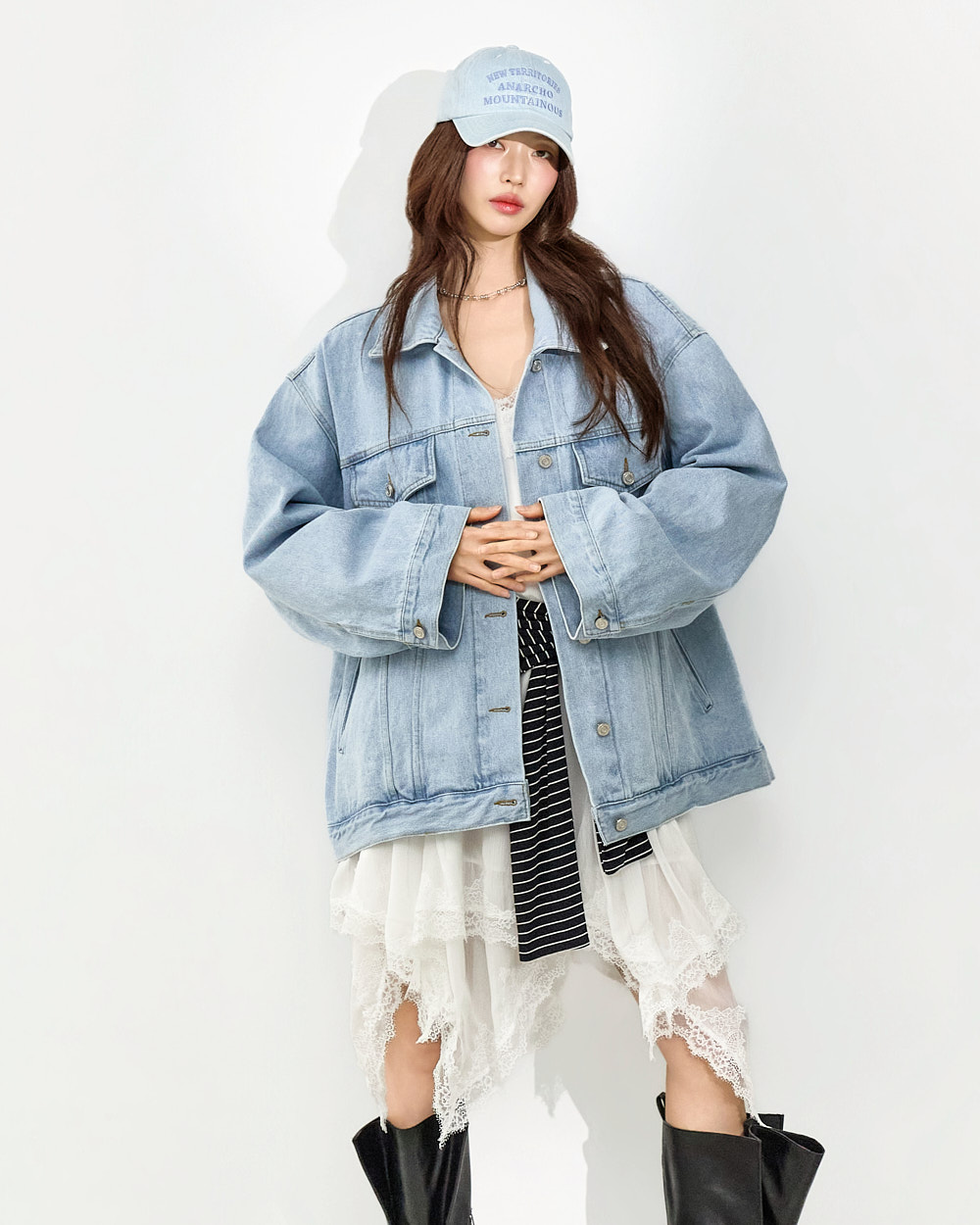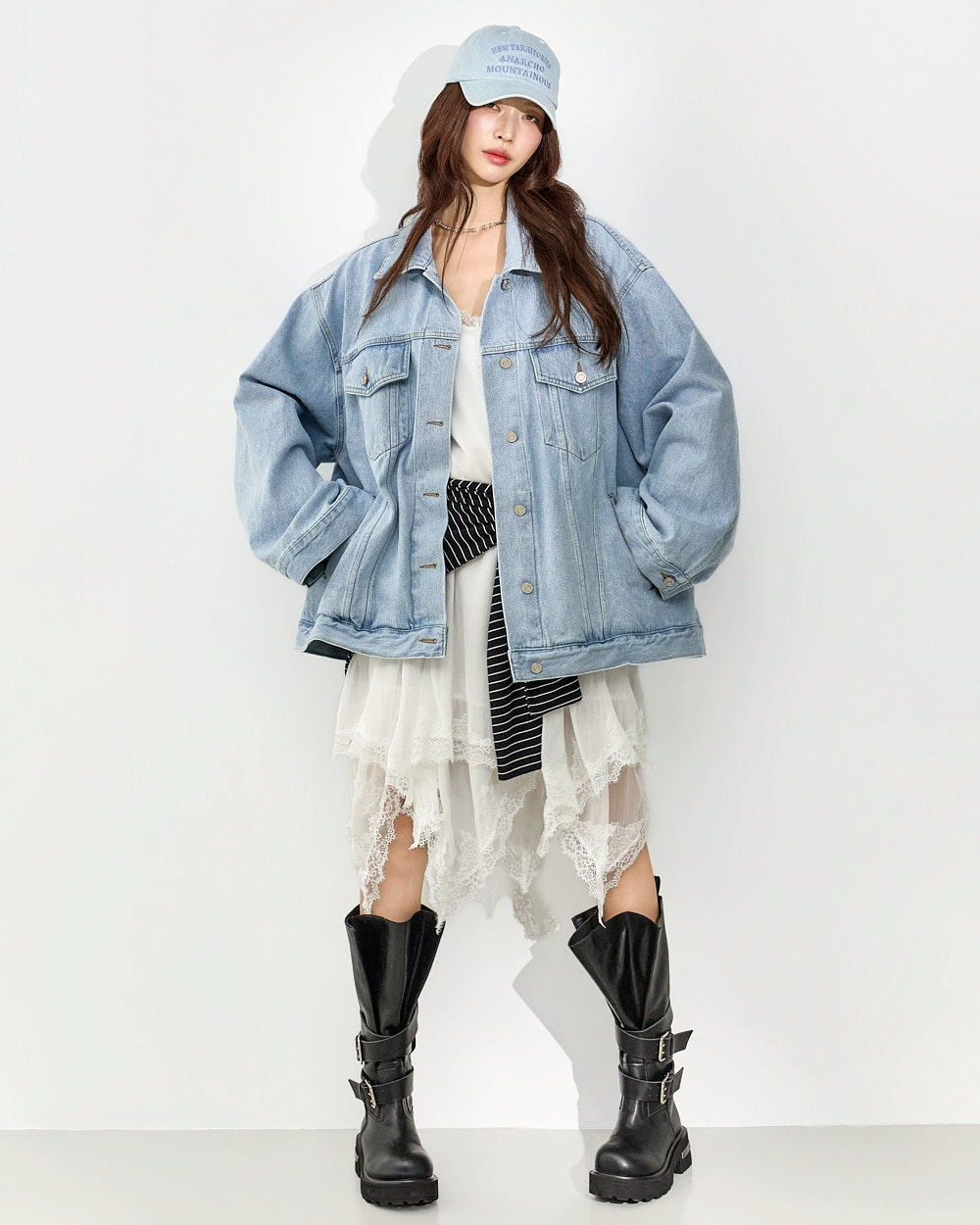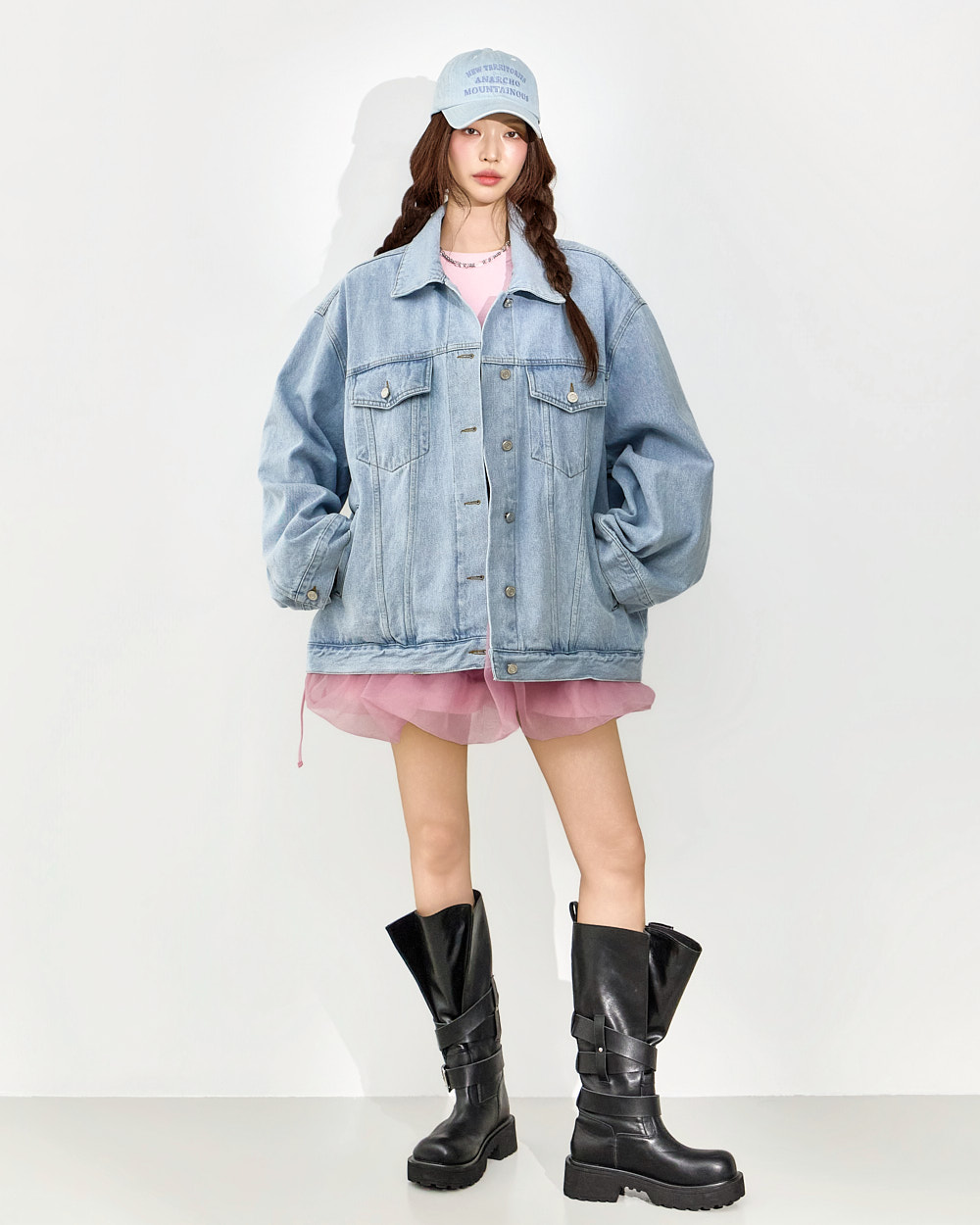 这是一款充满休闲氛围的浅色牛仔夹克。