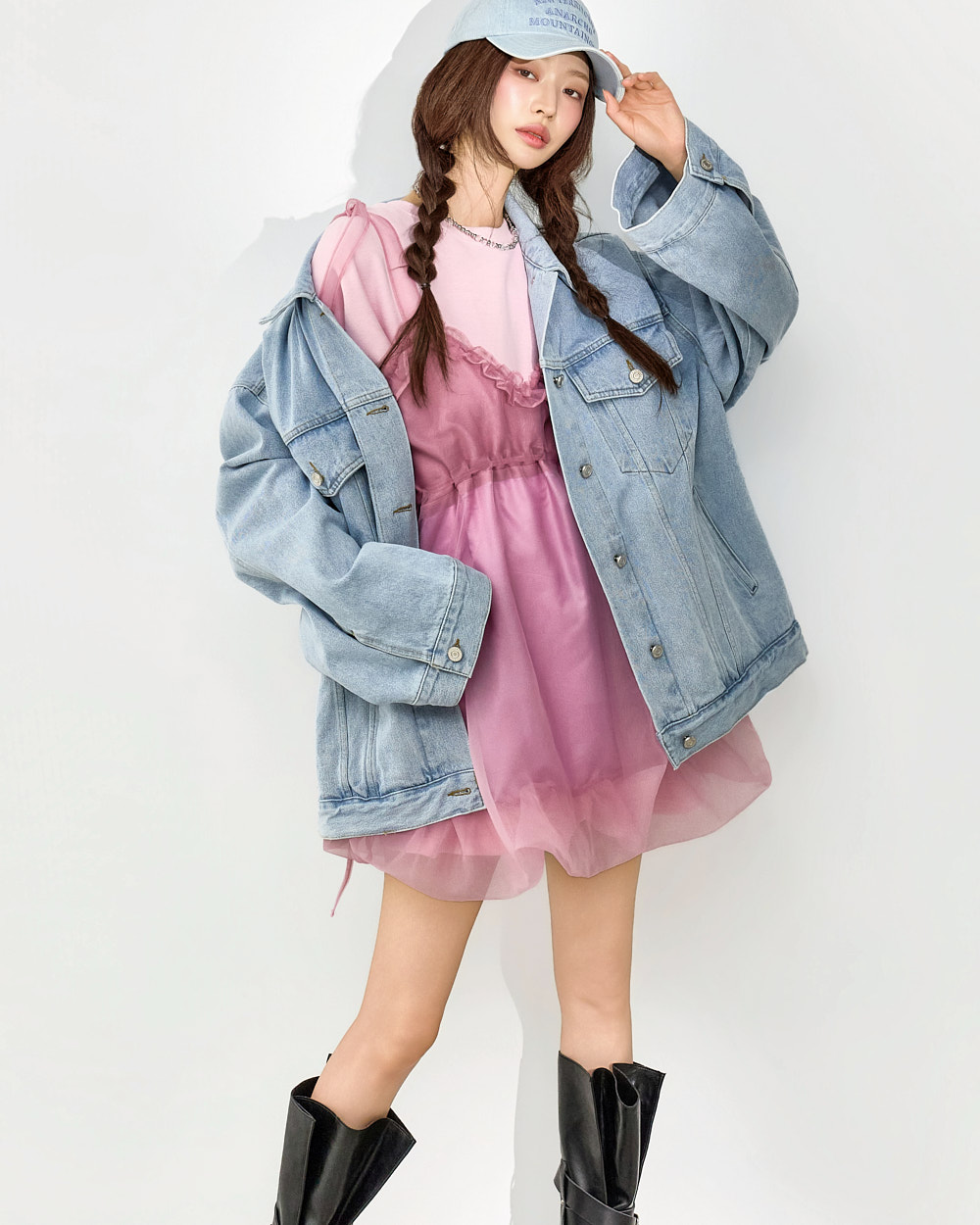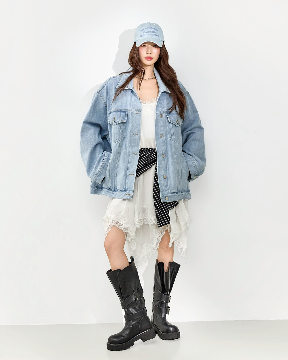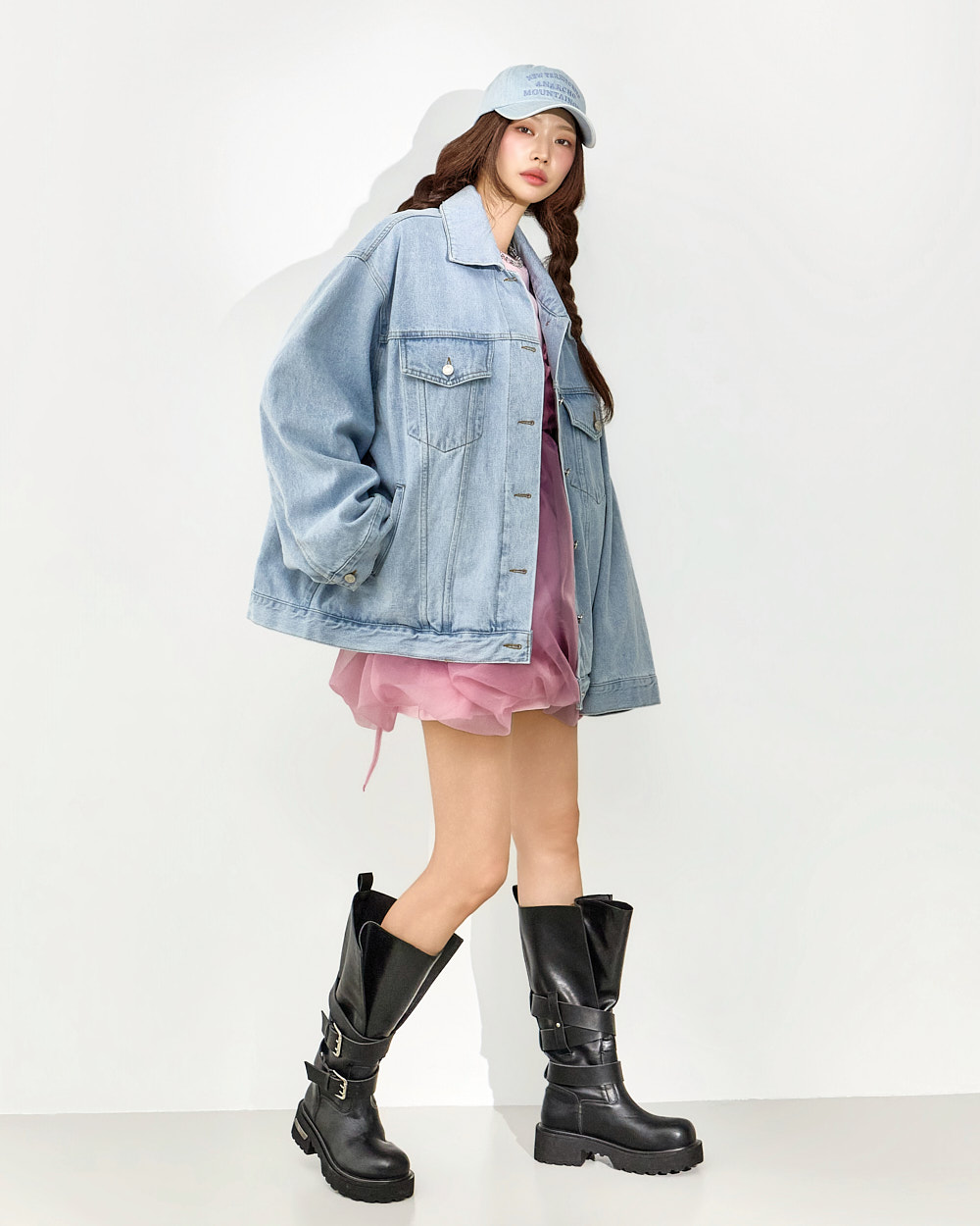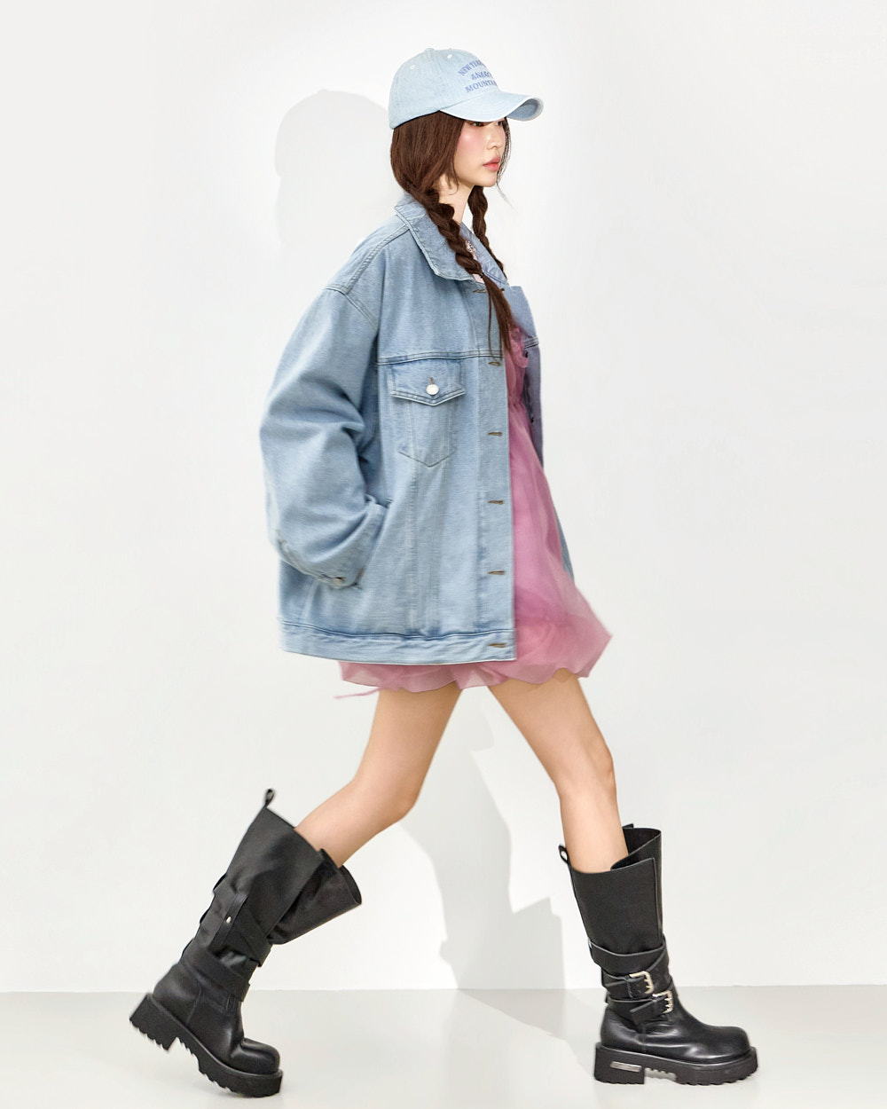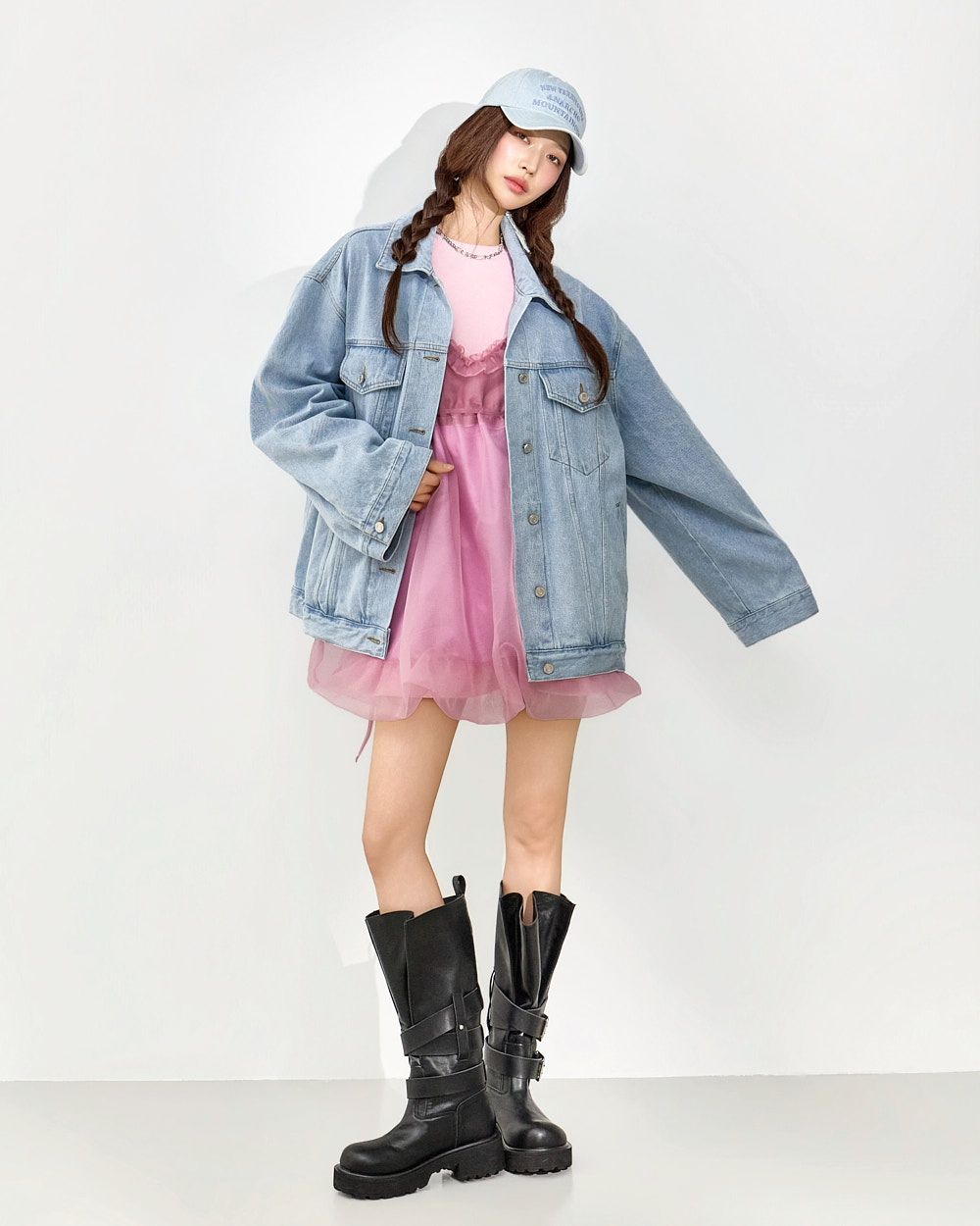 这是一款充满休闲氛围的浅色牛仔夹克。