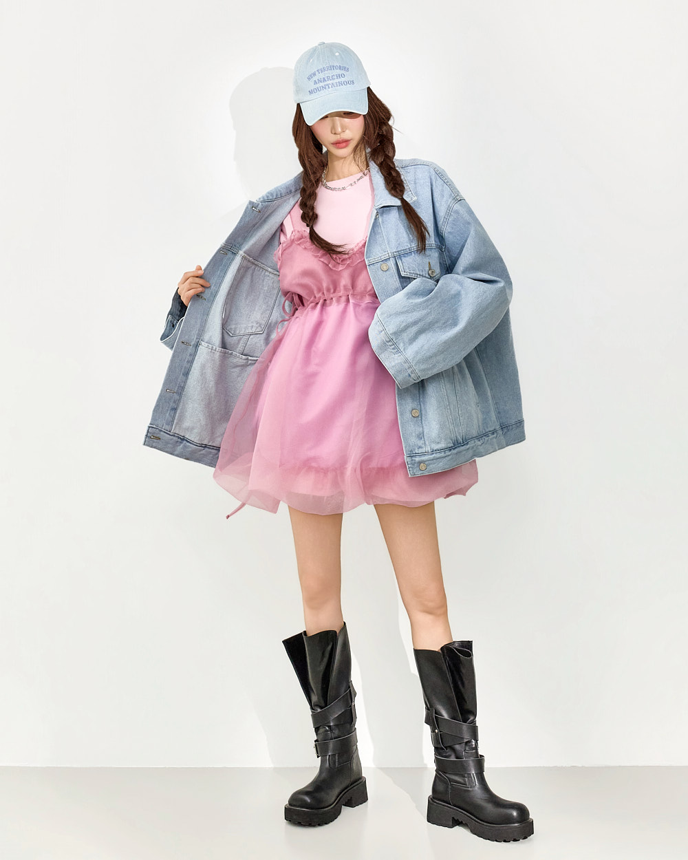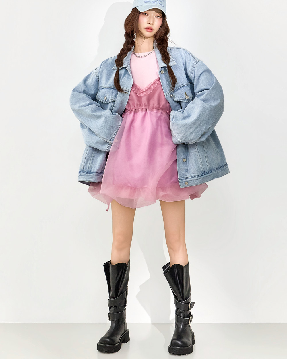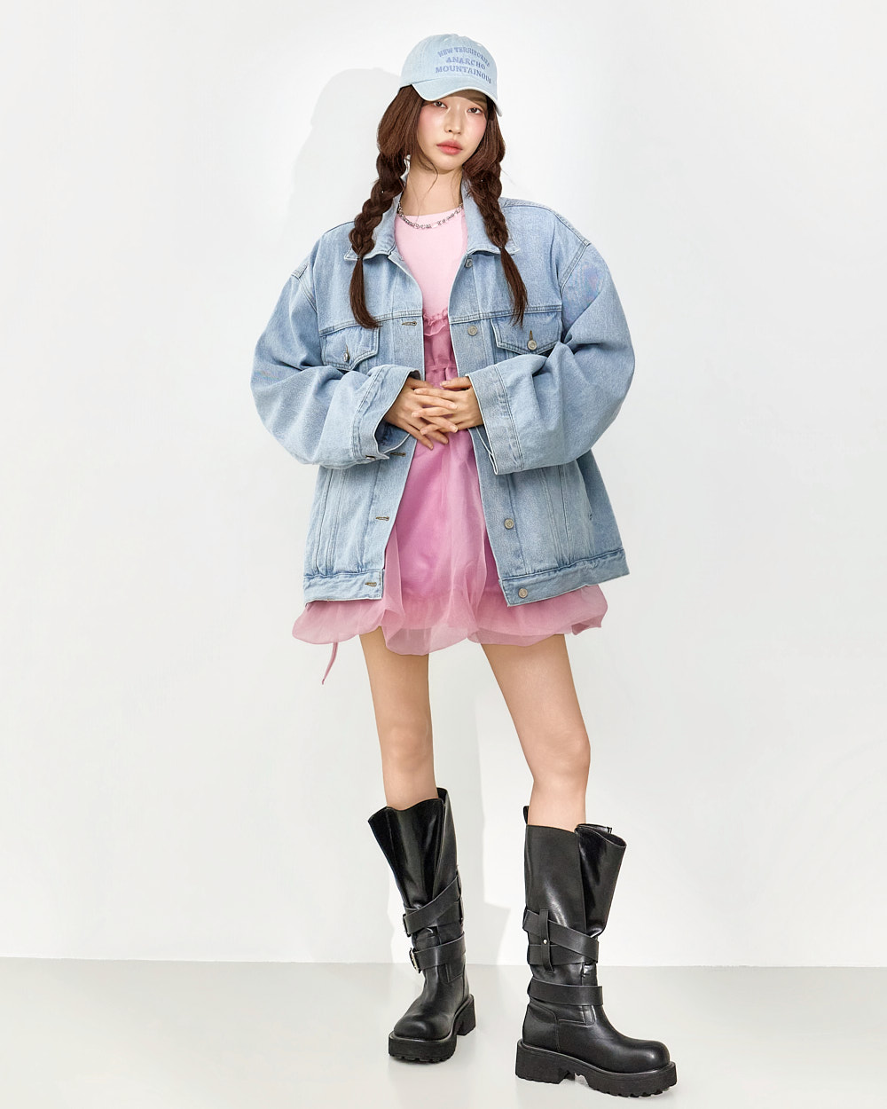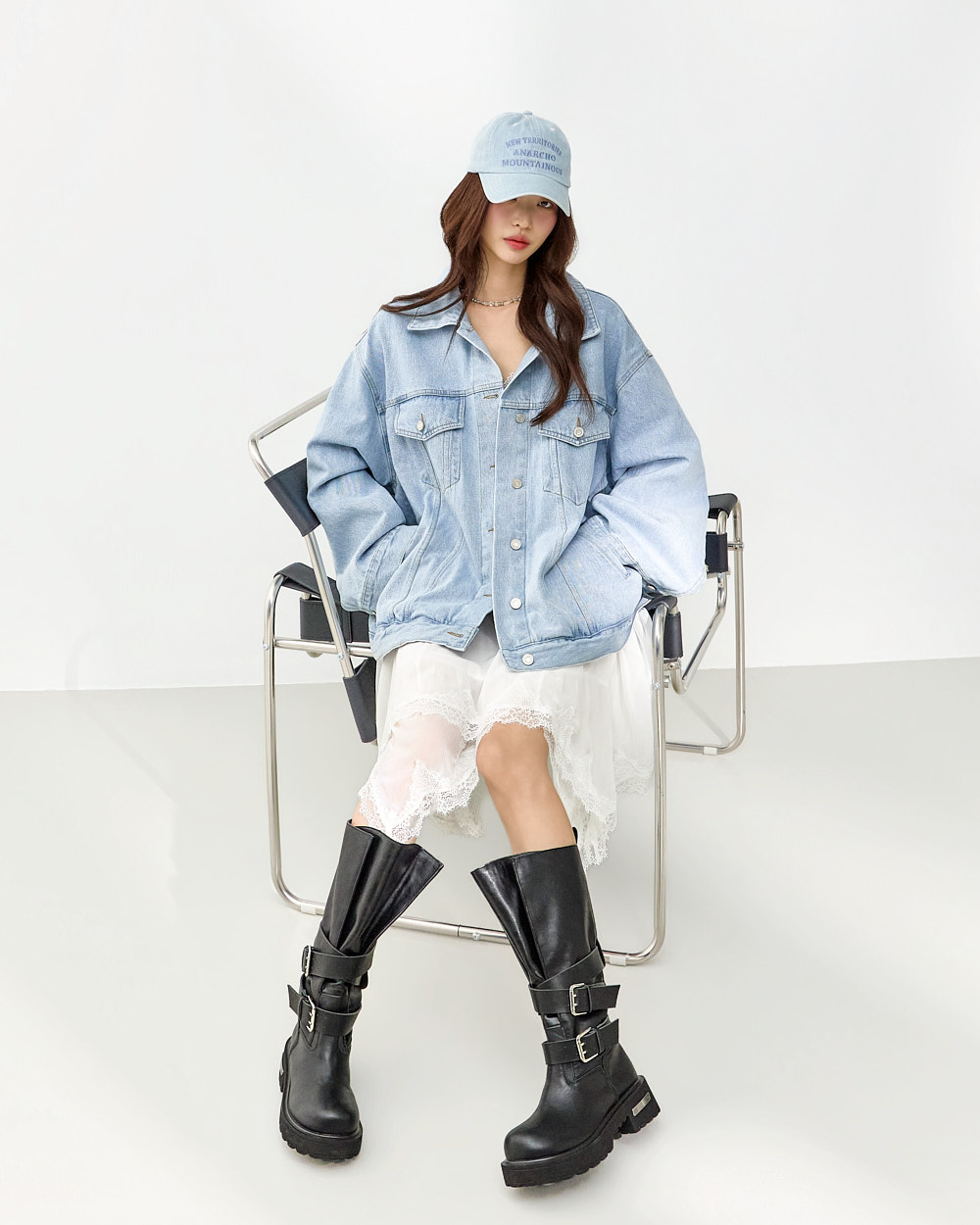 这是一款充满休闲氛围的浅色牛仔夹克。