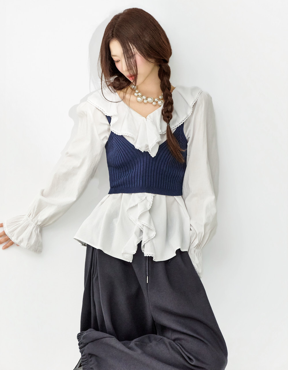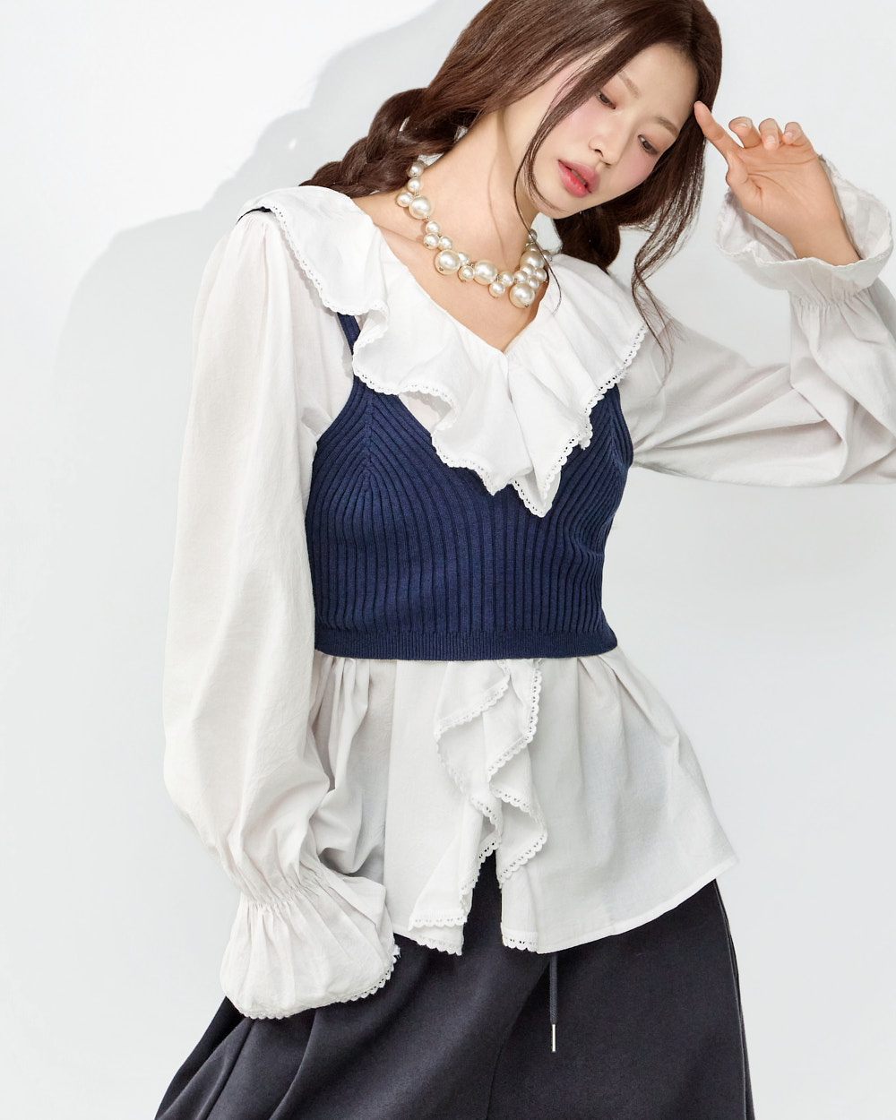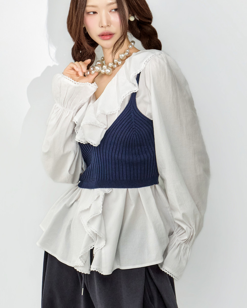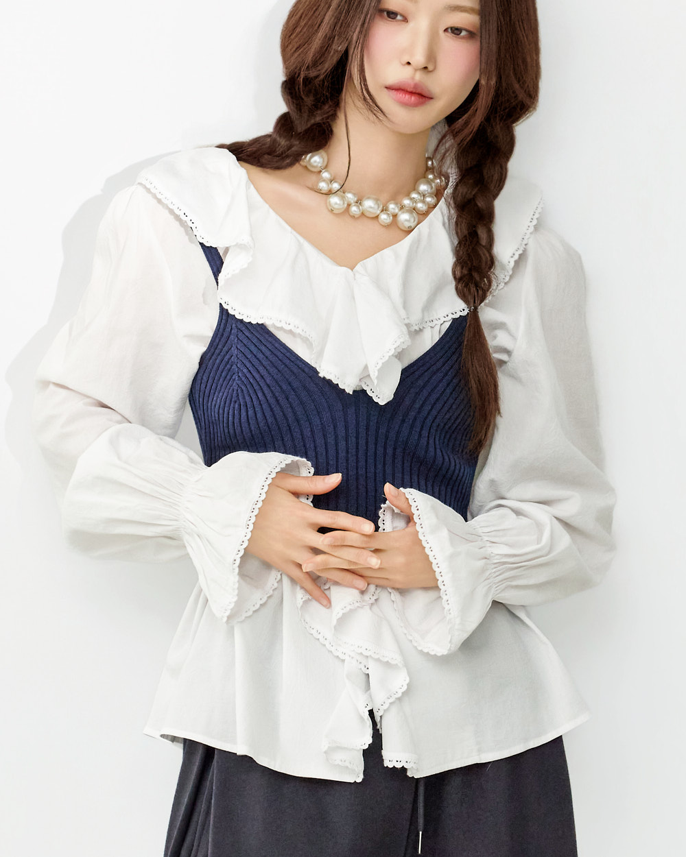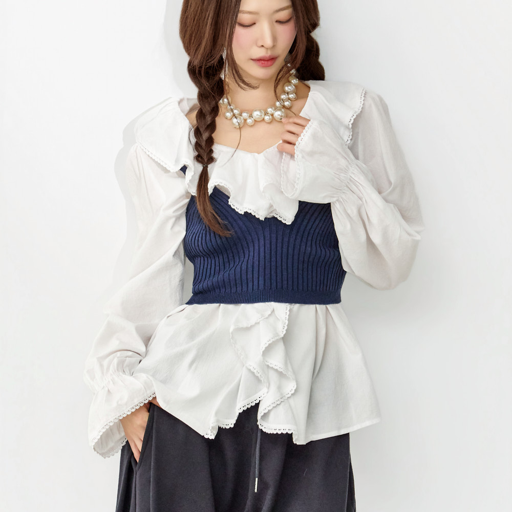 这是一款充满可爱氛围的荷叶边衬衫。