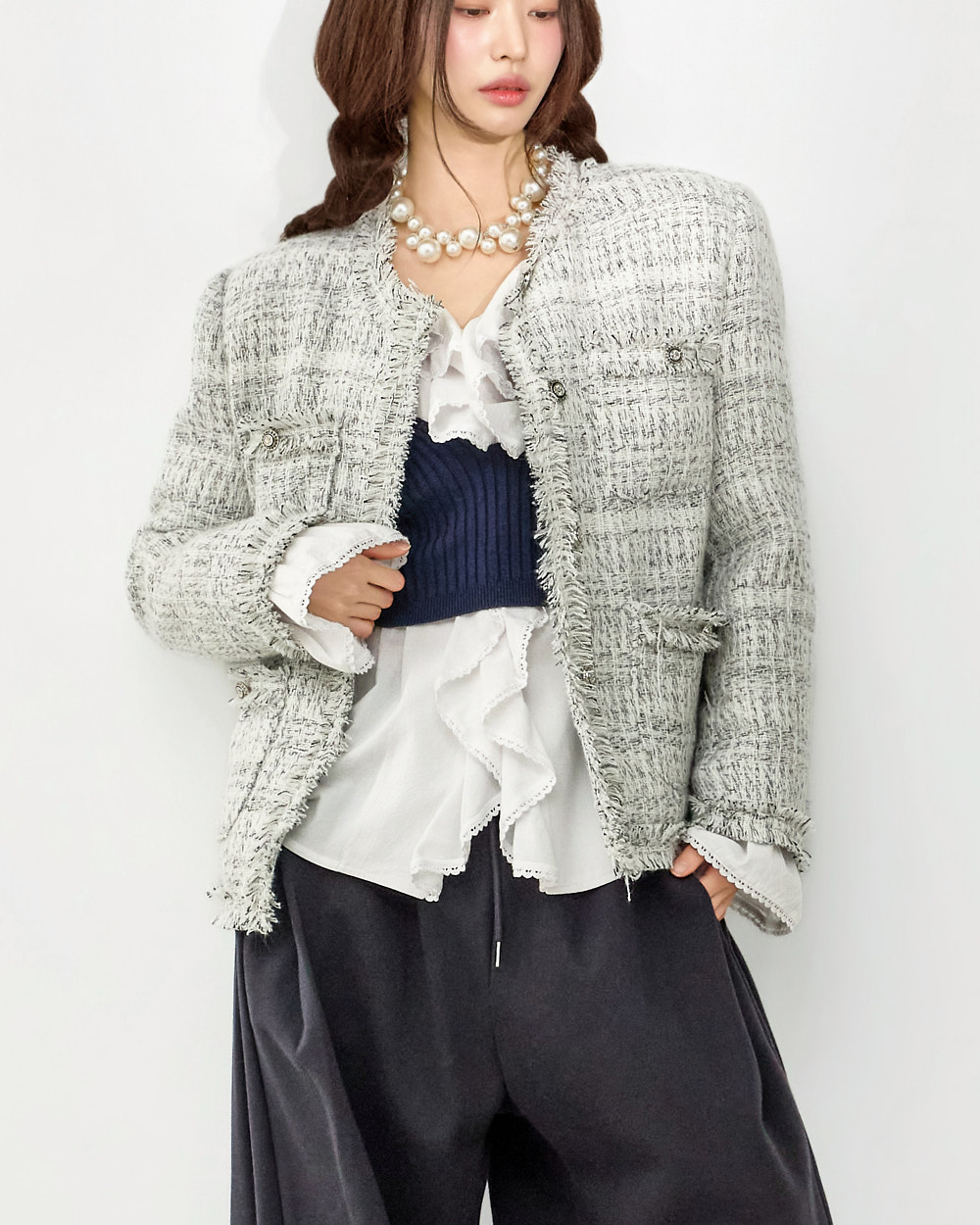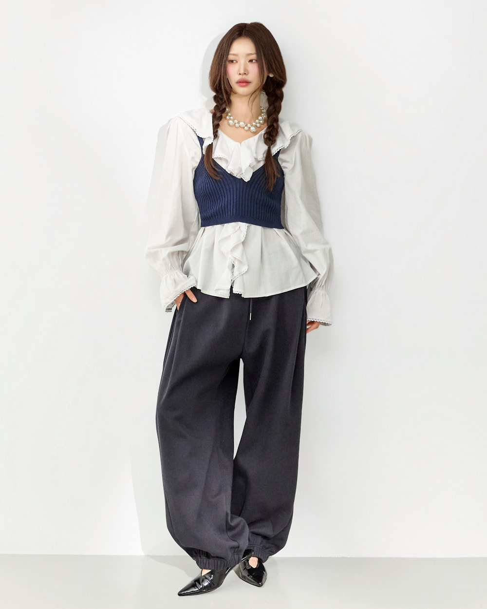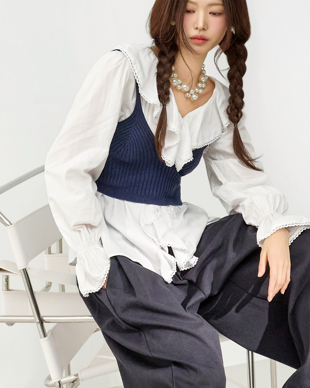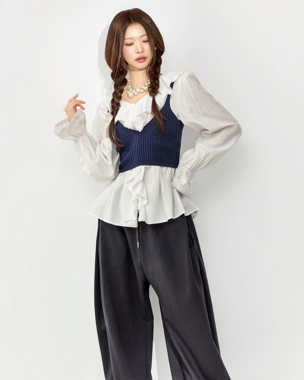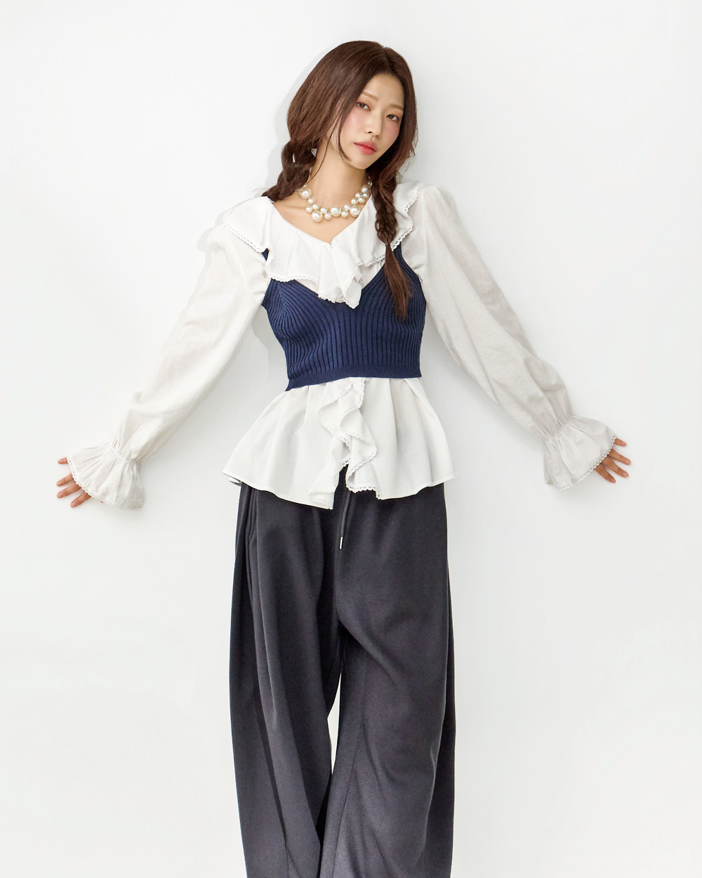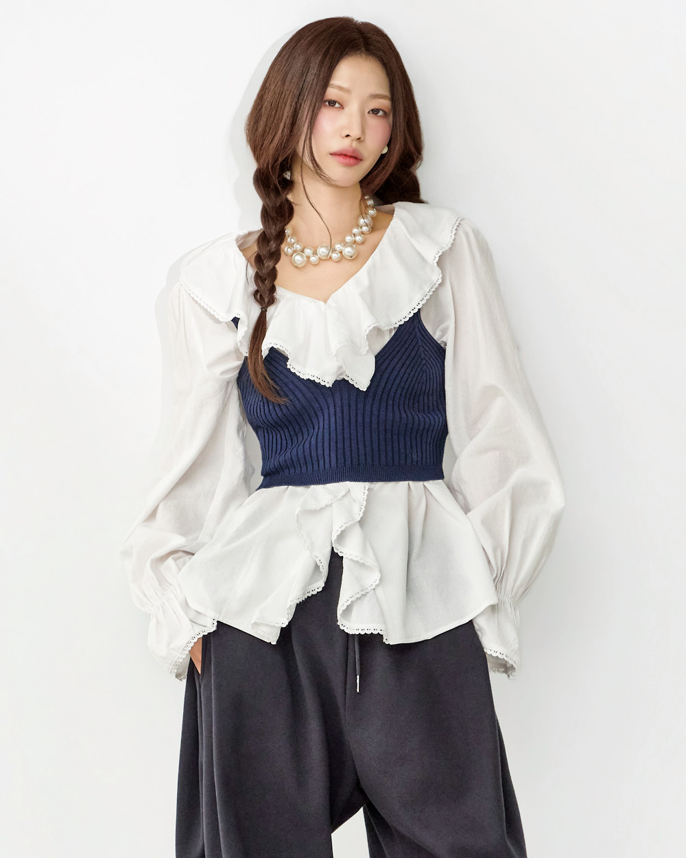 这是一款充满可爱氛围的荷叶边衬衫。