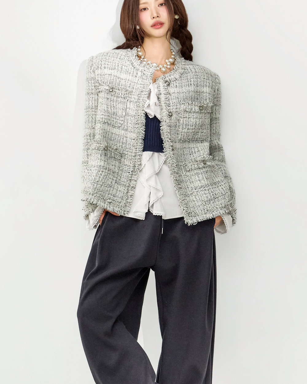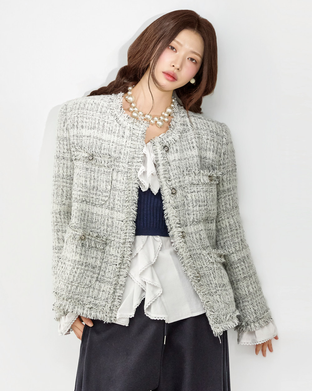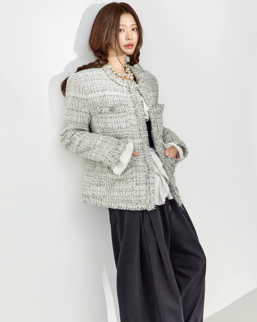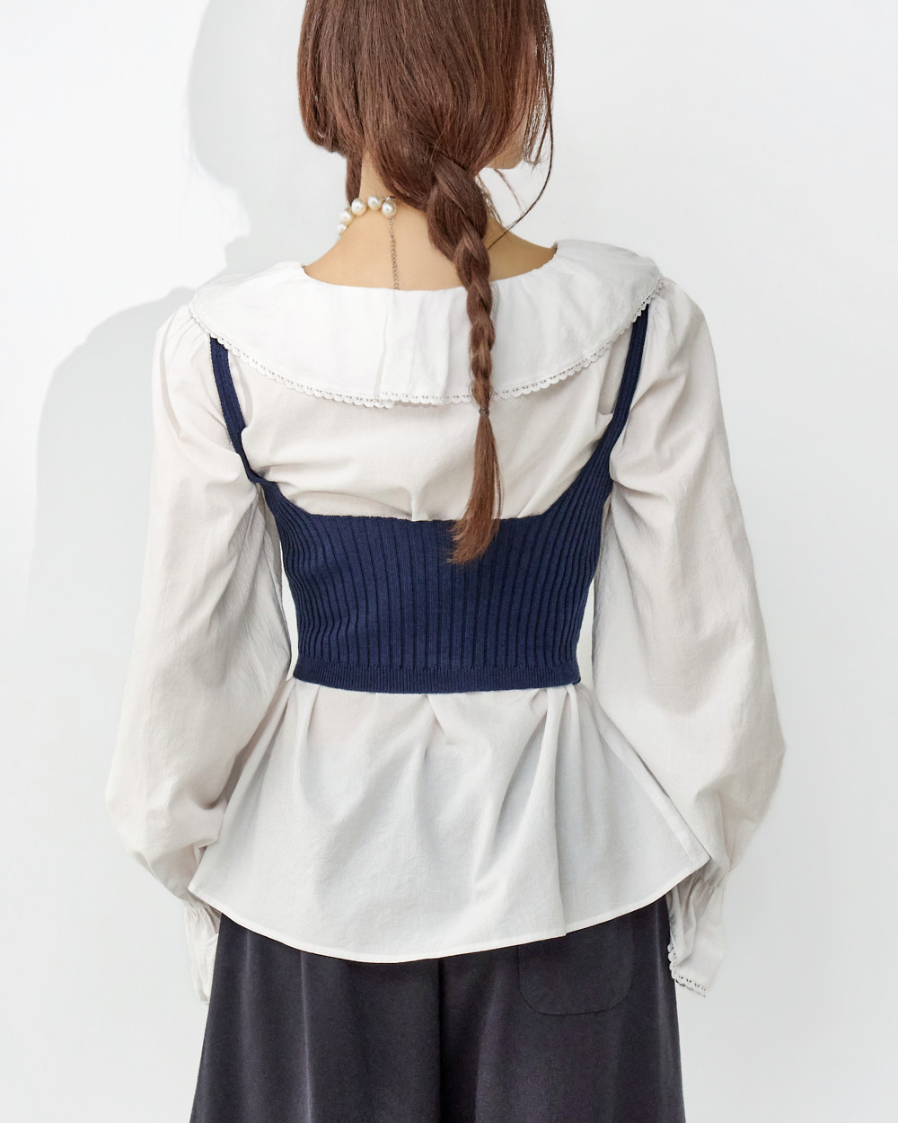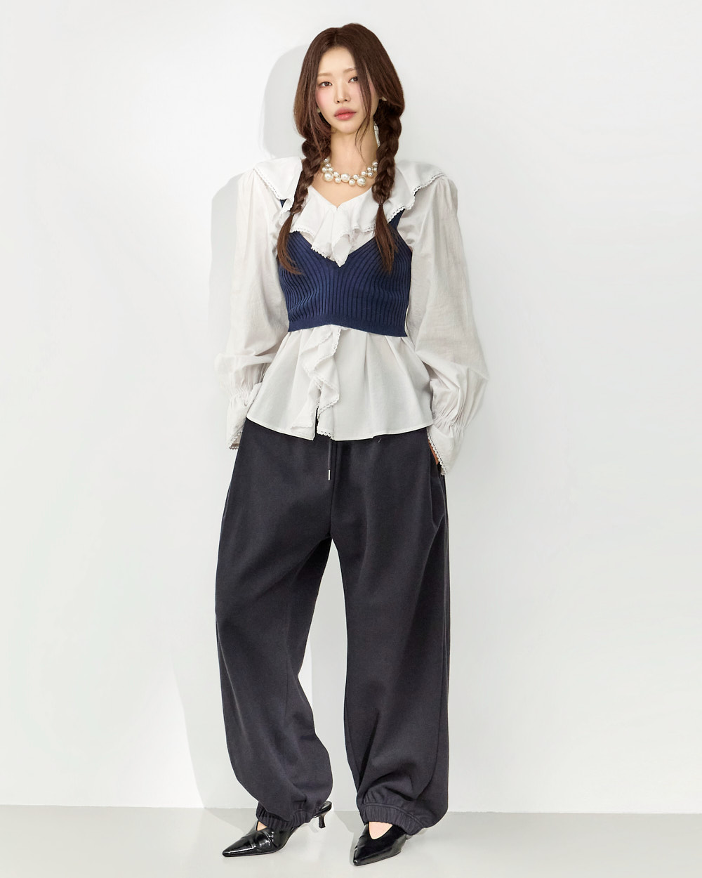 这是一款充满可爱氛围的荷叶边衬衫。