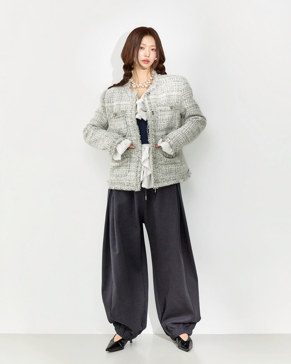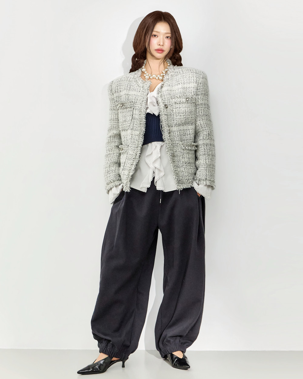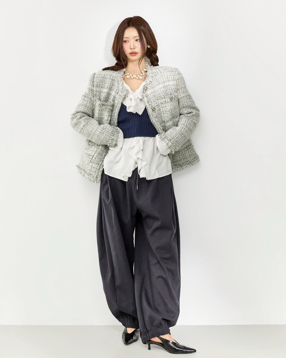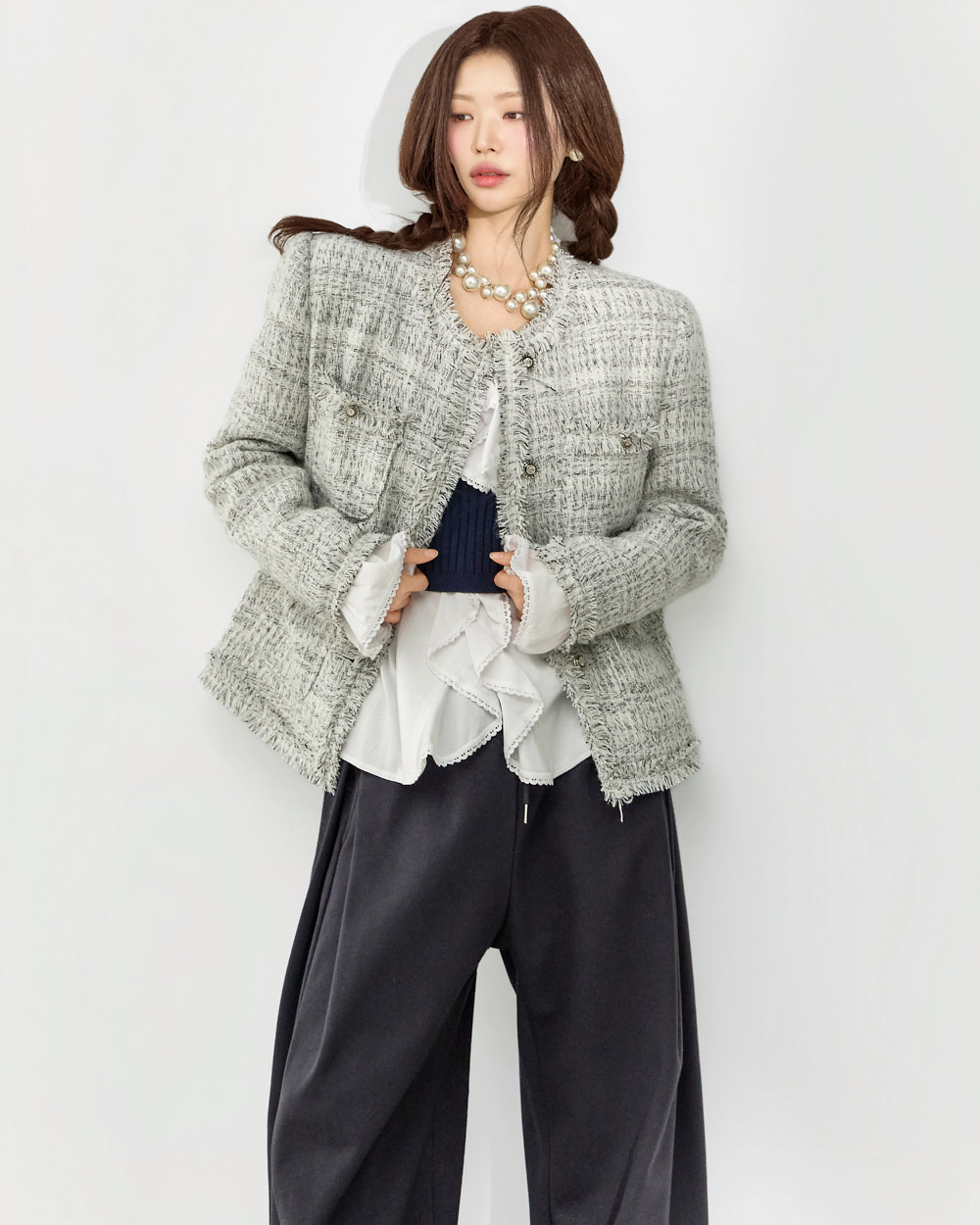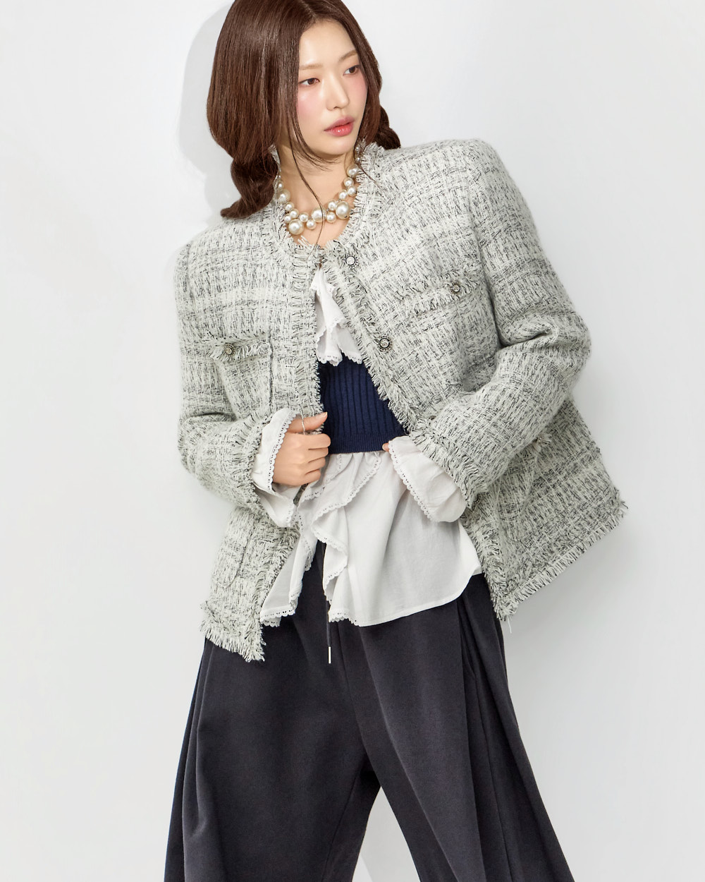 这是一款充满可爱氛围的荷叶边衬衫。