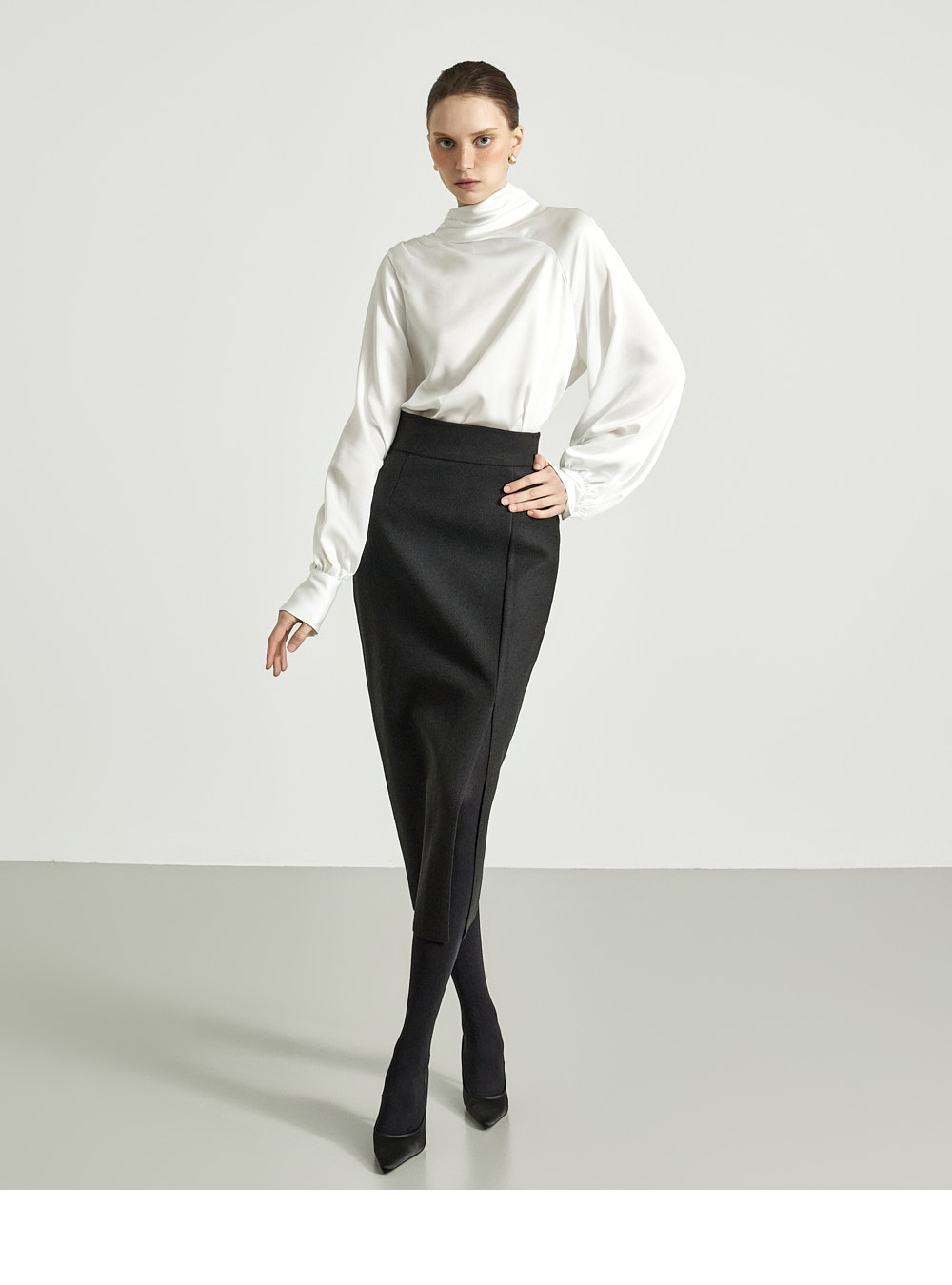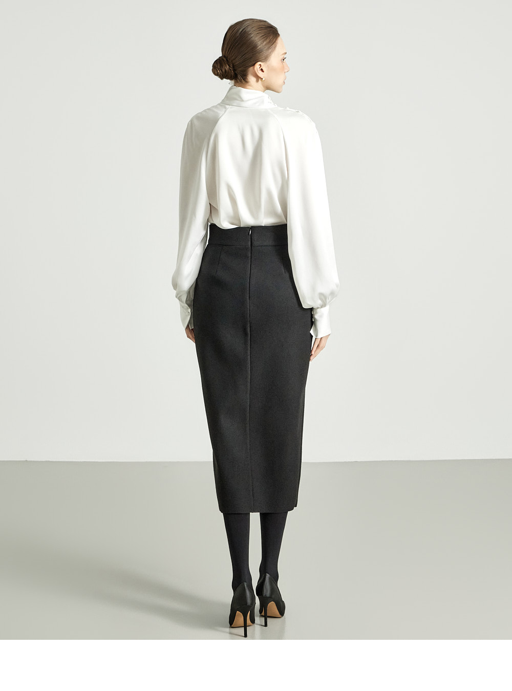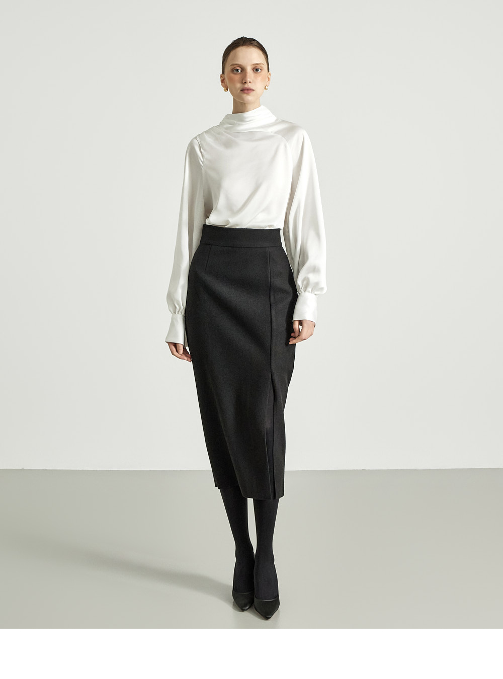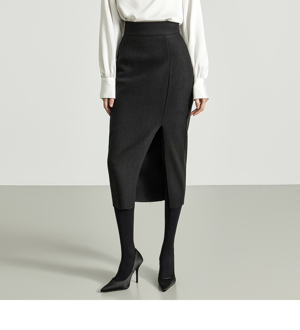 这是一款细节感十足、独特风格的半身裙。 采用结构感坚挺的高档聚酯与羊毛混纺材质制成,提供 S、M 两个尺码,可根据体型穿着。 后背隐形拉链设计,方便穿脱,高腰设计打造修长身形。 前侧边开衩提升活动性,斜裁线条保留自然剪裁的美感,优雅大方。高档灰色和必备黑色可选,无论经典风格或休闲造型均可轻松搭配。 推荐给 DINT 客户。 174CM 模特穿着 S 尺码,颜色为 BLACK。 注意事项 本产品采用自然裁剪工艺设计,无额外缝边处理。购买时请参考细节照片。