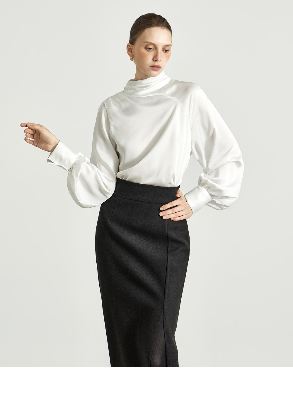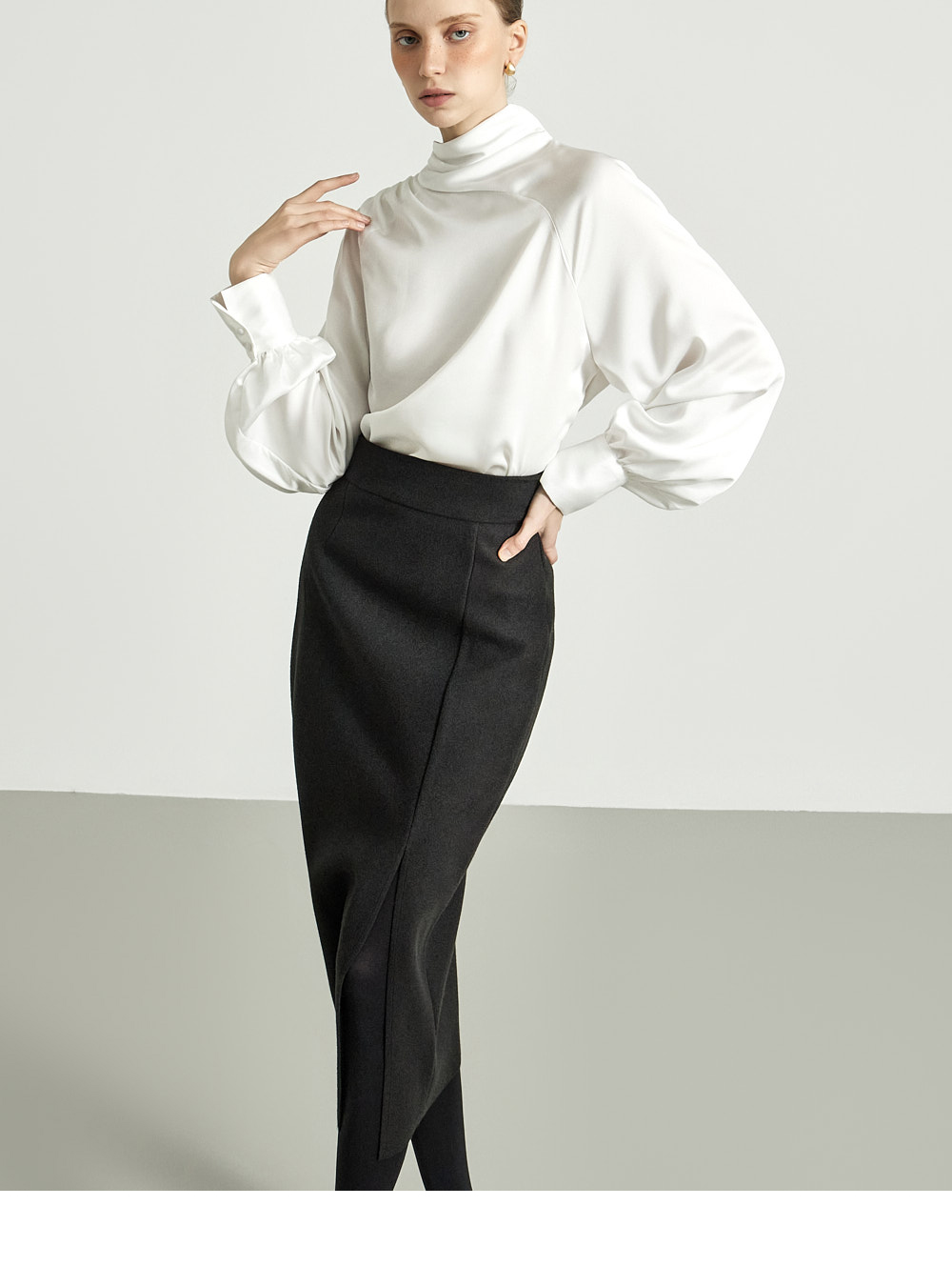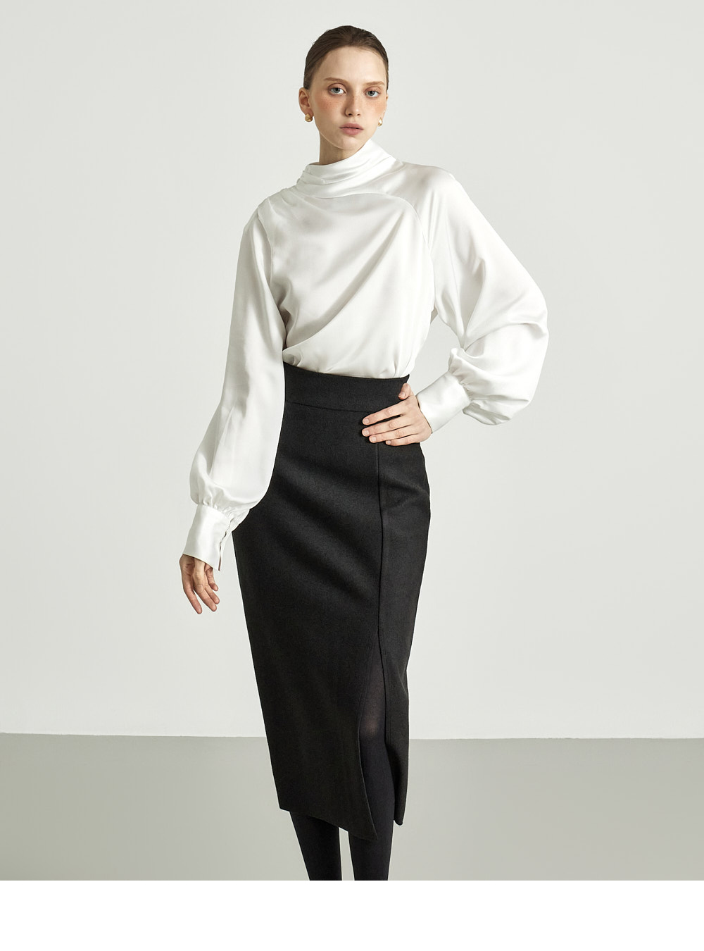 这是一款细节感十足、独特风格的半身裙。 采用结构感坚挺的高档聚酯与羊毛混纺材质制成,提供 S、M 两个尺码,可根据体型穿着。 后背隐形拉链设计,方便穿脱,高腰设计打造修长身形。 前侧边开衩提升活动性,斜裁线条保留自然剪裁的美感,优雅大方。高档灰色和必备黑色可选,无论经典风格或休闲造型均可轻松搭配。 推荐给 DINT 客户。 174CM 模特穿着 S 尺码,颜色为 BLACK。 注意事项 本产品采用自然裁剪工艺设计,无额外缝边处理。购买时请参考细节照片。