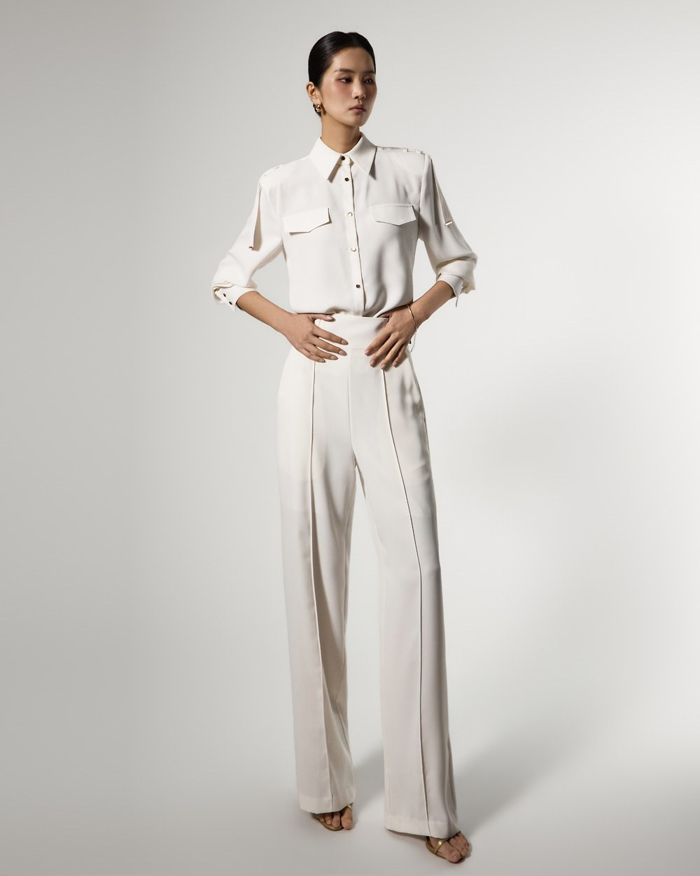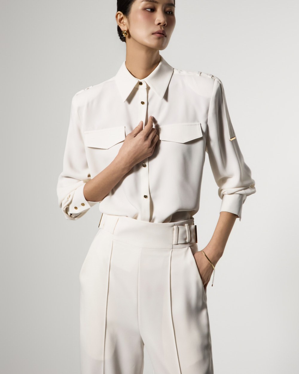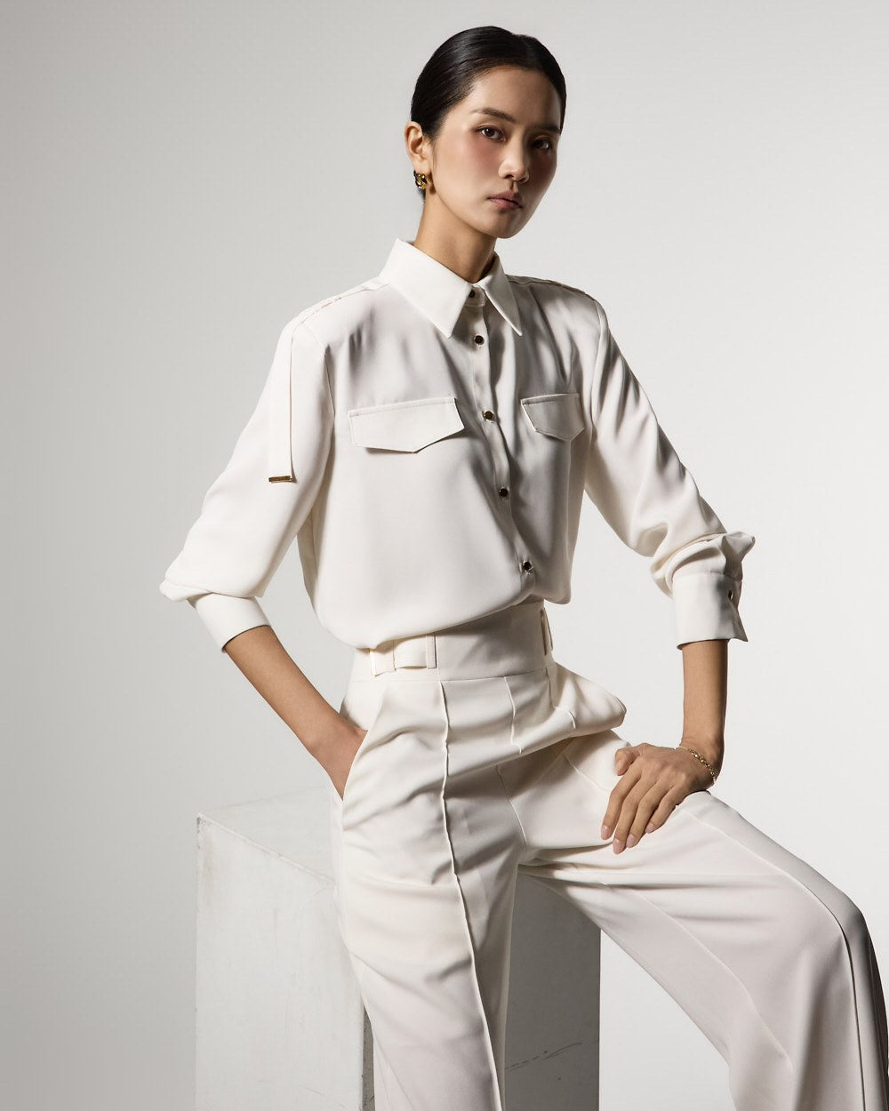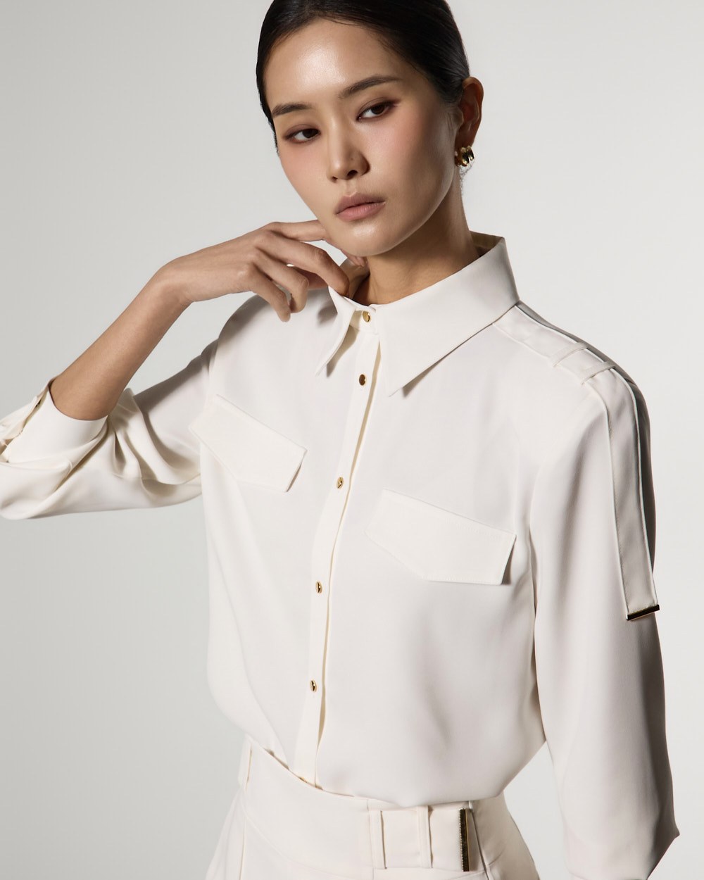 The addition of two buckles on the sleeves and pintuck pleat details completes the structured silhouette,