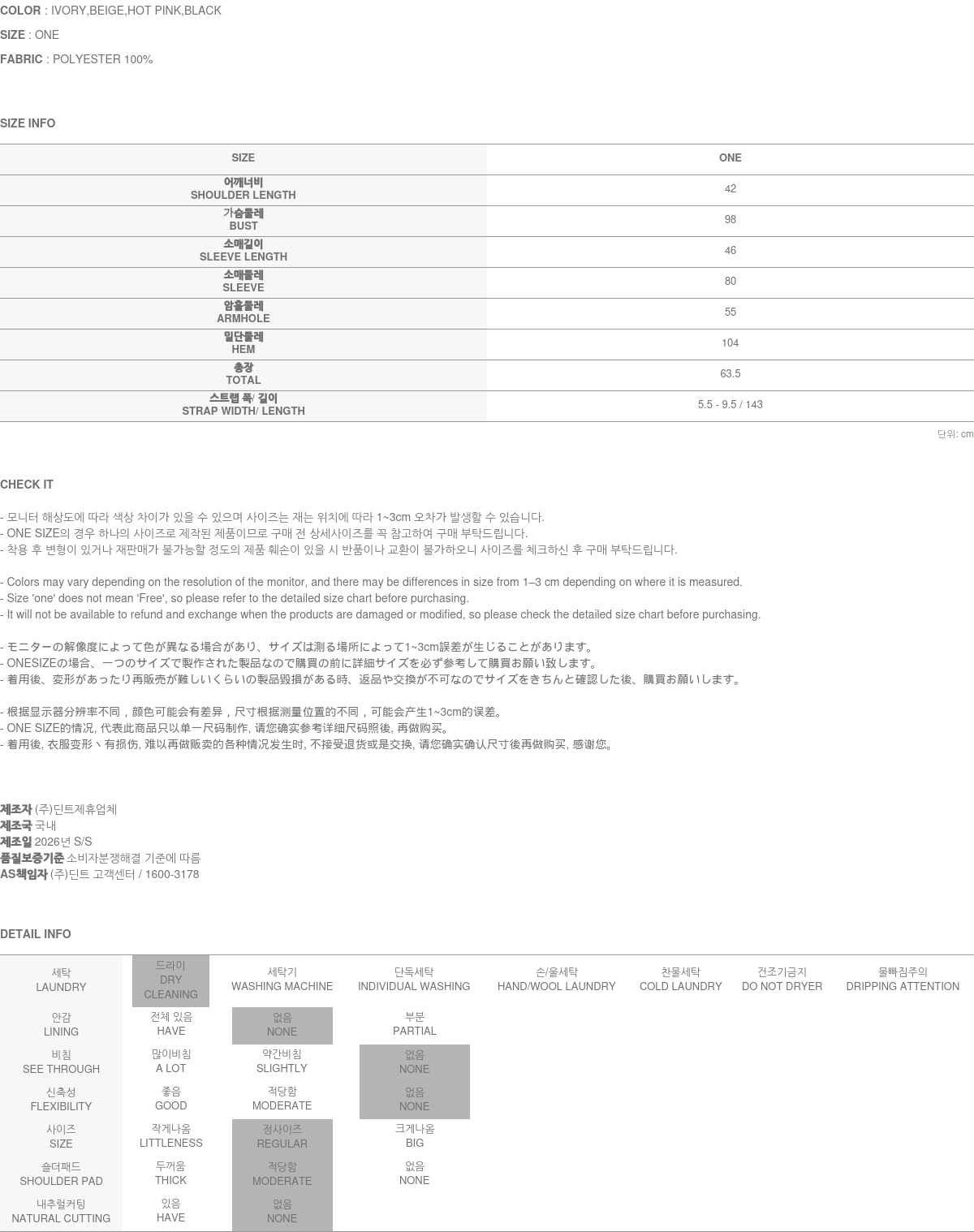 Clothing from DINT Co., Ltd. may become damaged or deformed if machine washed or tumble dried. We strongly recommend following the care instructions provided below.