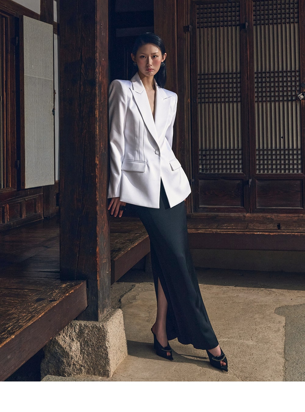 Featuring a front button closure, it exudes a classic and refined mood.