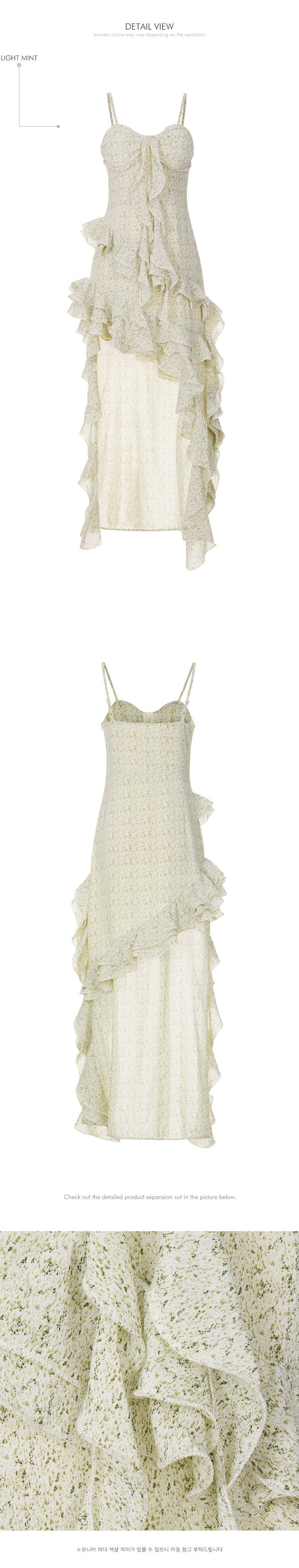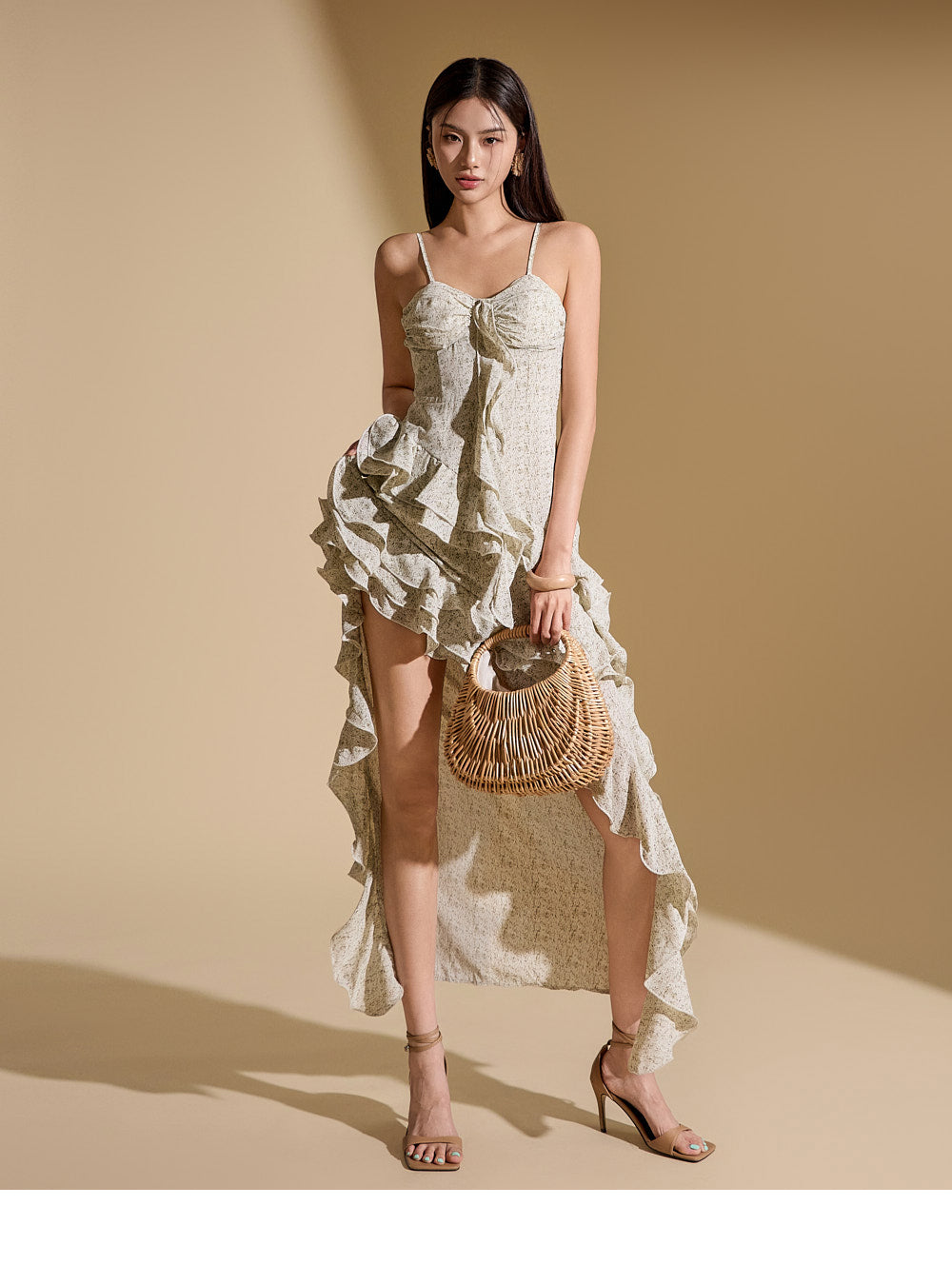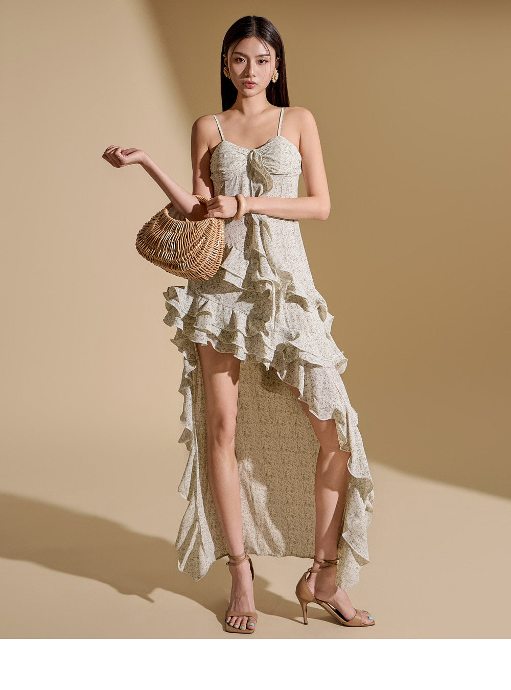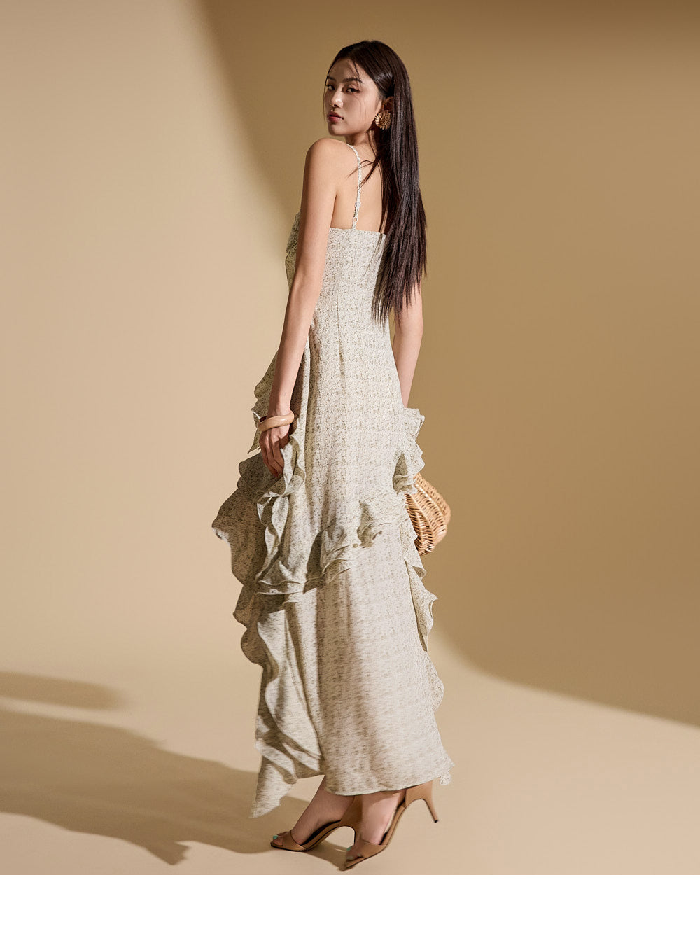 while the asymmetrical, flowing ruffle details enhance the style.