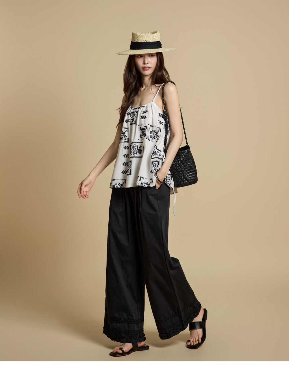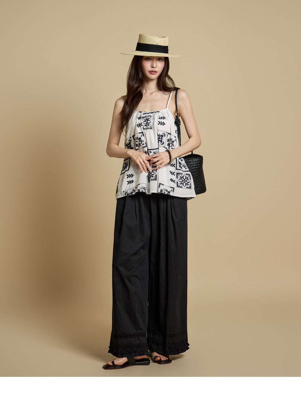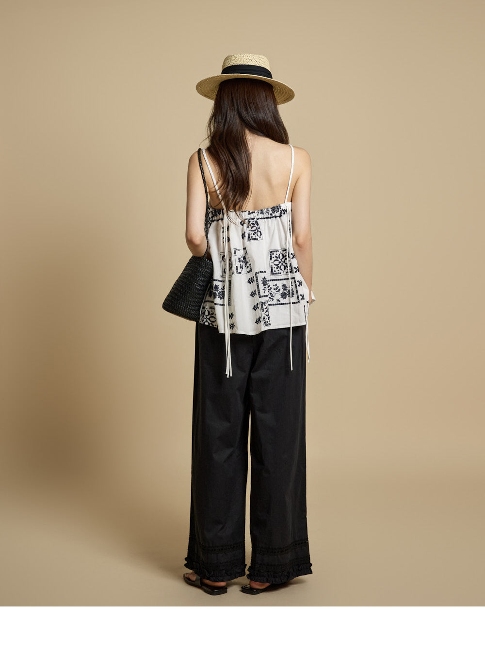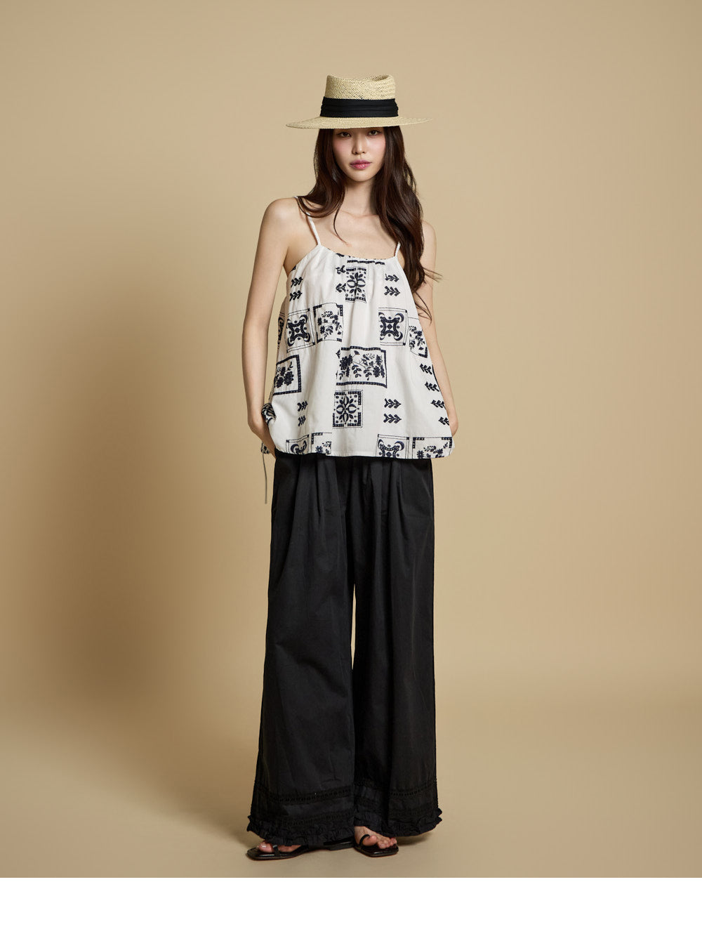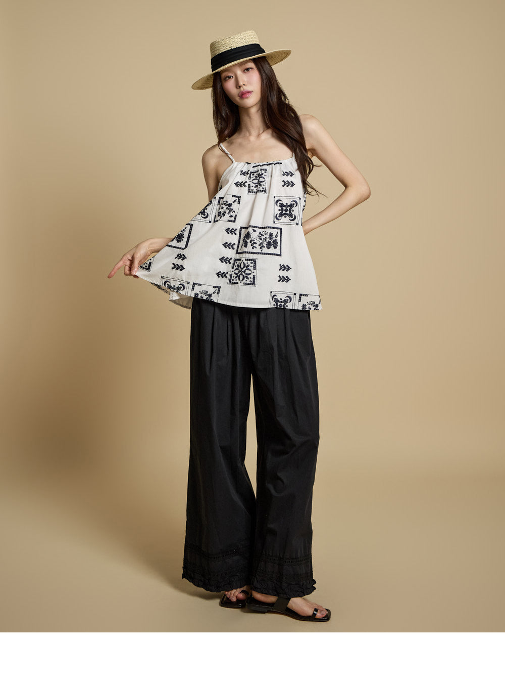 The bottoms are pintuck wide pants with embroidery at the hem,