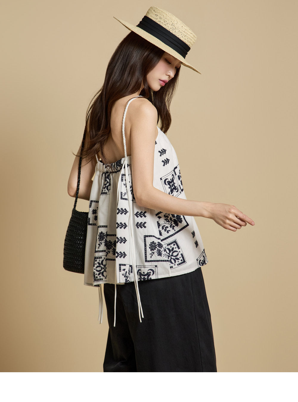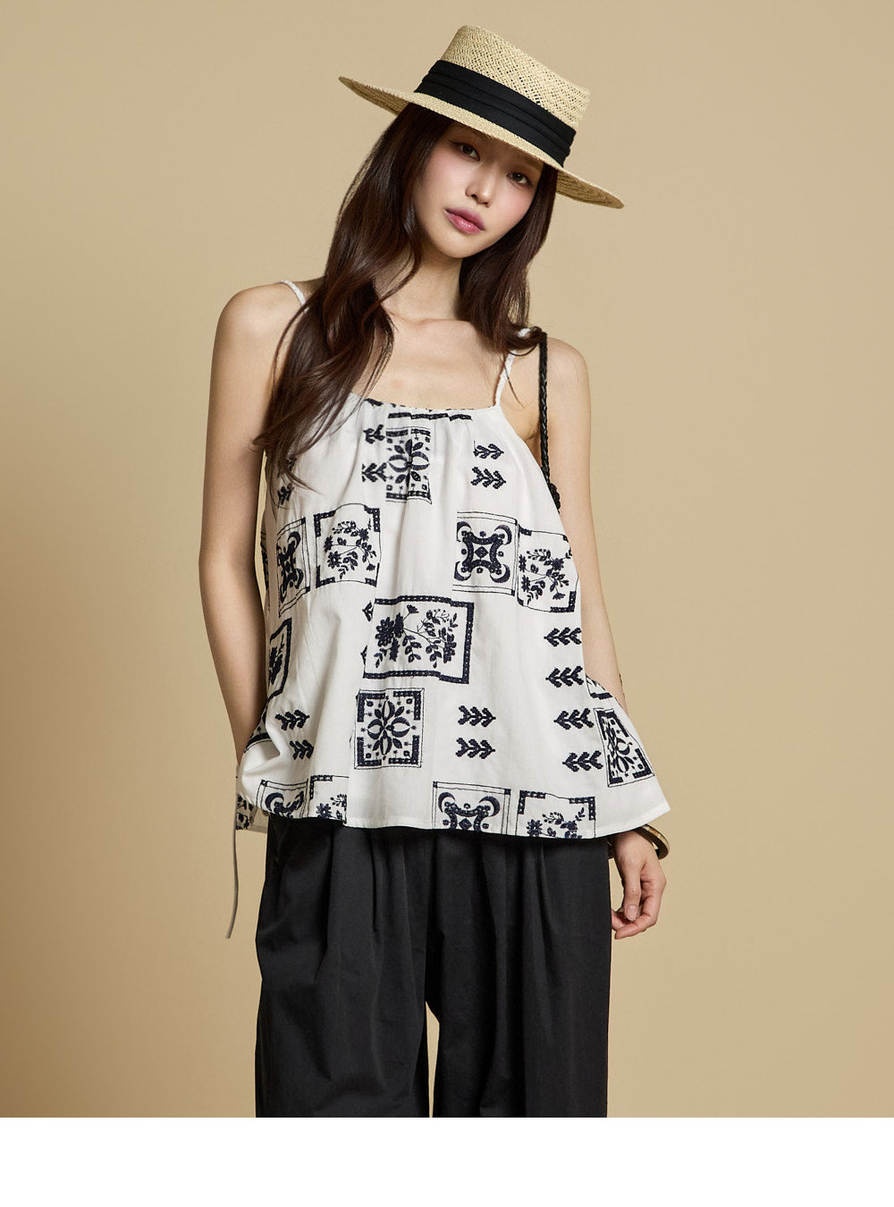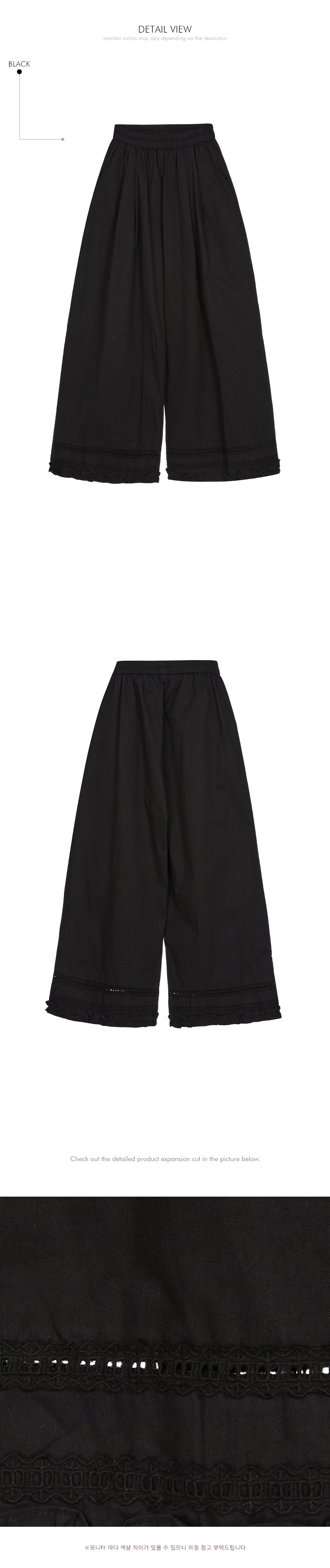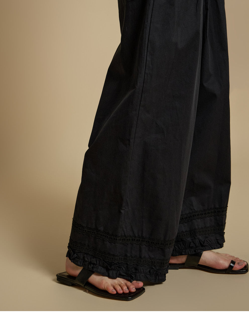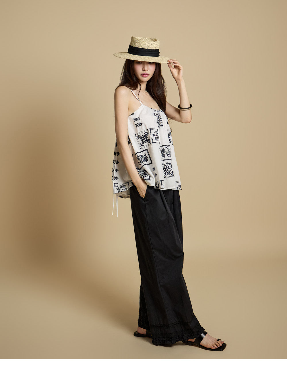 The bottoms are pintuck wide pants with embroidery at the hem,