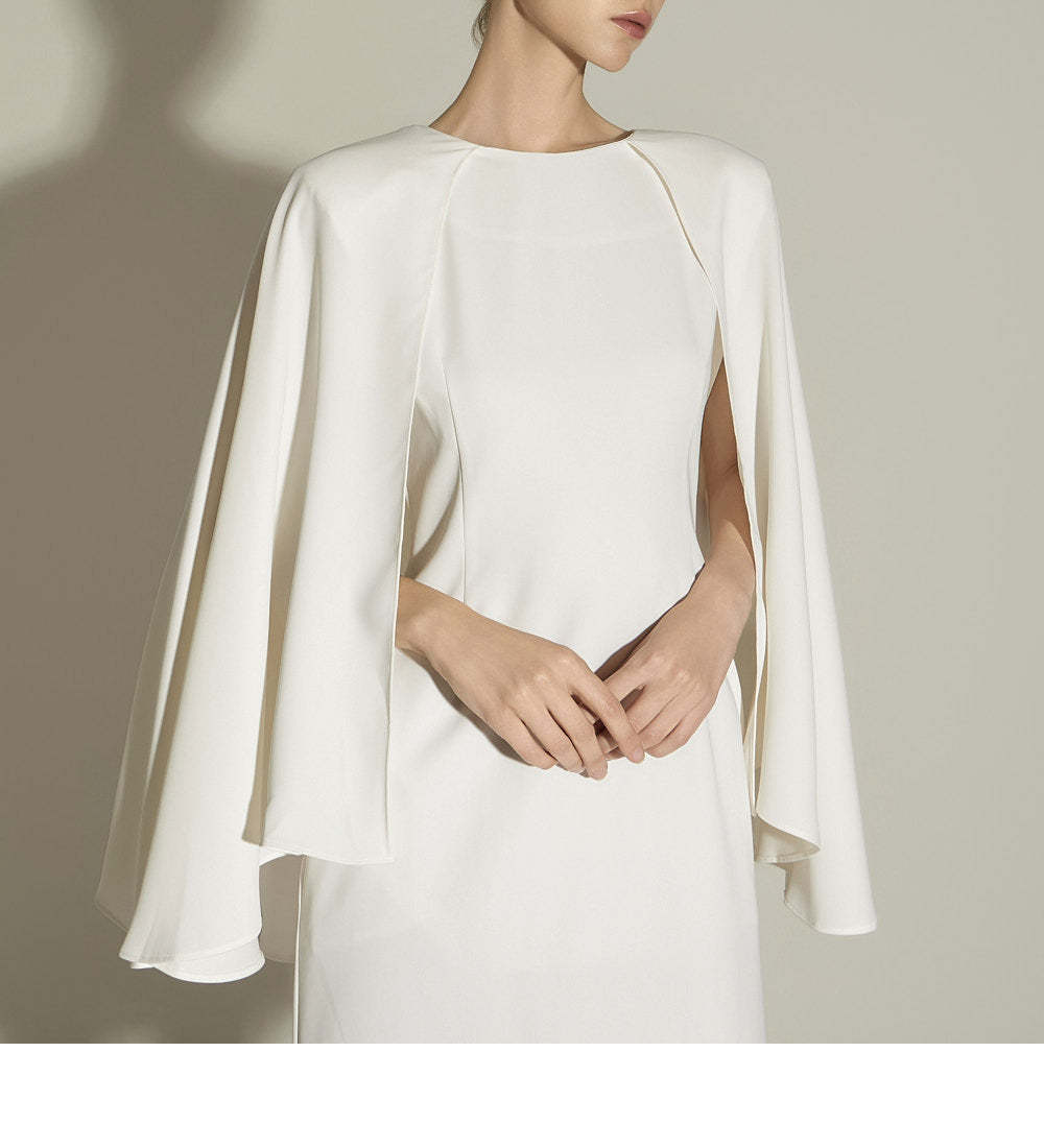 The sleeveless design with cape sleeves creates an elegant silhouette,
