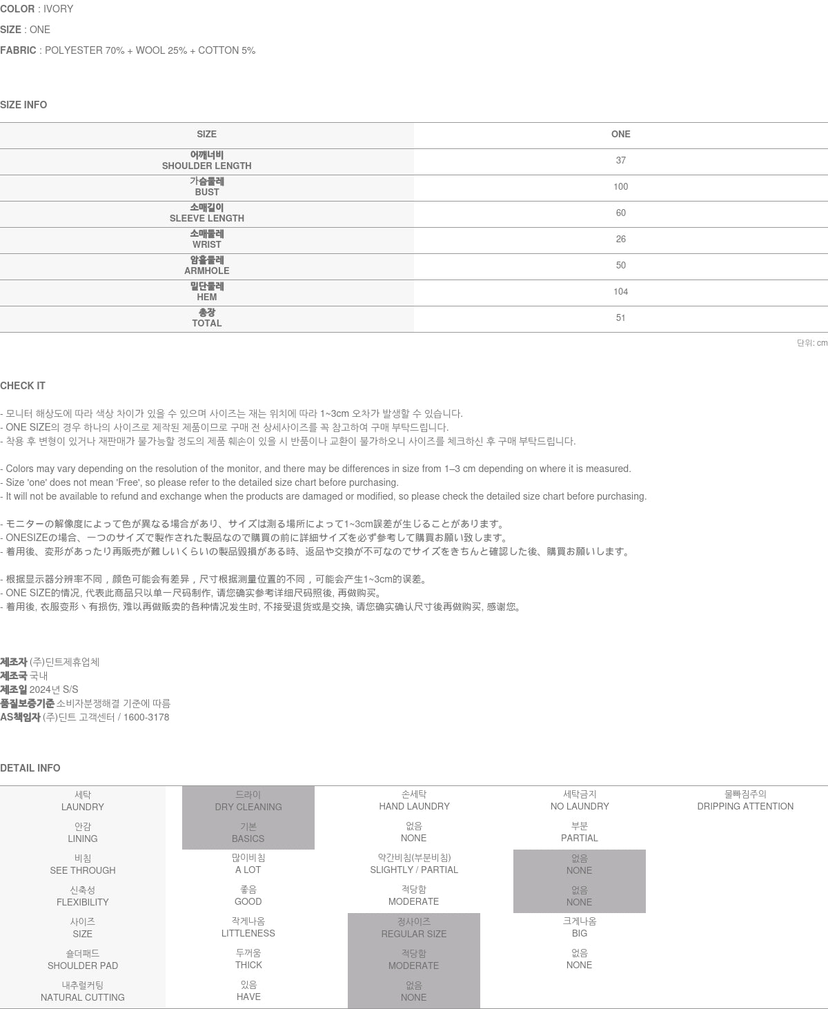 The 168CM model wore ONE size in IVORY color.