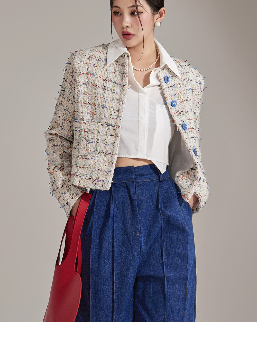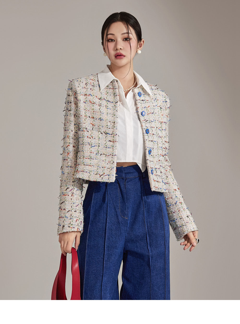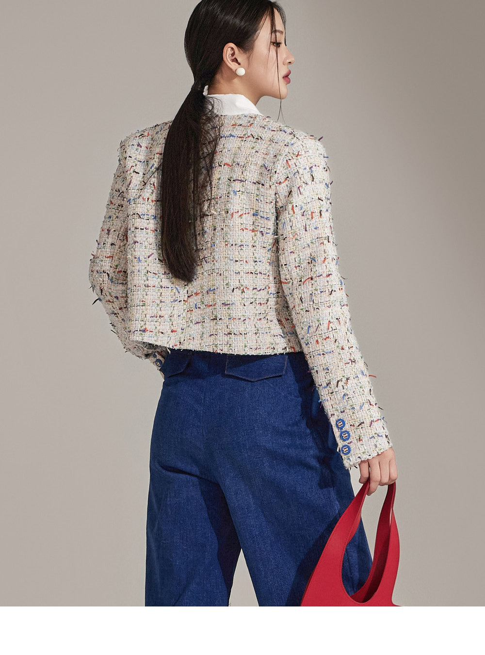 Featuring a tweed-like texture, this single jacket adds a stylish mood,