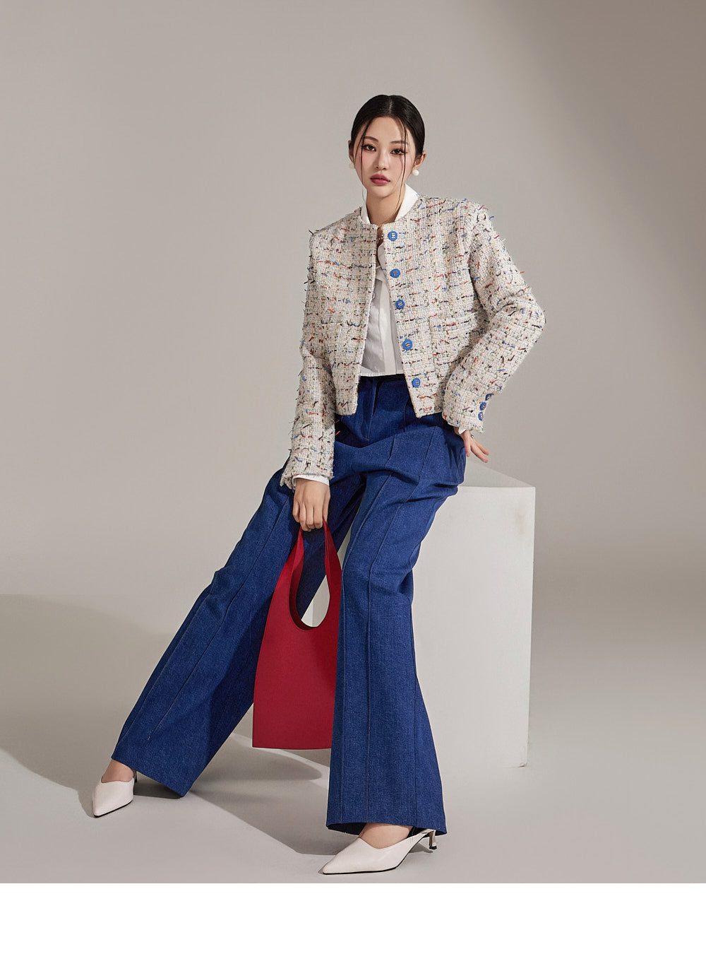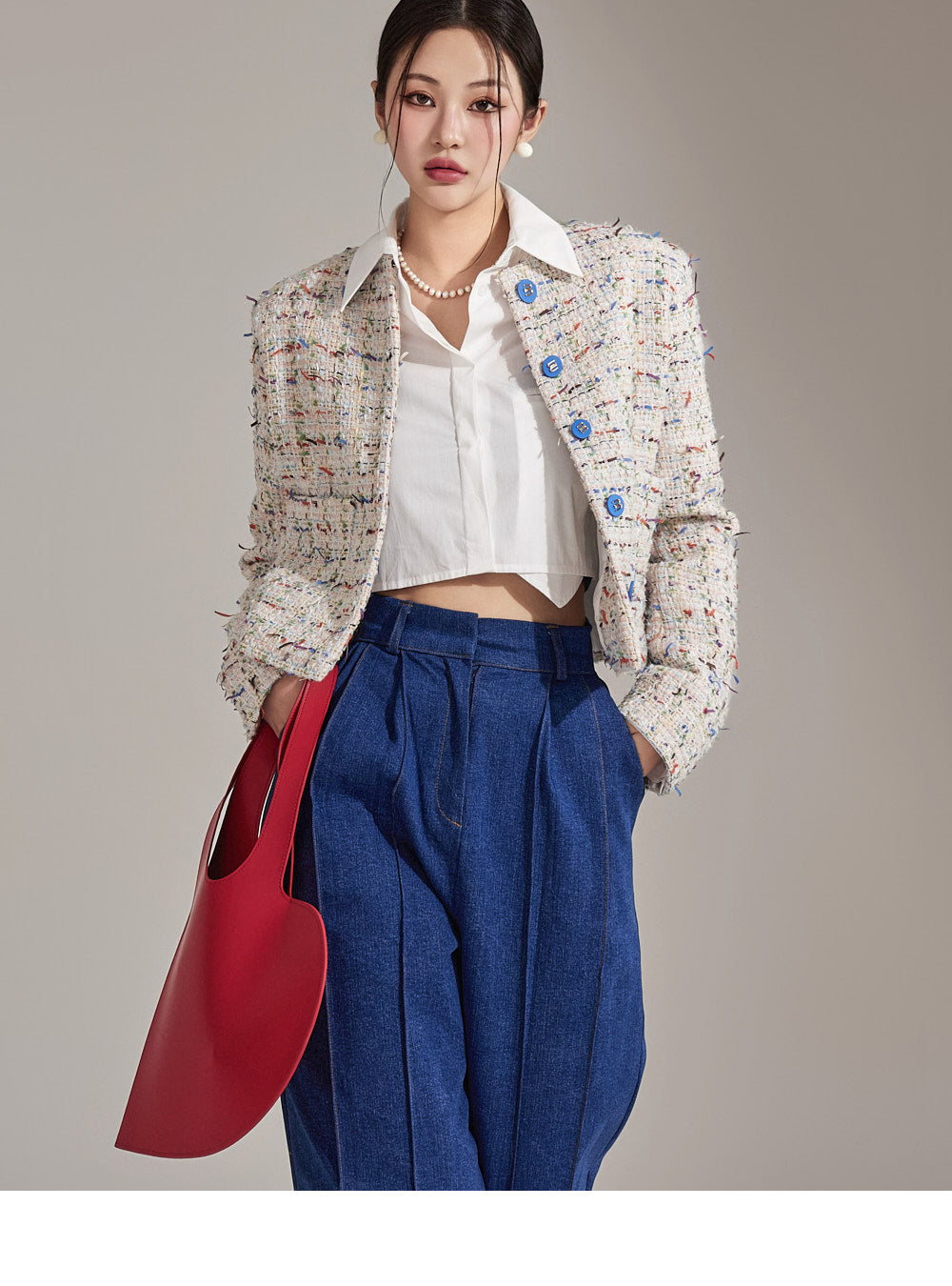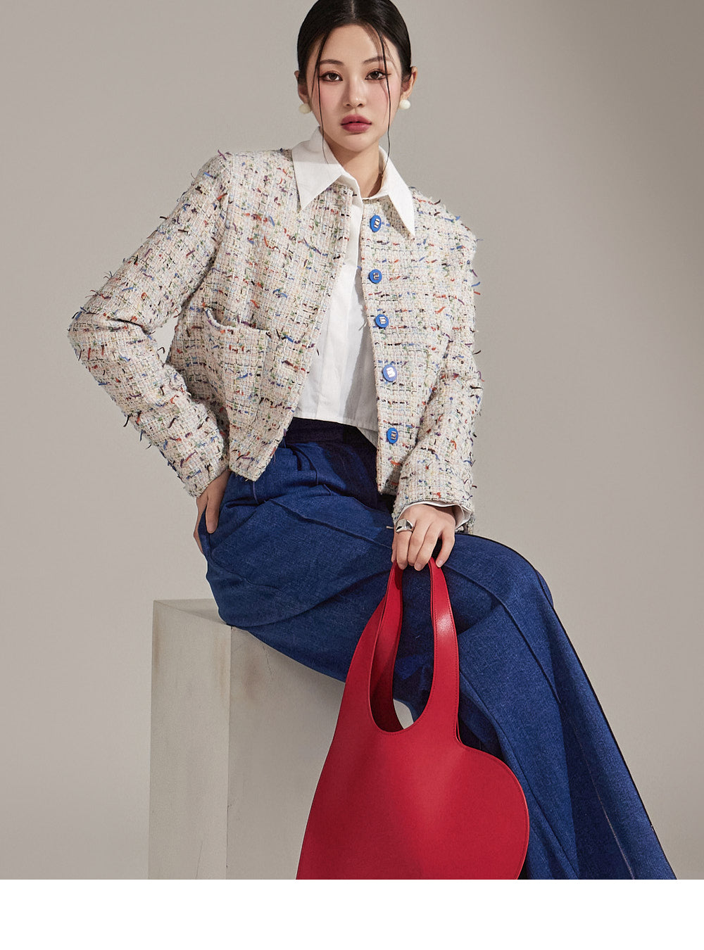 Featuring a tweed-like texture, this single jacket adds a stylish mood,