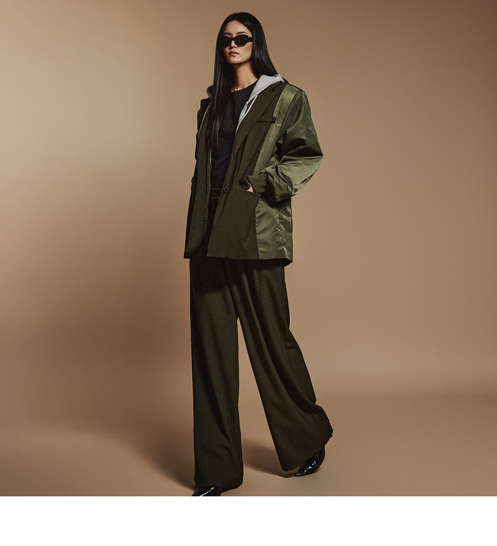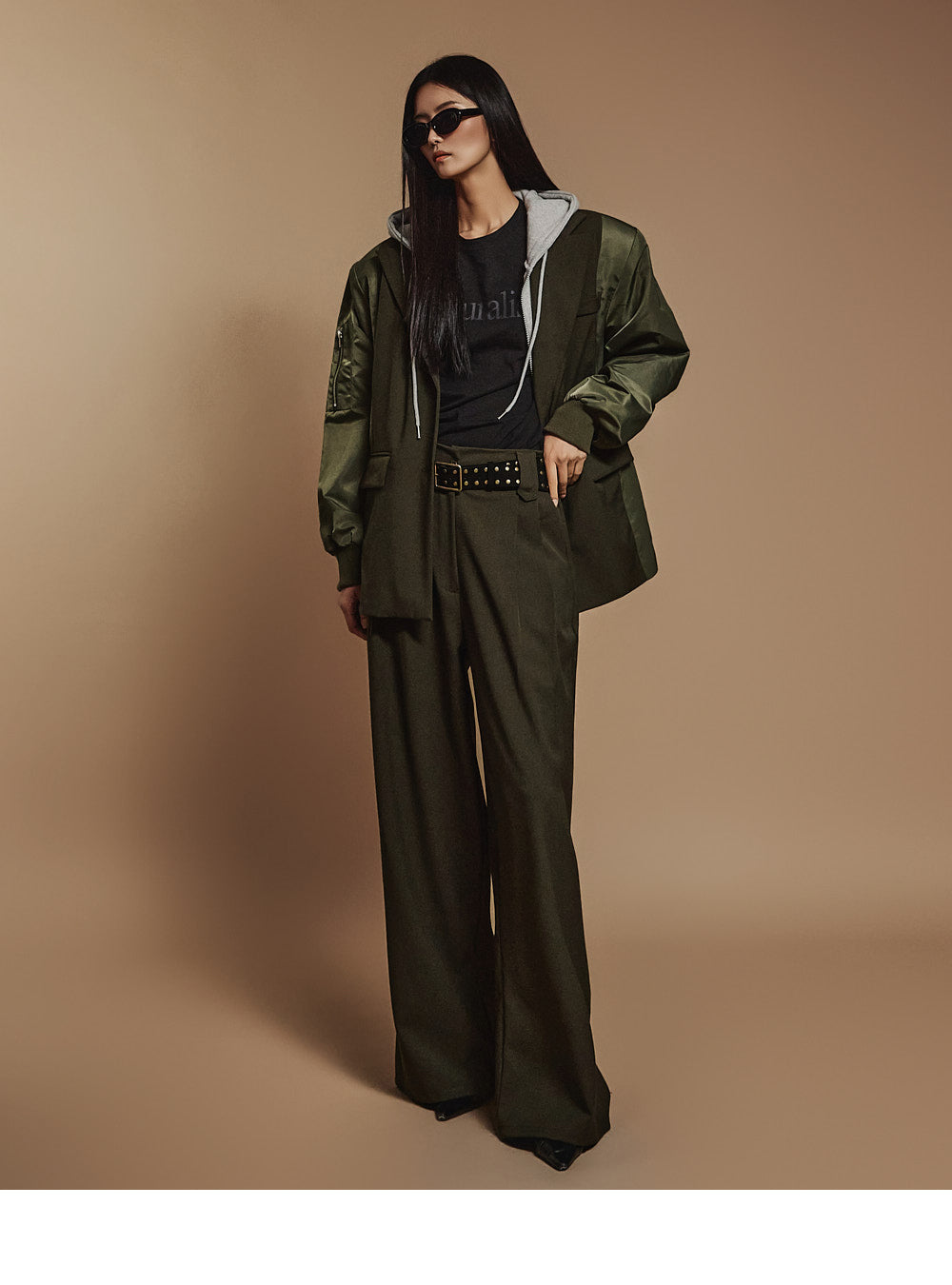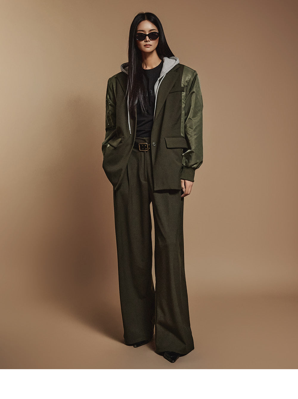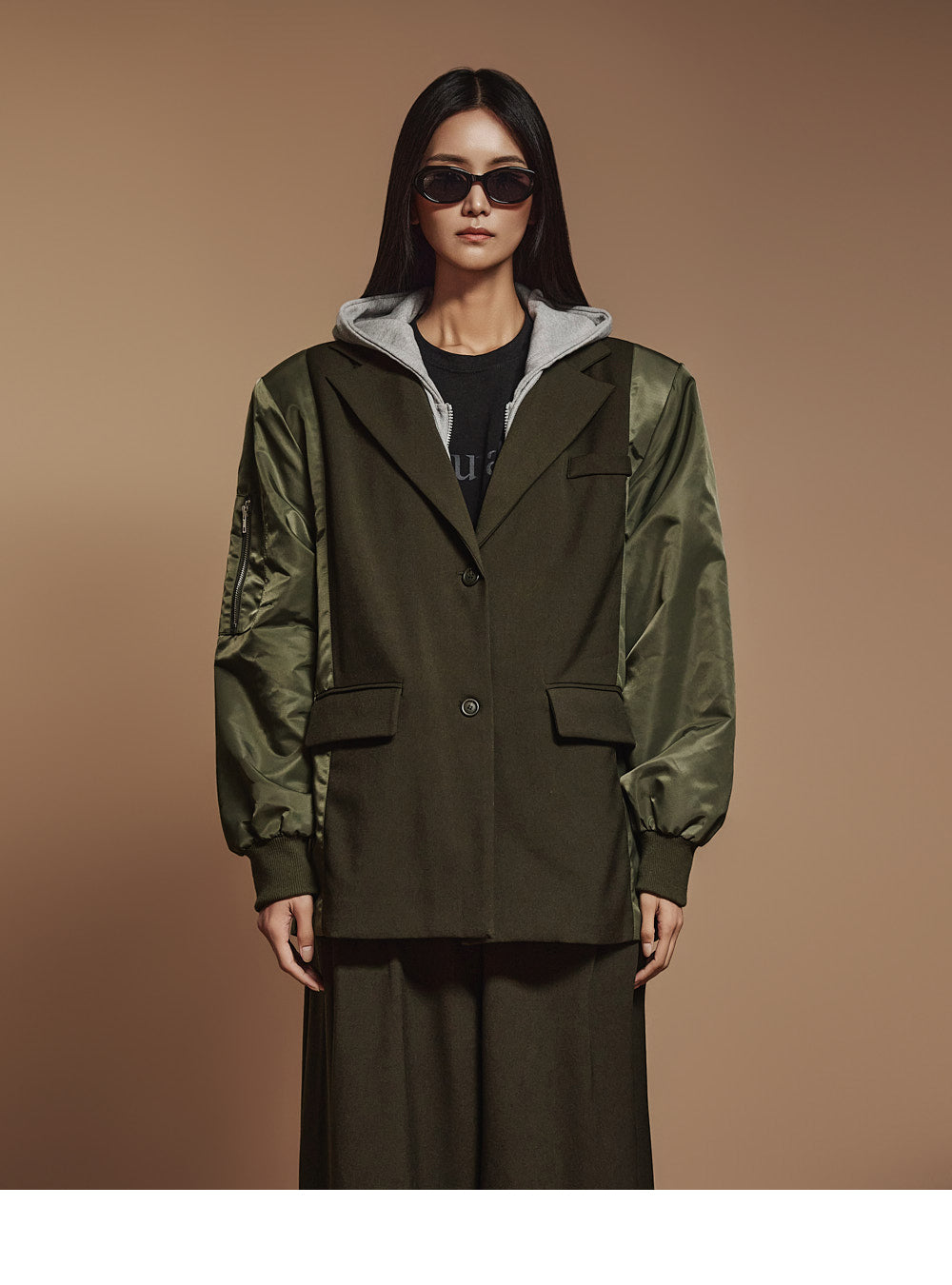The shoulder pads add a voluminous silhouette,