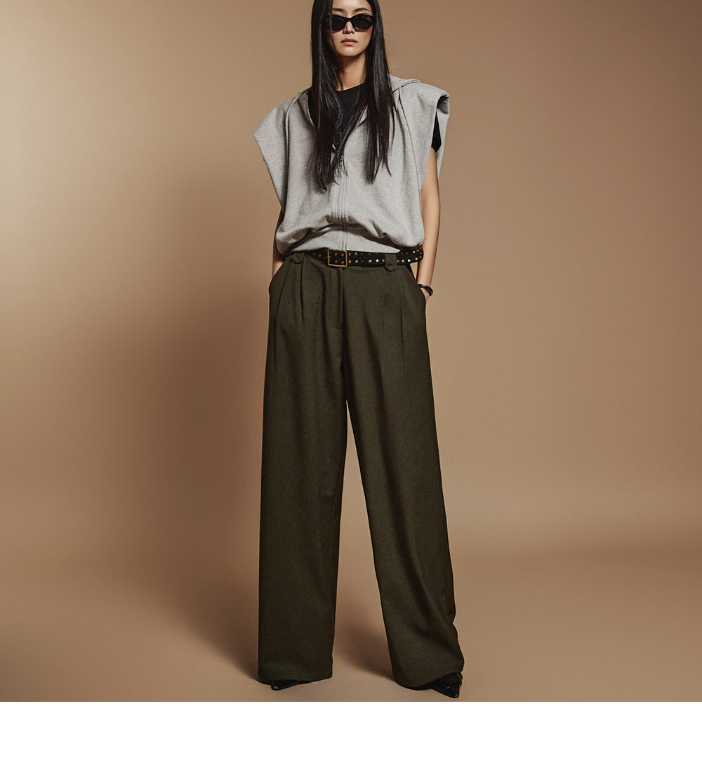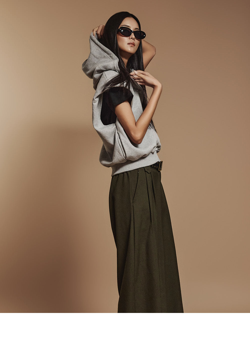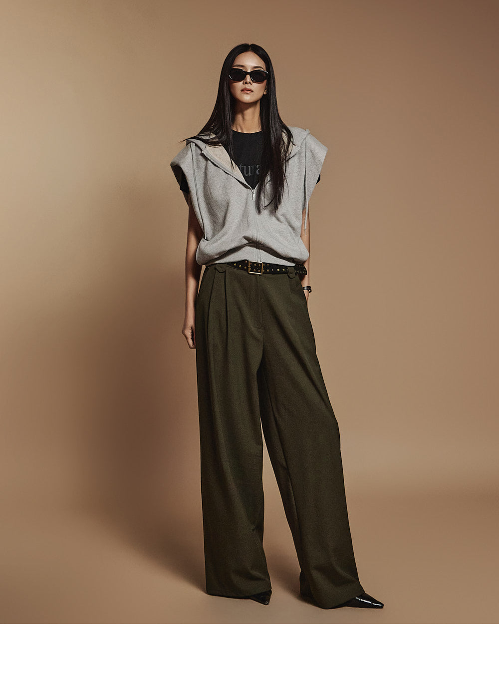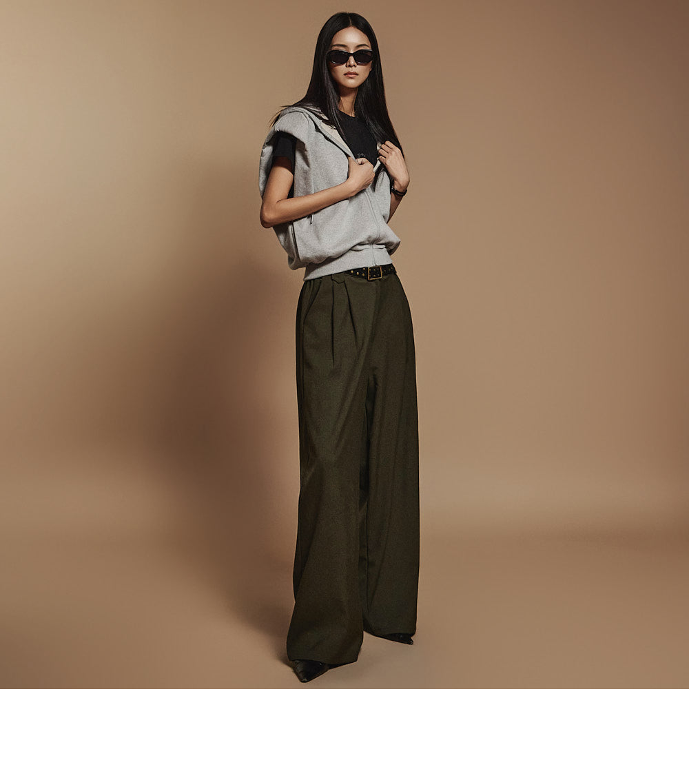 The shoulder pads add a voluminous silhouette,
