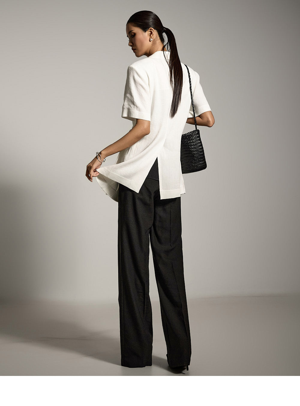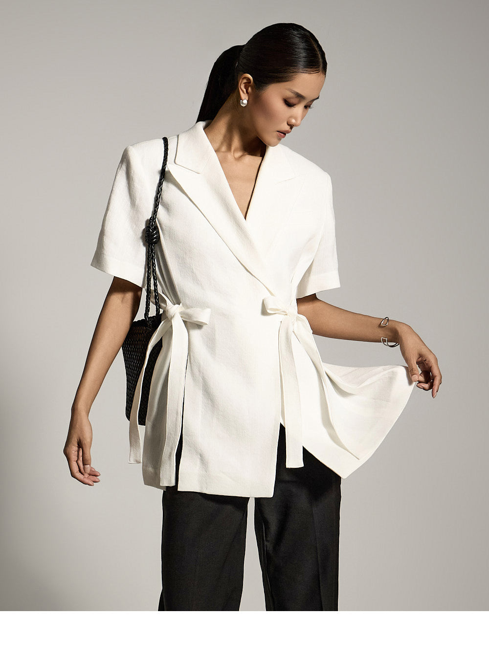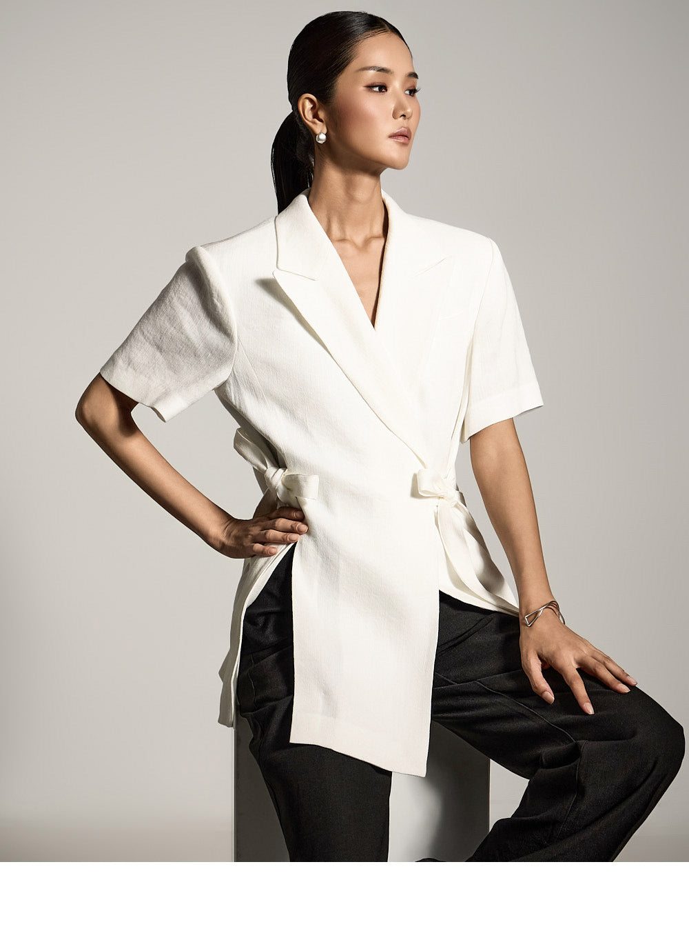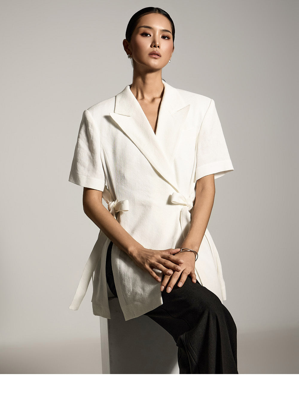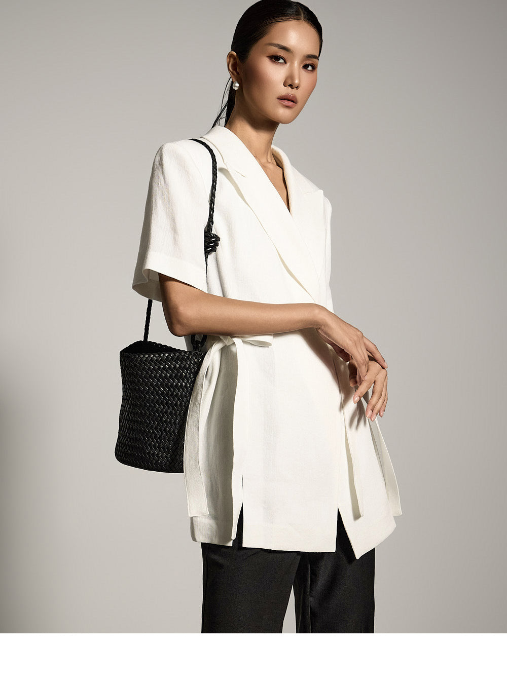 structured silhouette, while the relaxed boxy fit allows for easy,