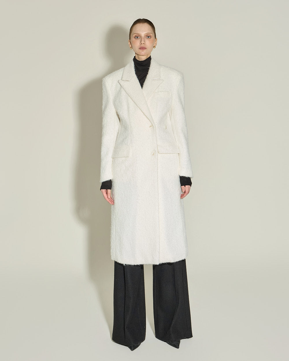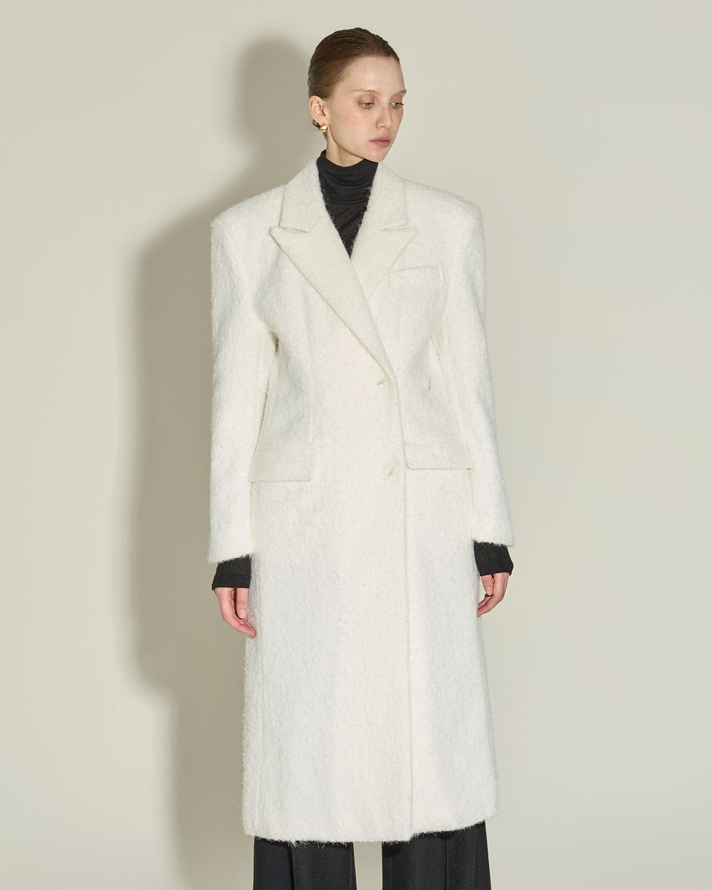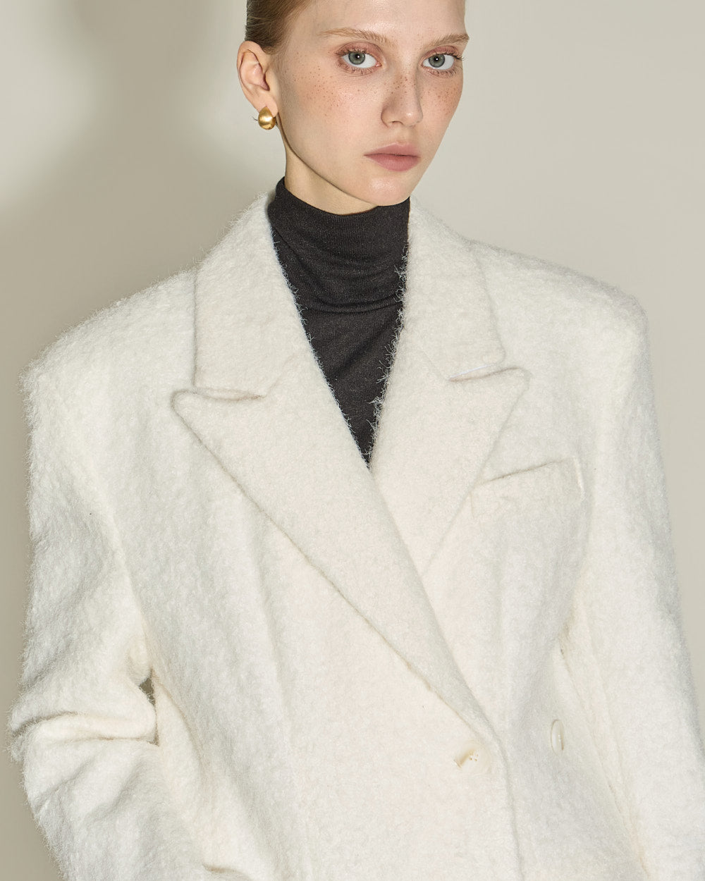 This elegant boucle wool coat exudes elegance.