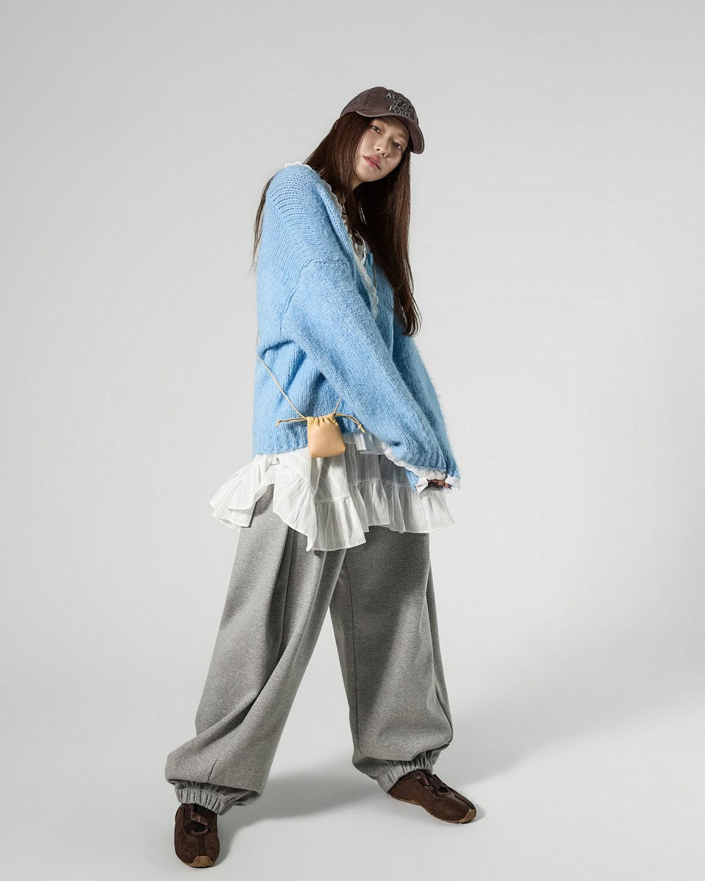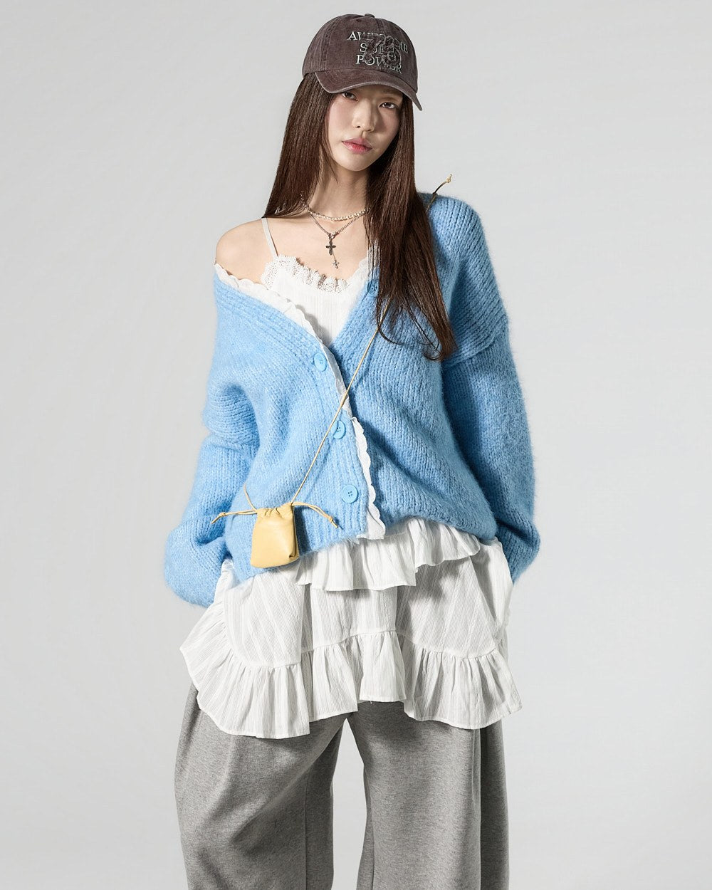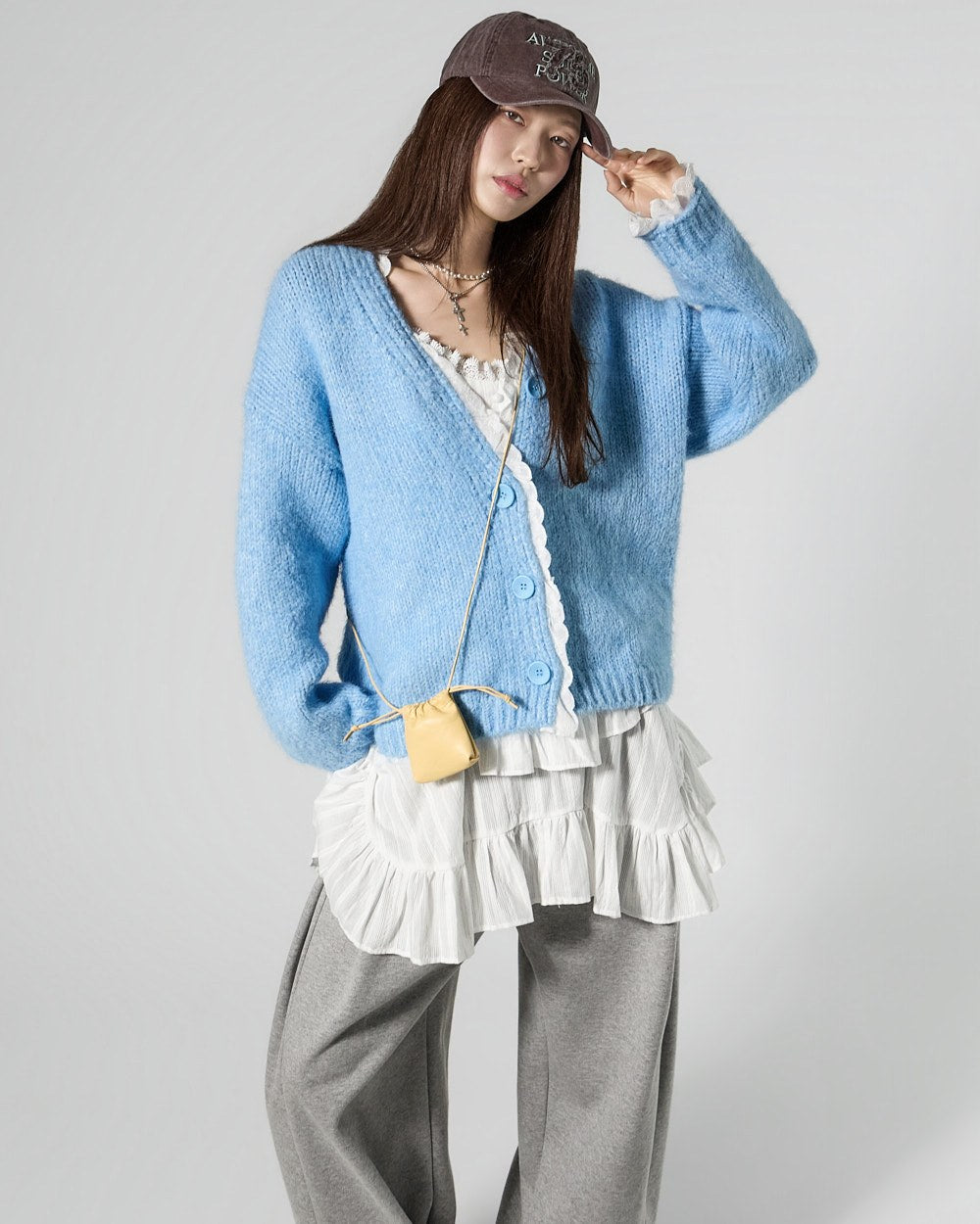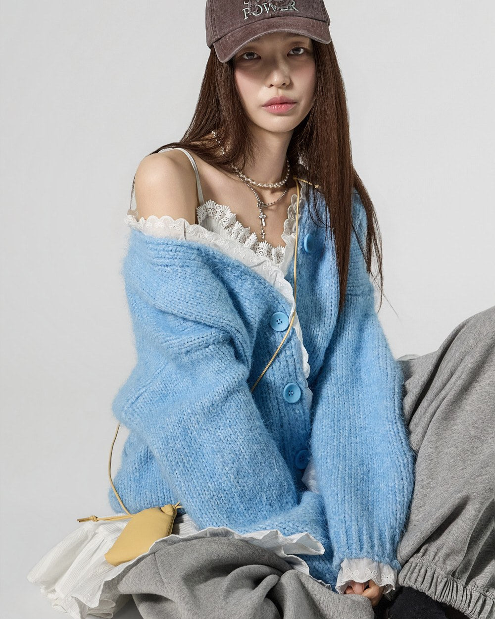 The 171cm model is wearing size ONE in SKY BLUE.