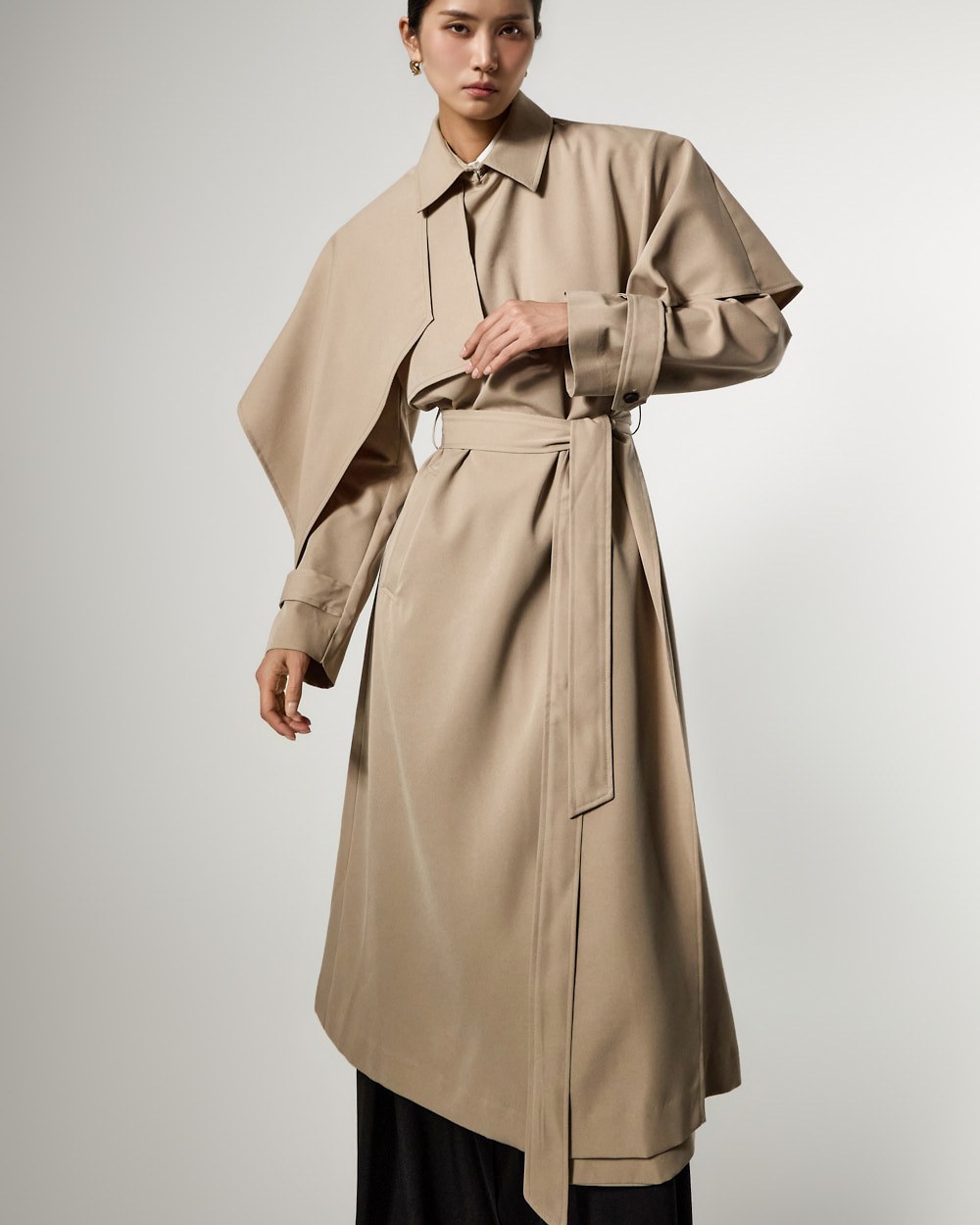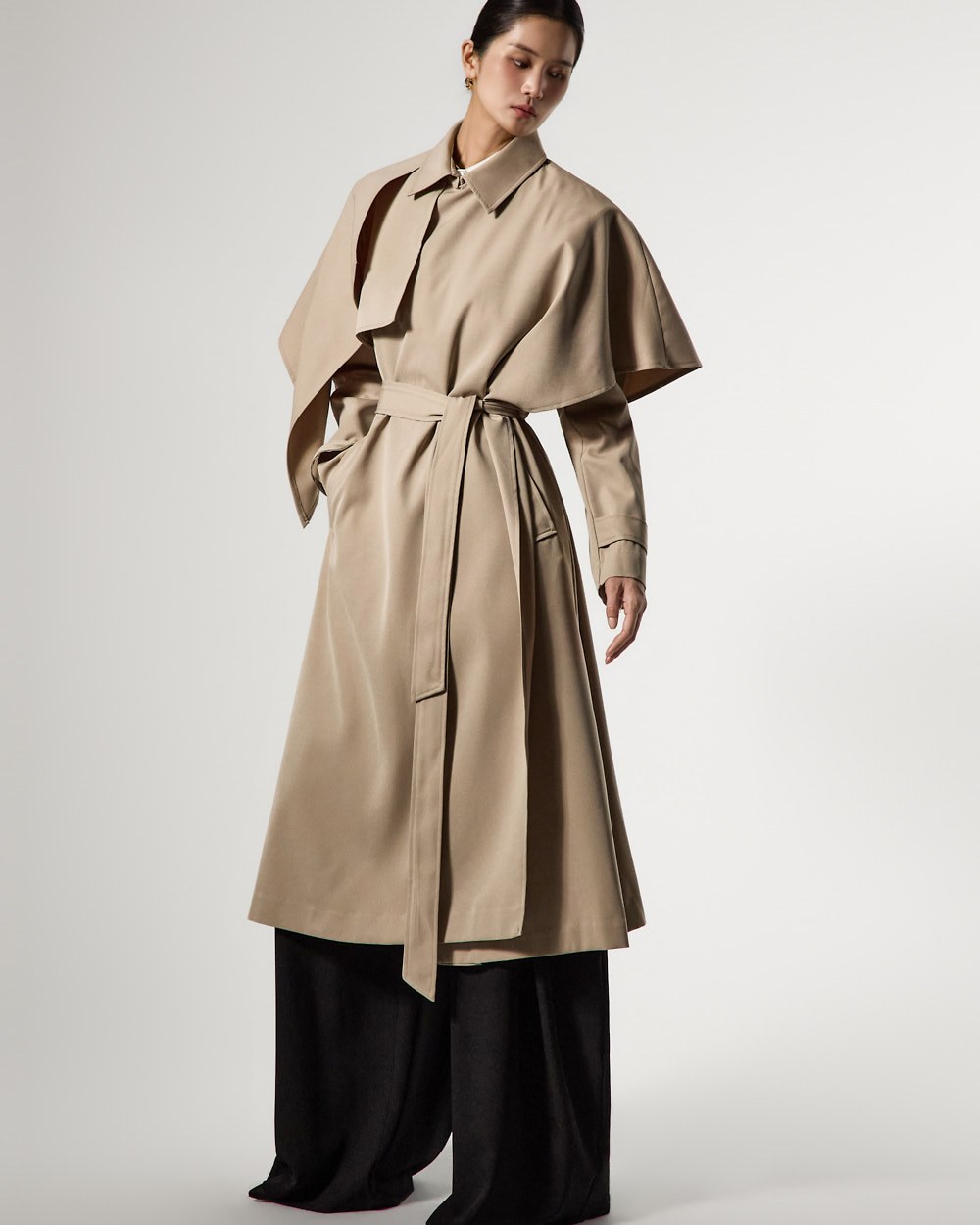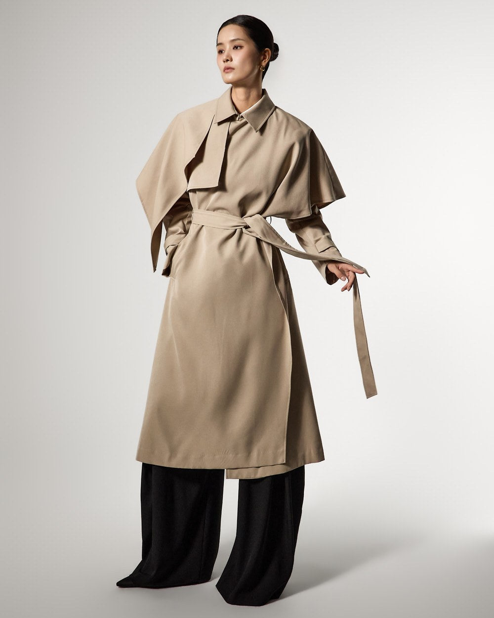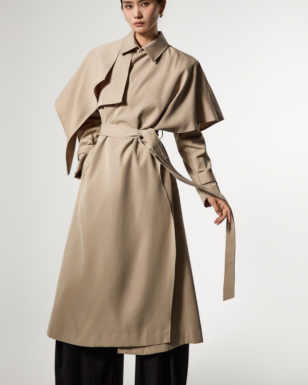 This is an asymmetrical cape trench coat with a modern casual vibe.