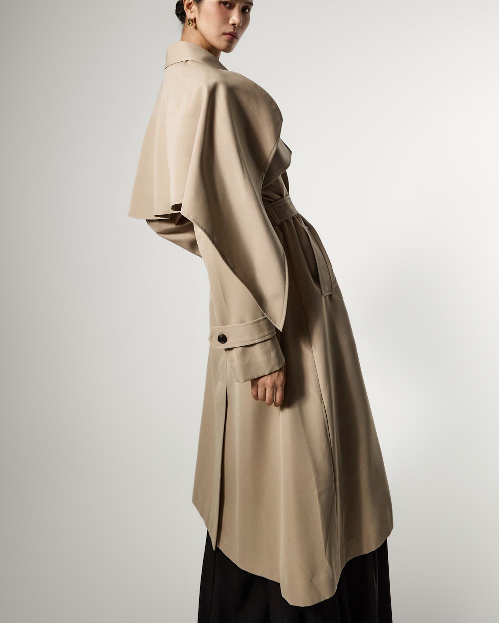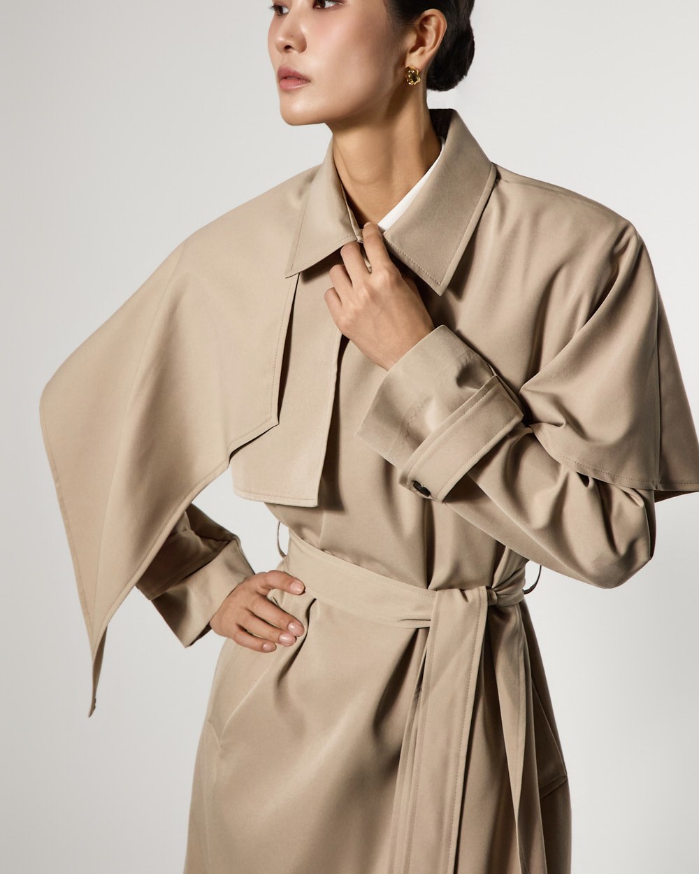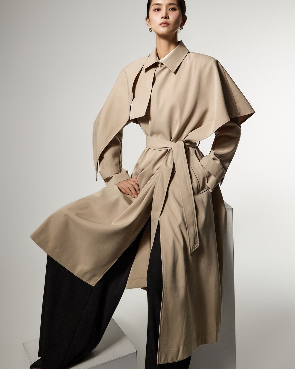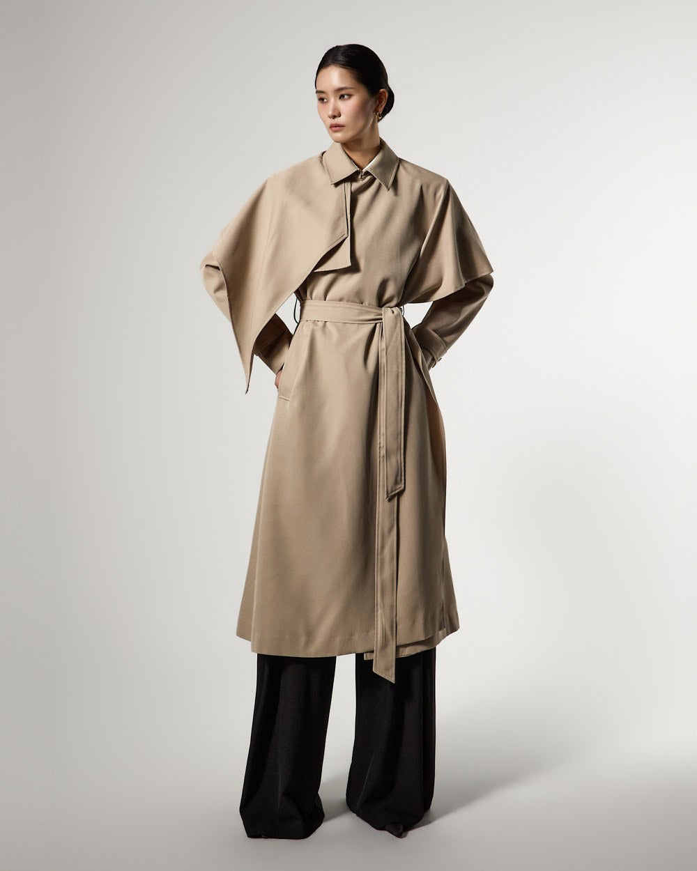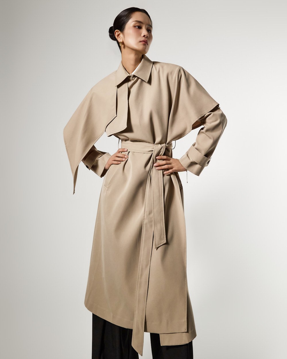 This is an asymmetrical cape trench coat with a modern casual vibe.