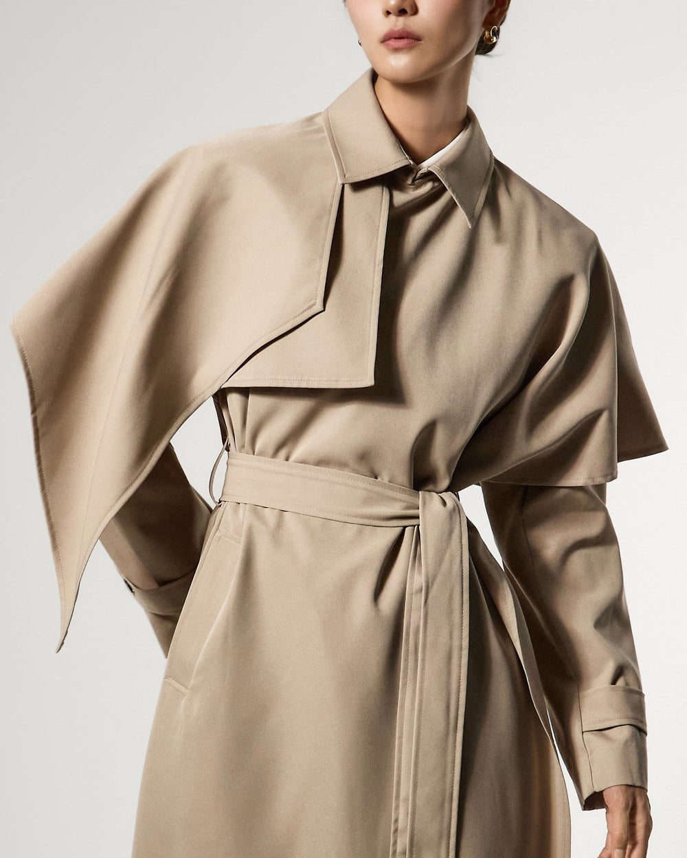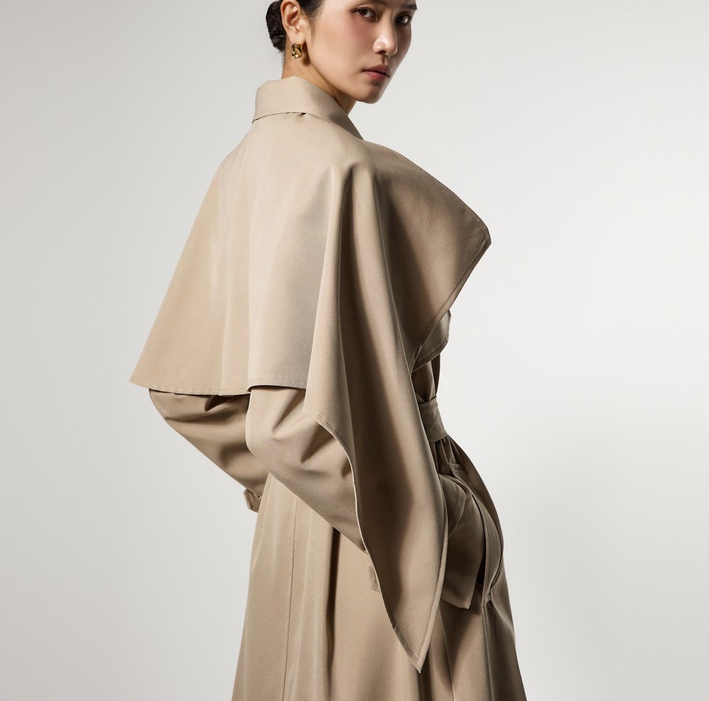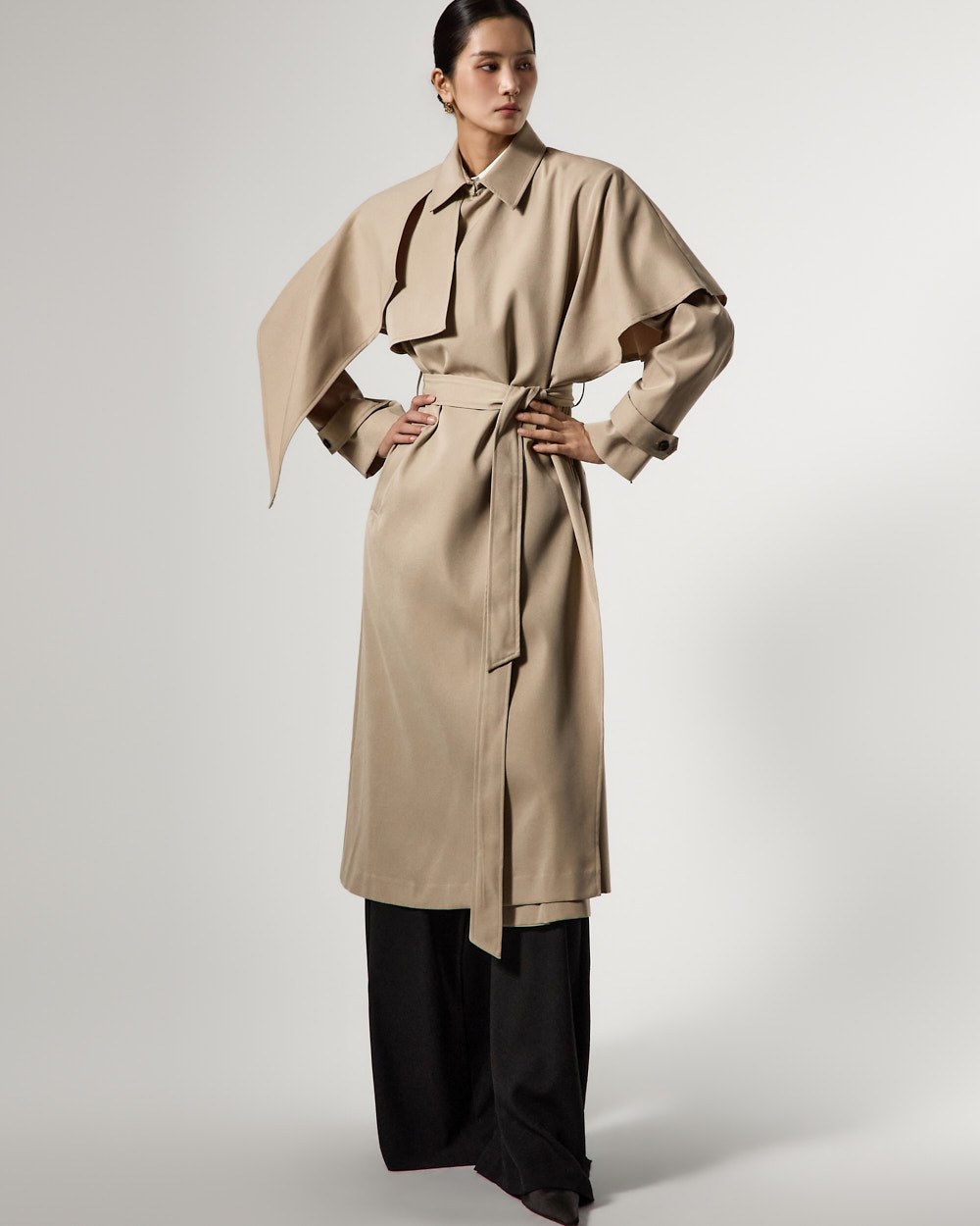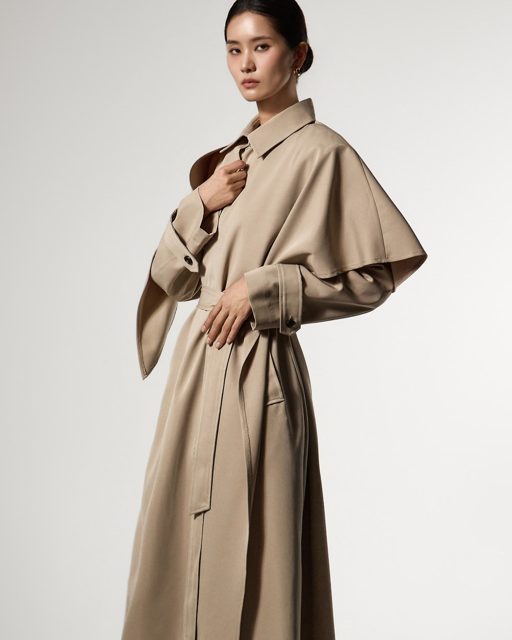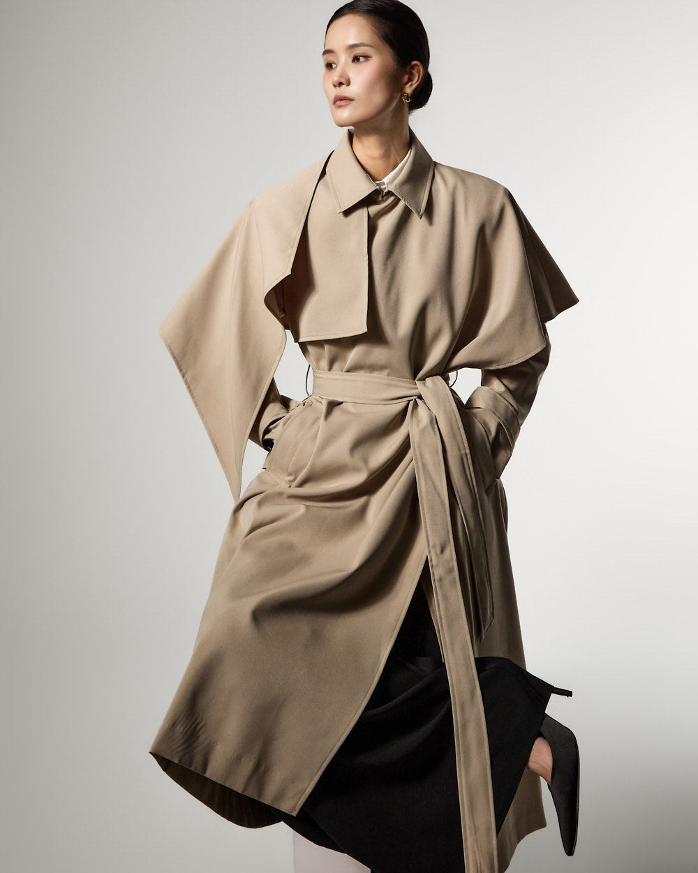This is an asymmetrical cape trench coat with a modern casual vibe.