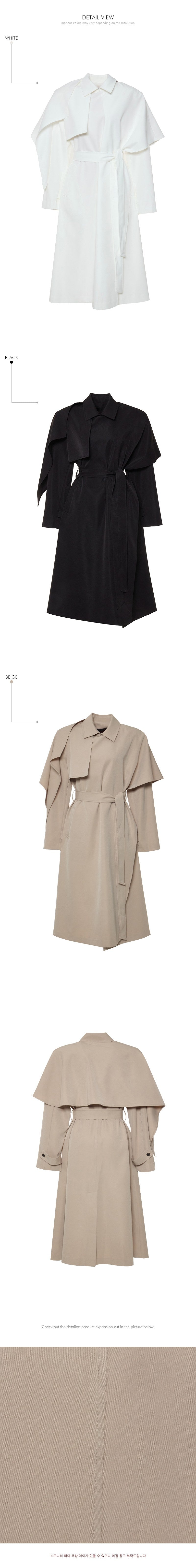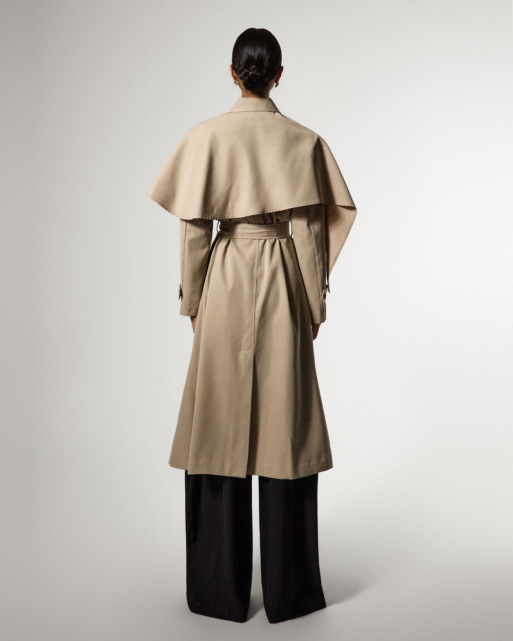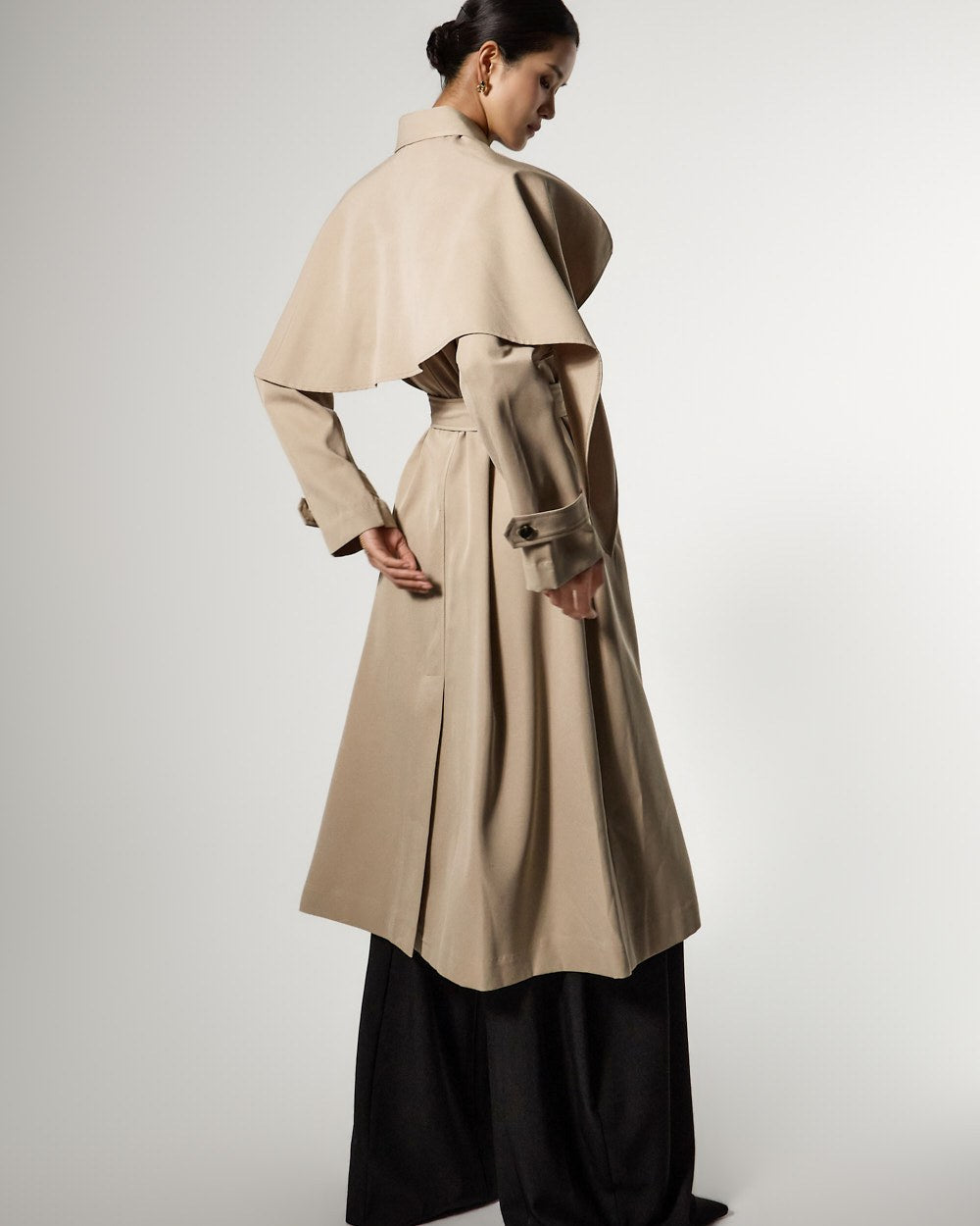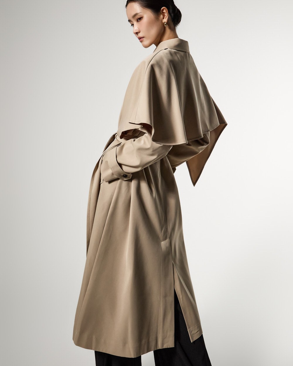 This is an asymmetrical cape trench coat with a modern casual vibe.