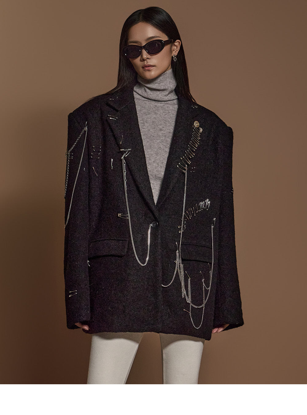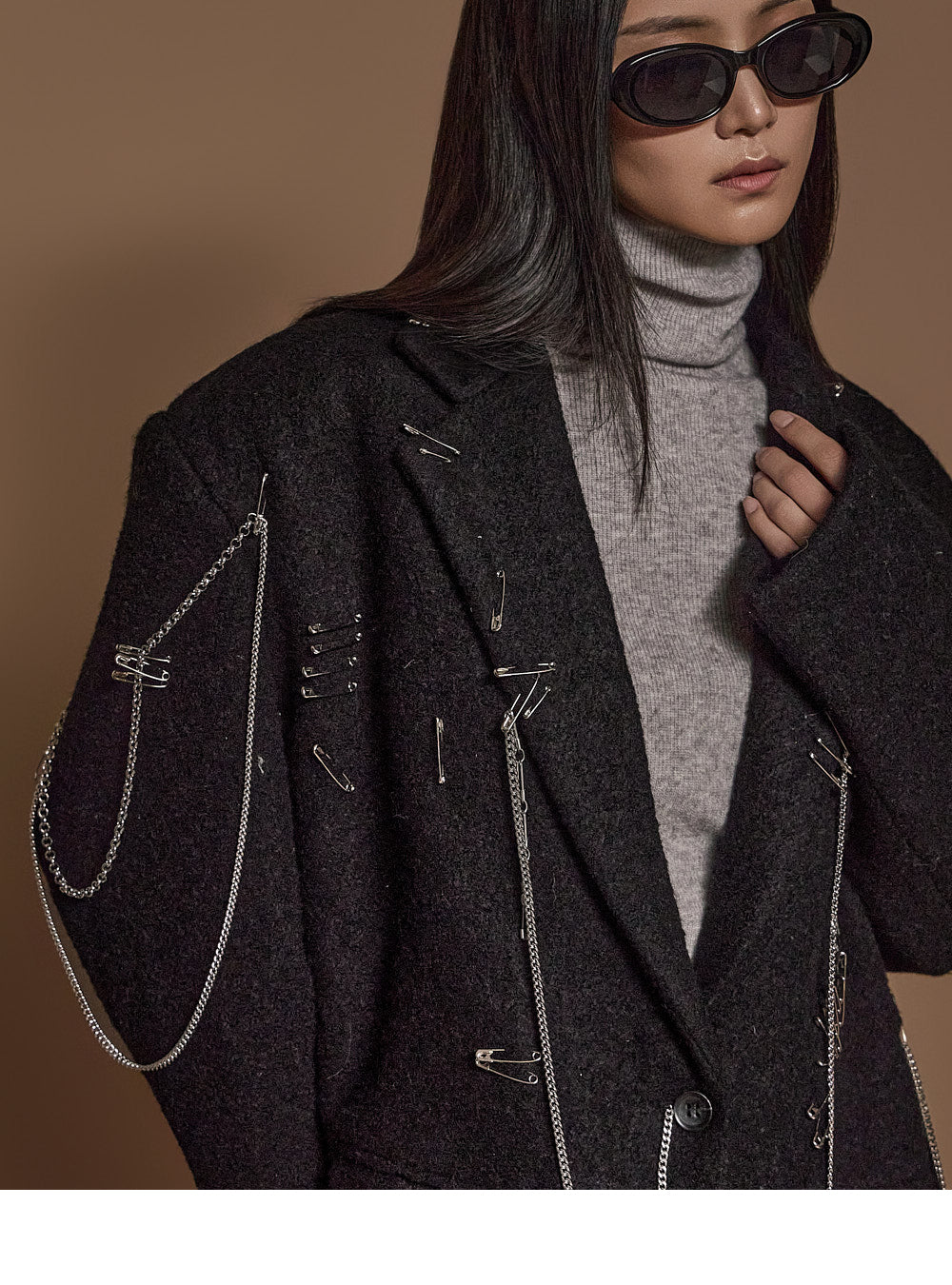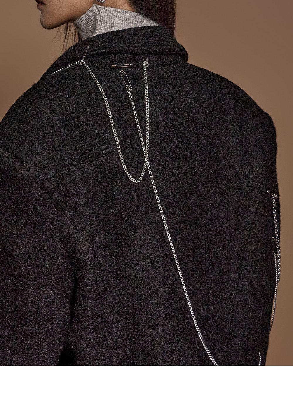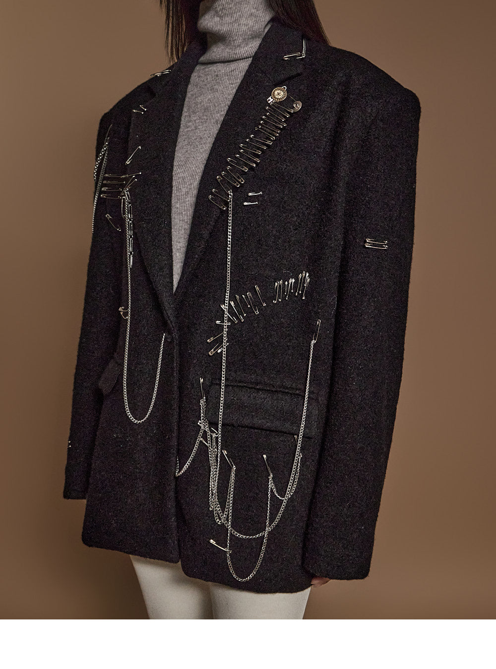 The chain and pin brooch details add a unique touch.????