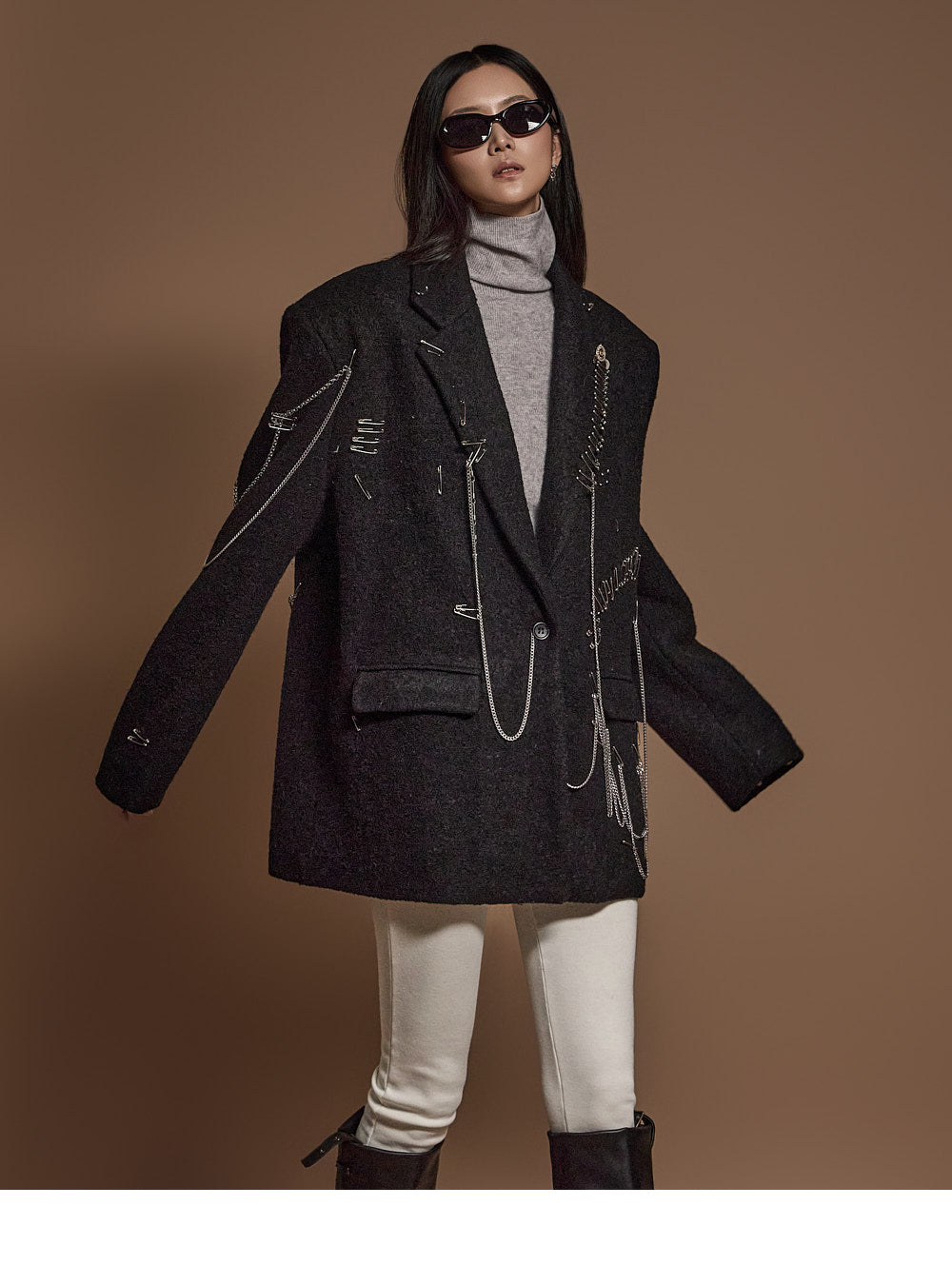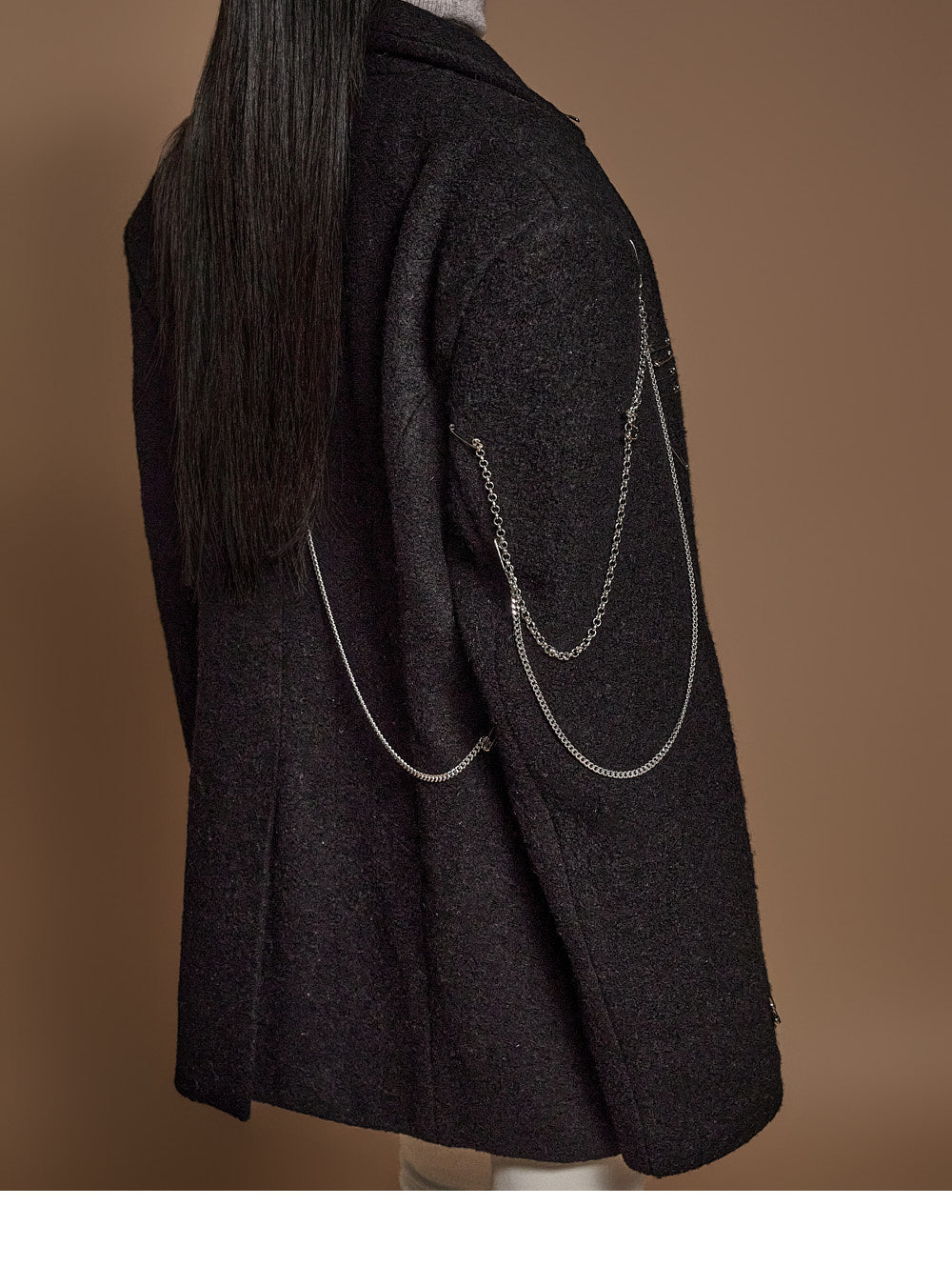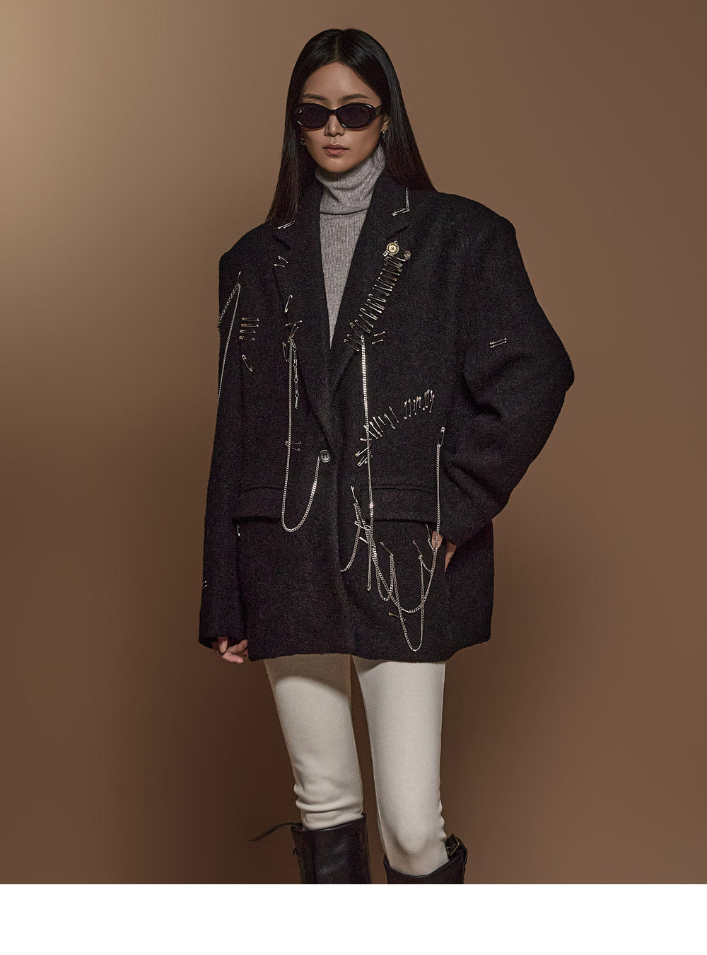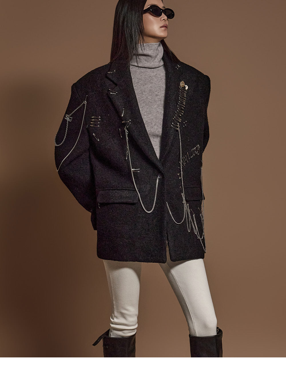 The chain and pin brooch details add a unique touch.????
