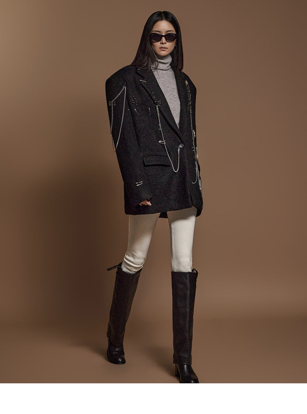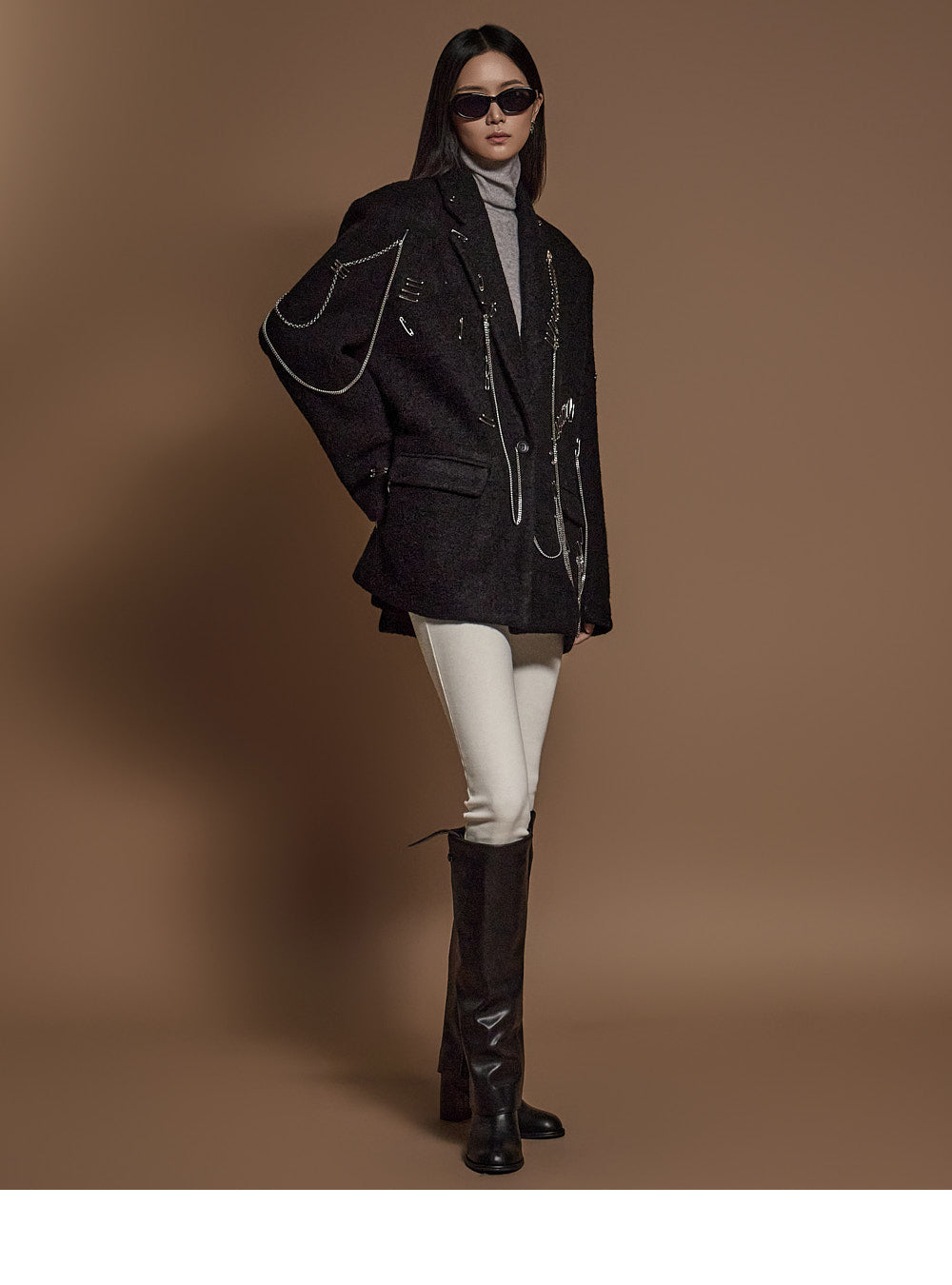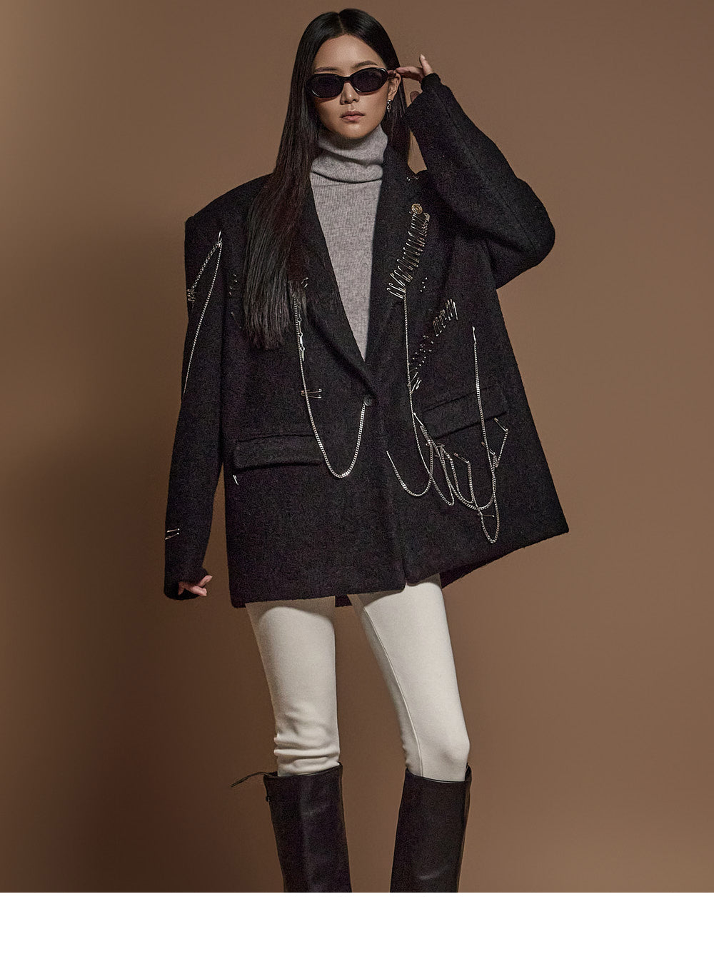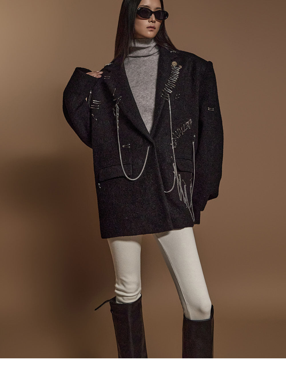 The chain and pin brooch details add a unique touch.????