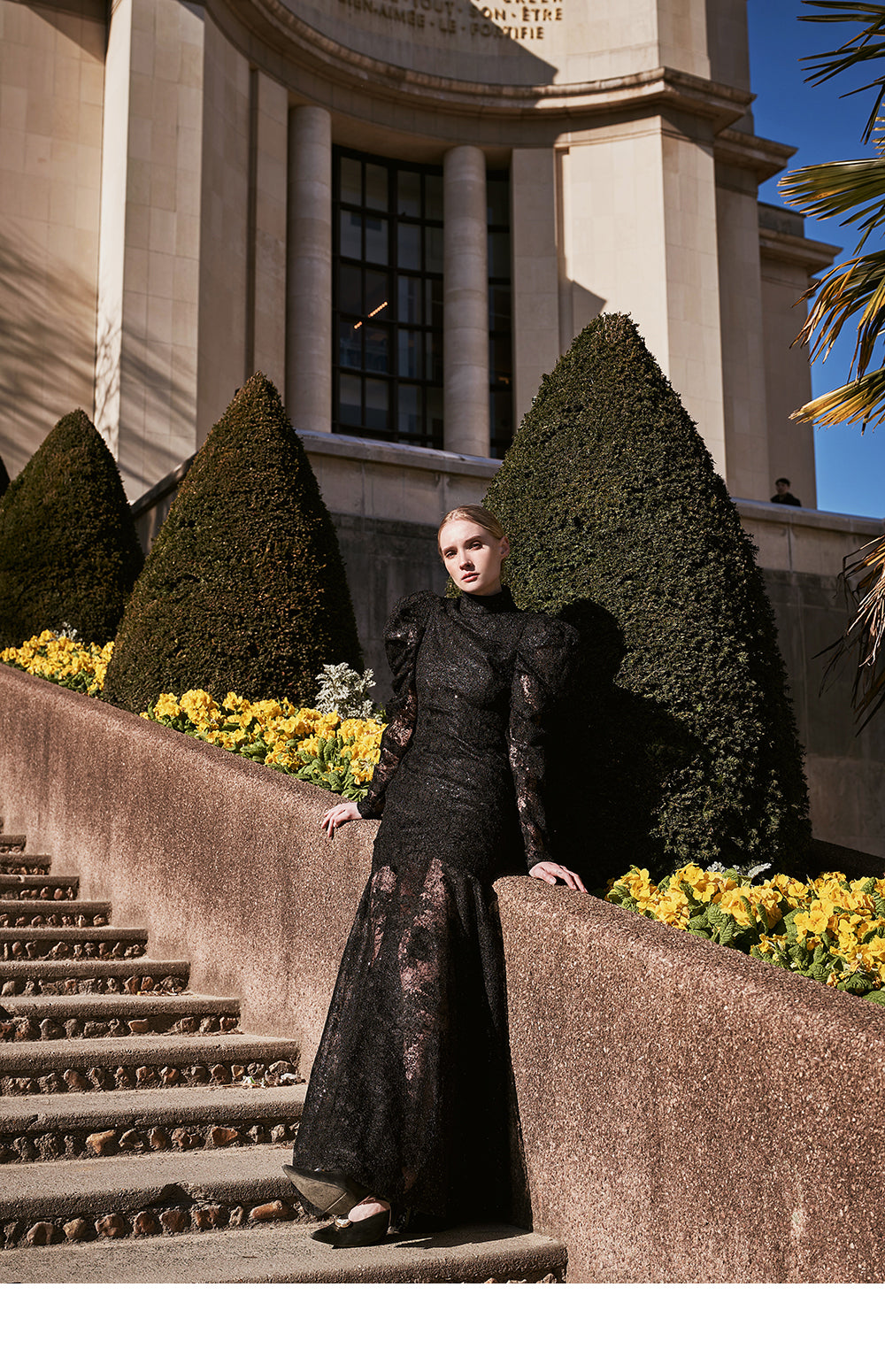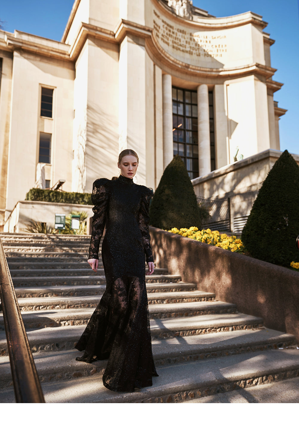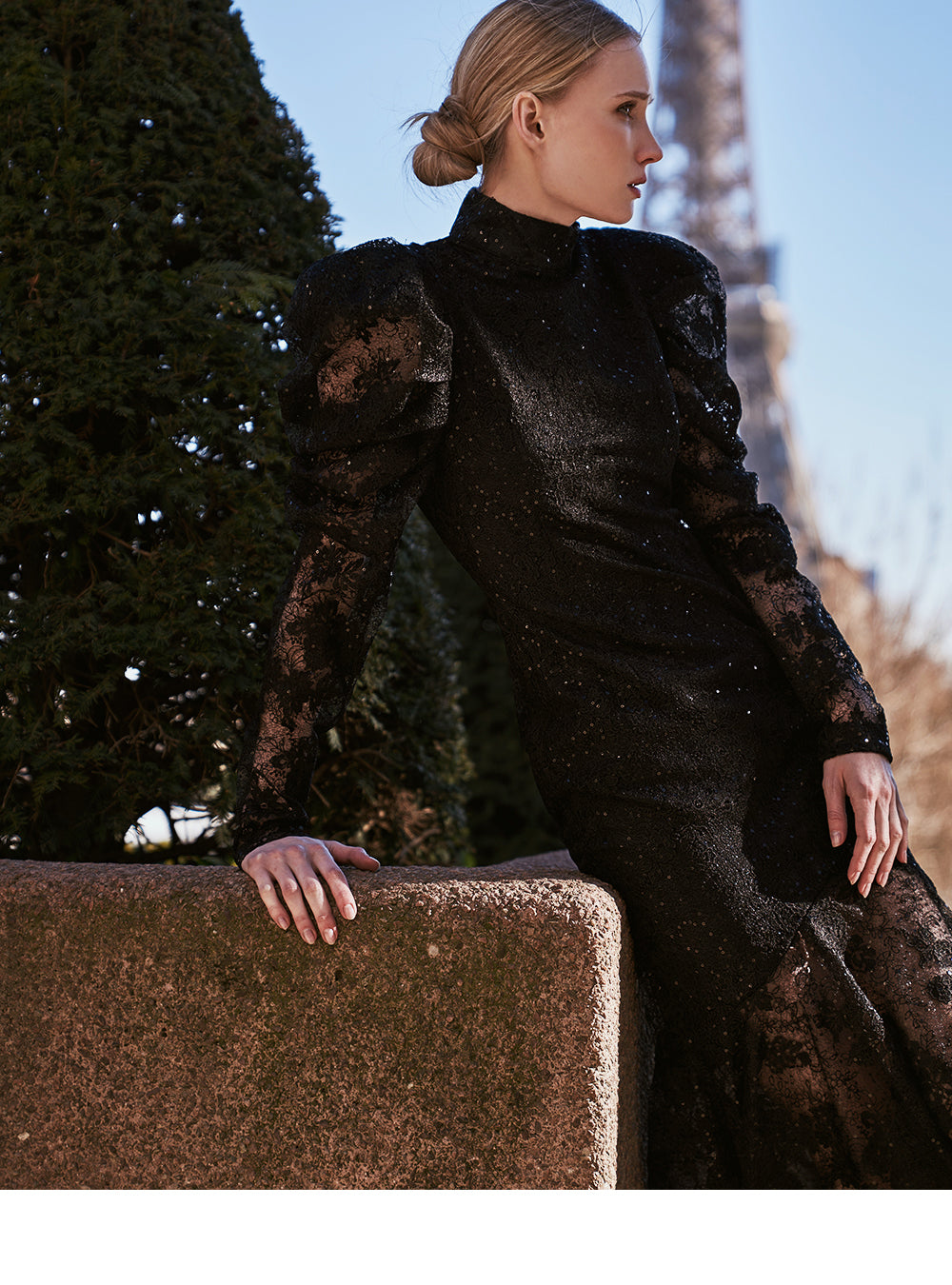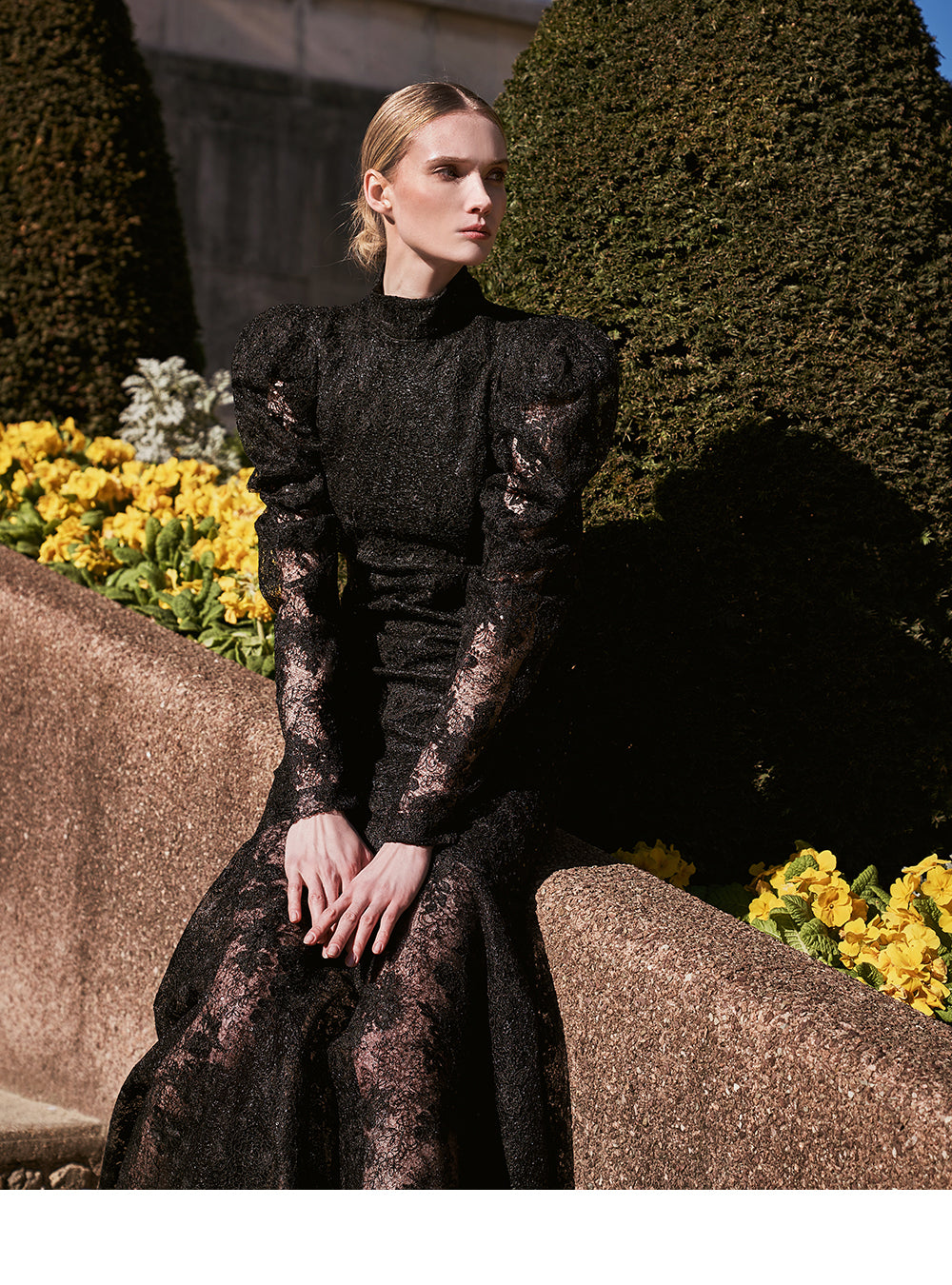 The voluminous puff on the shoulder line accentuates a stylish mood.