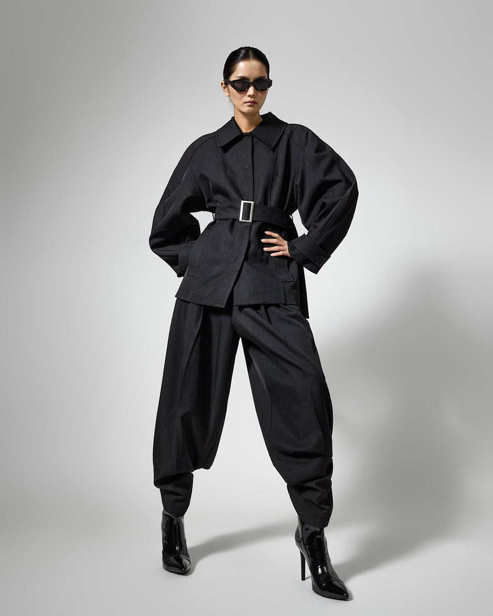These pintuck two-way slacks have a modern vibe.