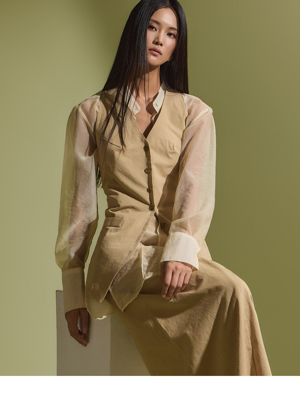 The model is 173cm tall, wearing ONE size in BEIGE color.