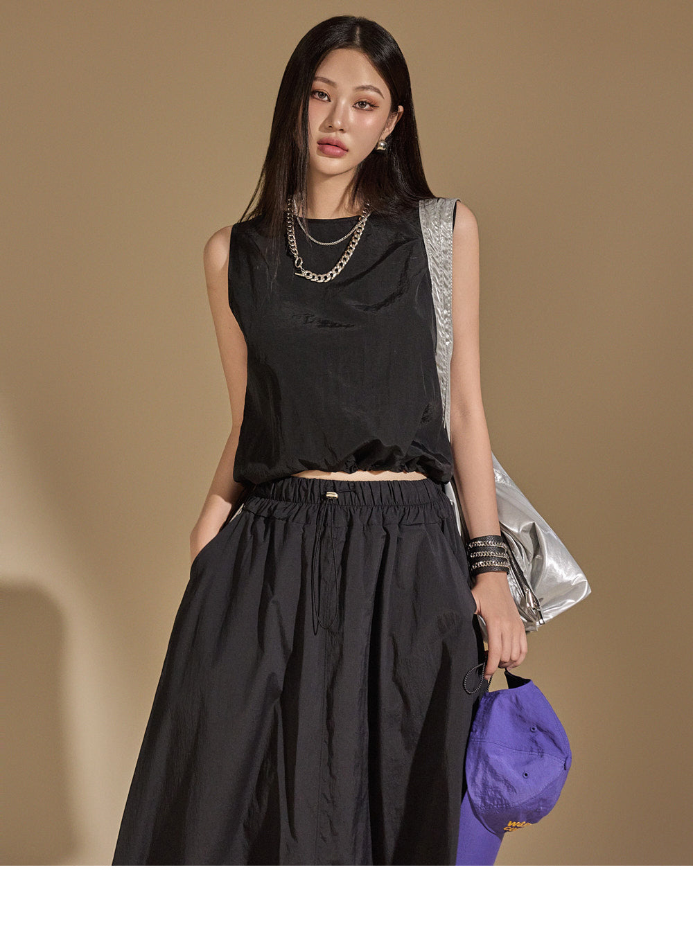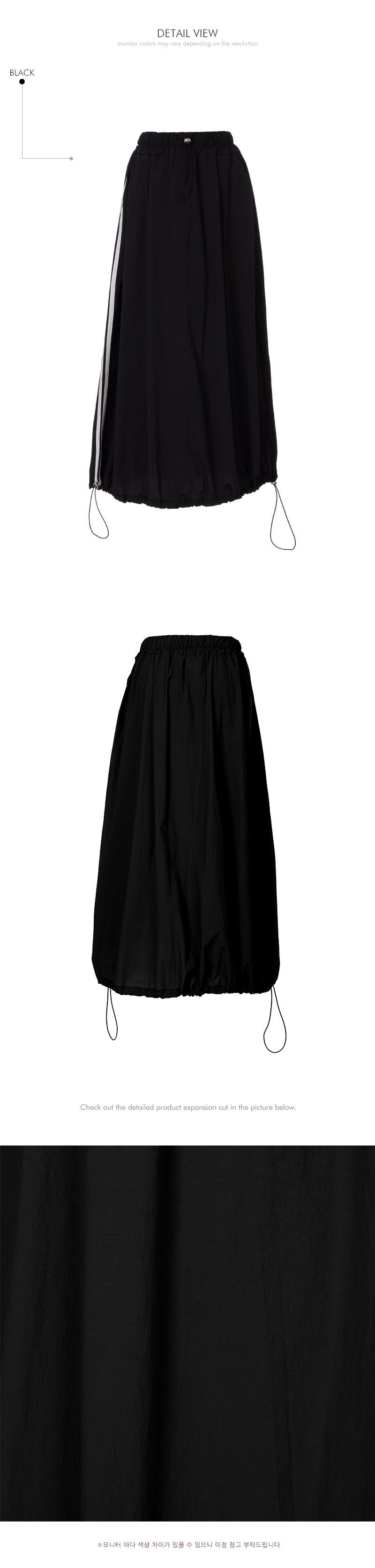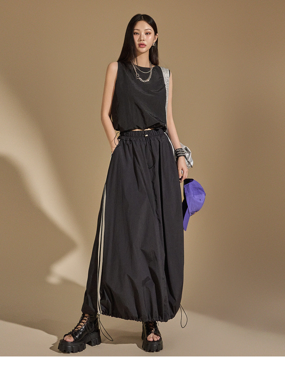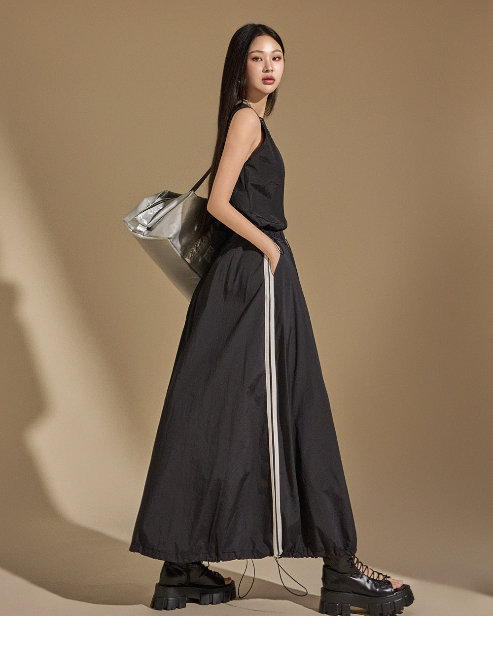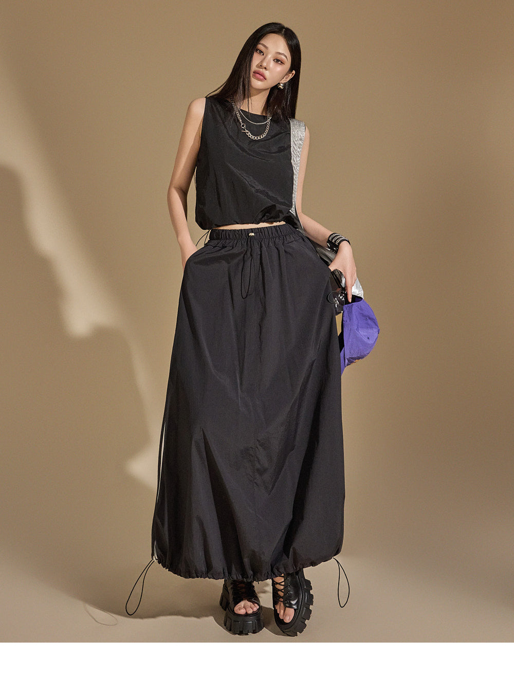 With an anorak-like texture, the skirt adds a stylish touch,