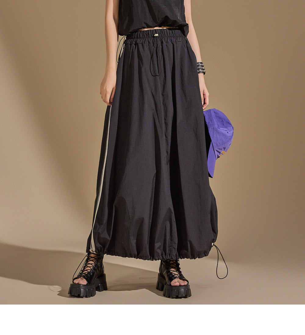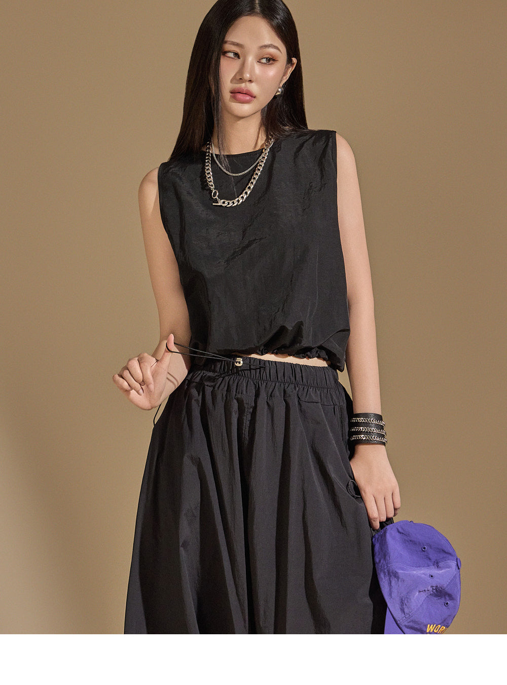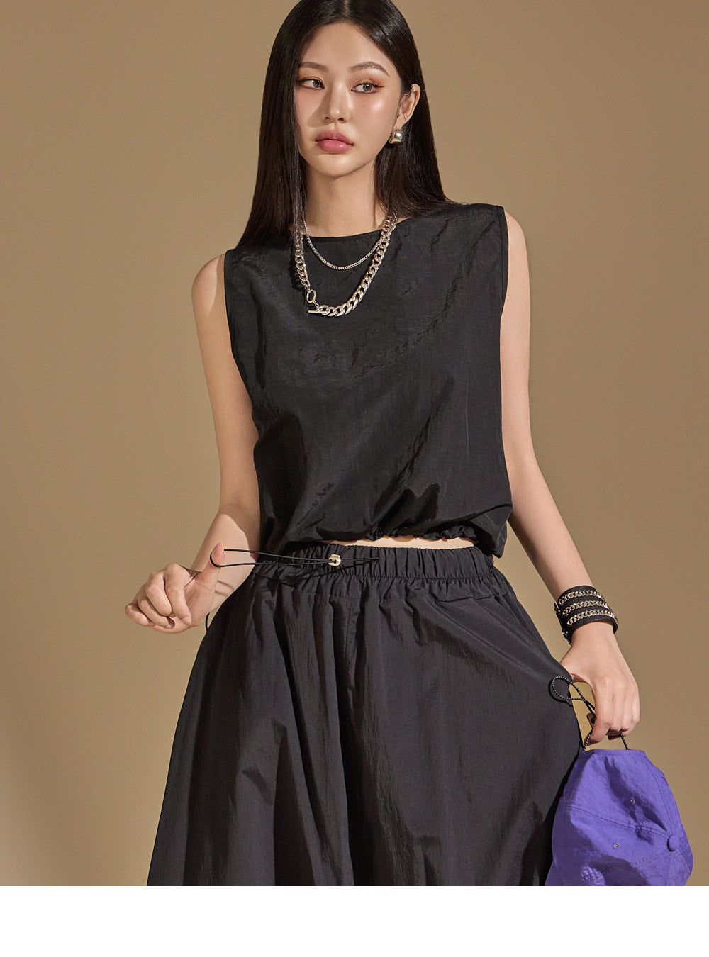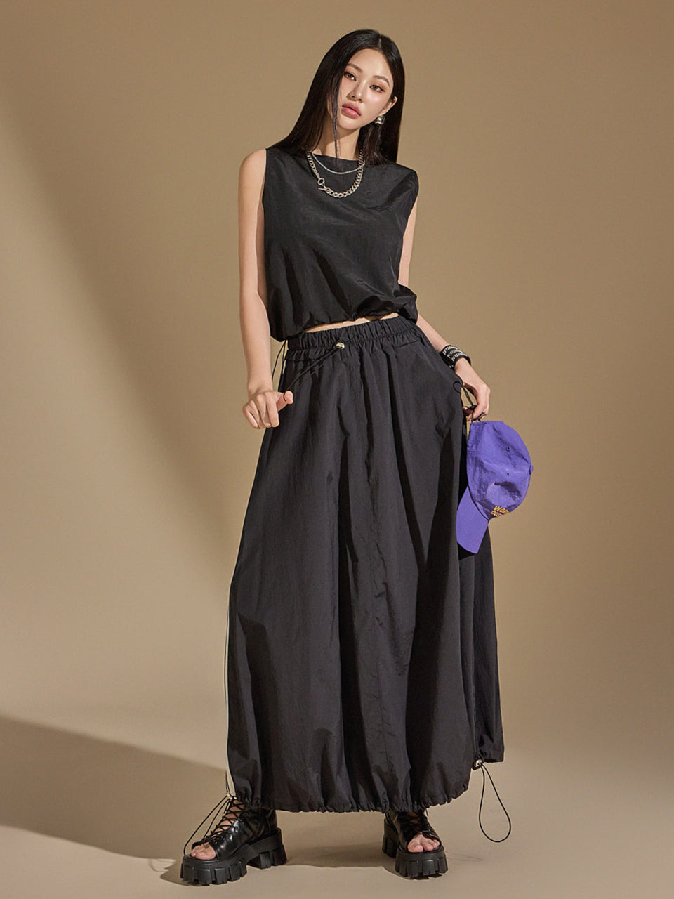 With an anorak-like texture, the skirt adds a stylish touch,